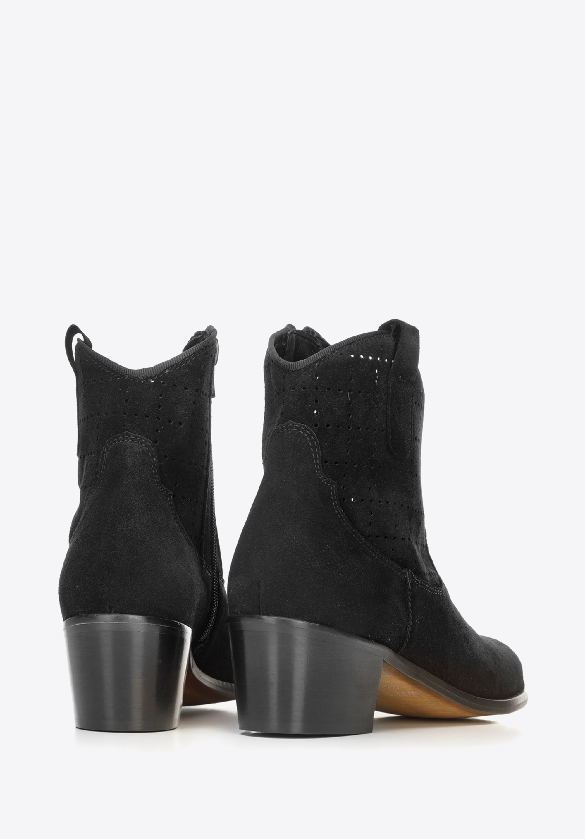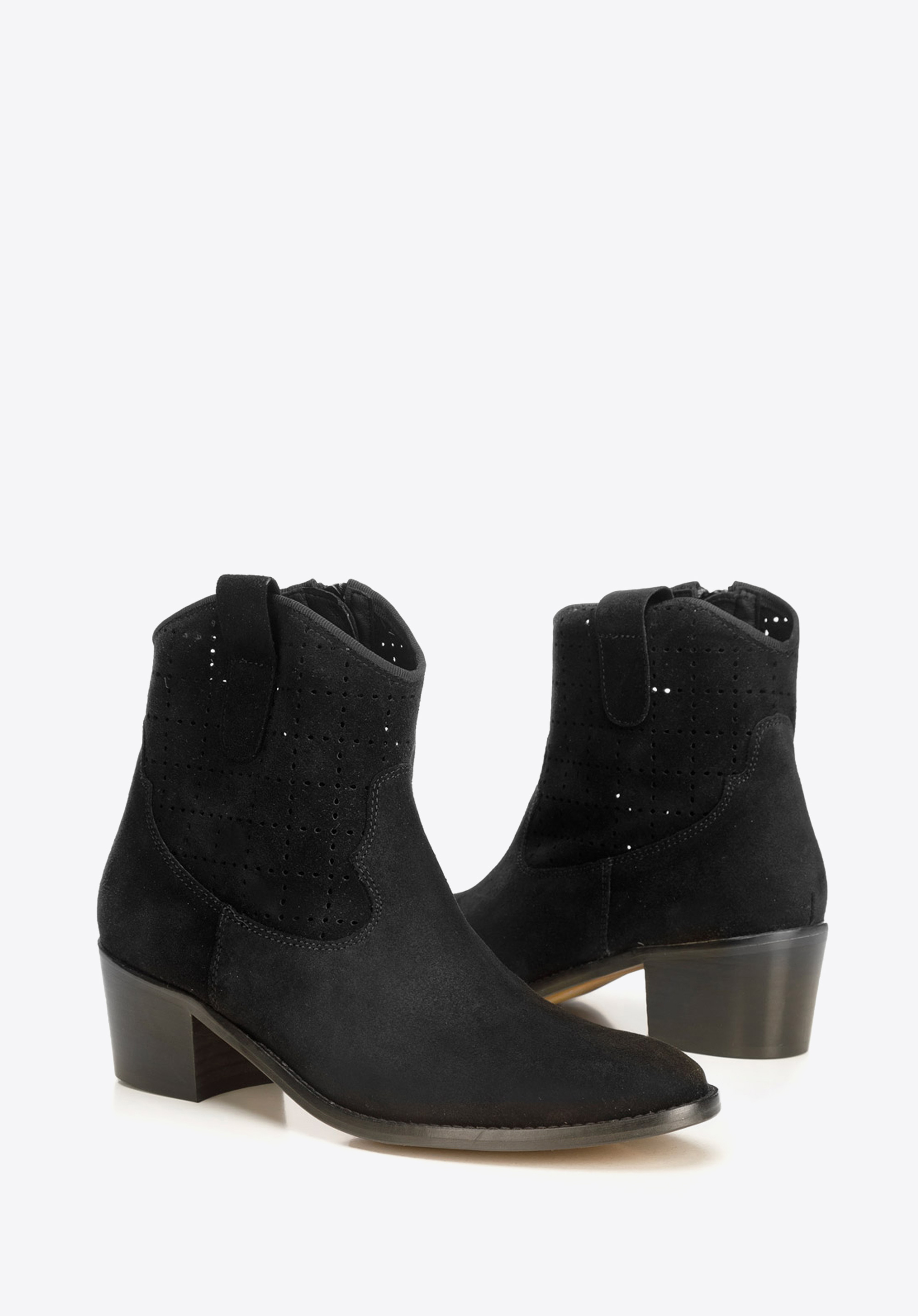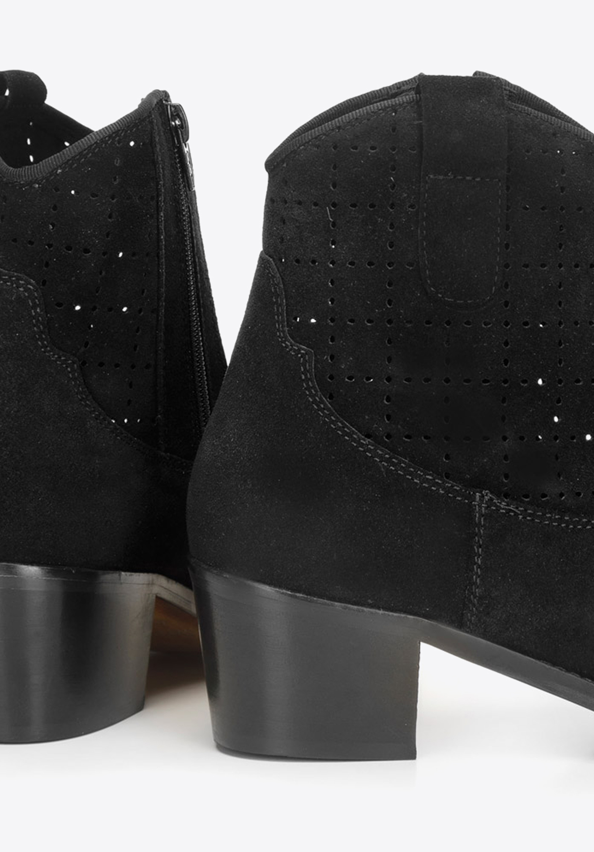 Ковбойські черевики жінки носять багато років. Хоча вони походять з робочого взуття, вони чудово вписуються в міські стилізації, наприклад, зі шкіряною курткою і короткою спідницею. Ця модель відрізняється ажурними перфораціями, які утворюють стильну клітку. Завдяки блискавці збоку надягати це взуття легко, а шкіряна устілка з м’якою підкладкою подбає про комфорт ваших ніг. Додаткова строчка на верхній частині не тільки виконує декоративну функцію, але і зміцнює структуру взуття. Ви можете носити ці ажурні замшеві ковбойські чоботи з усім.