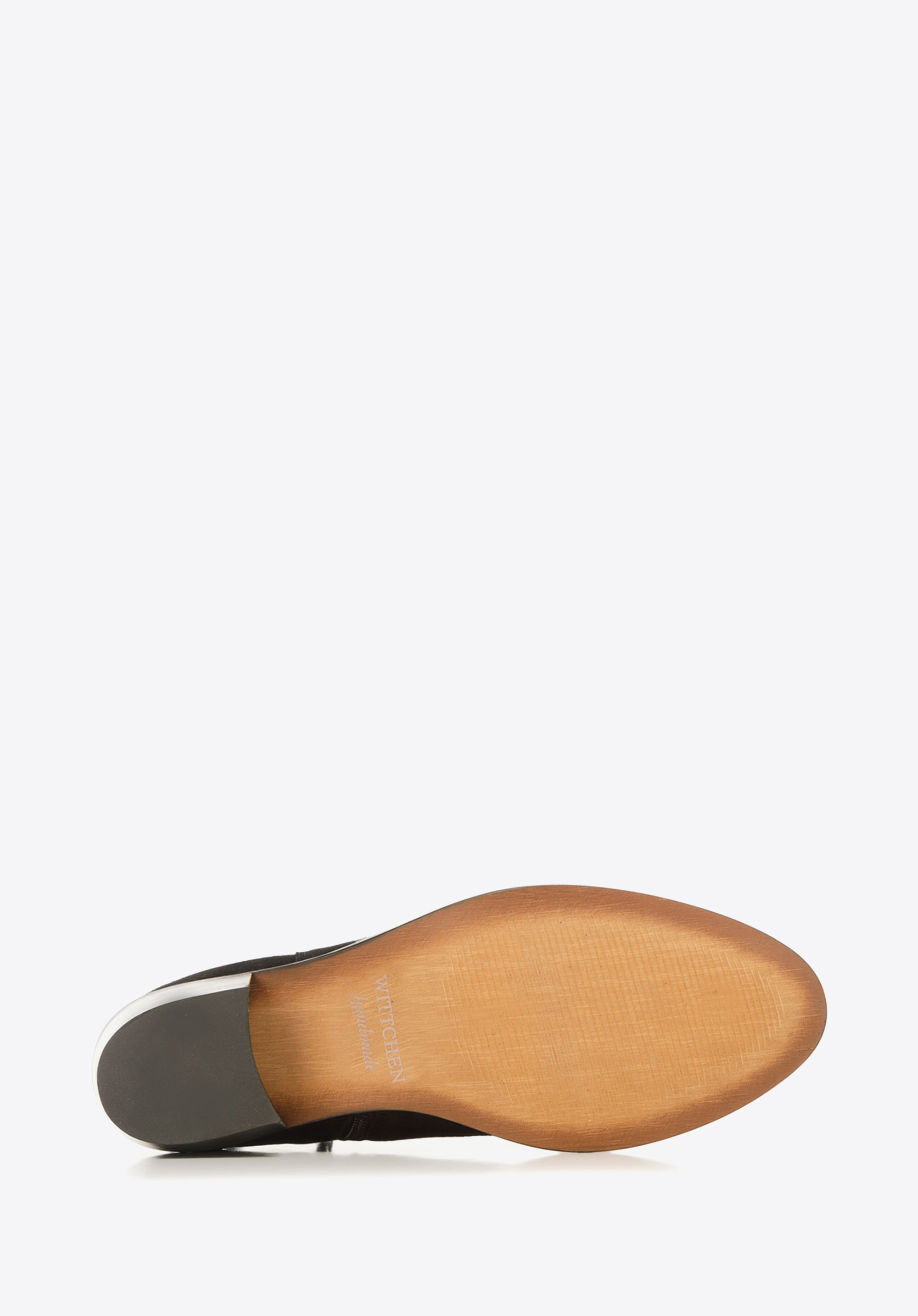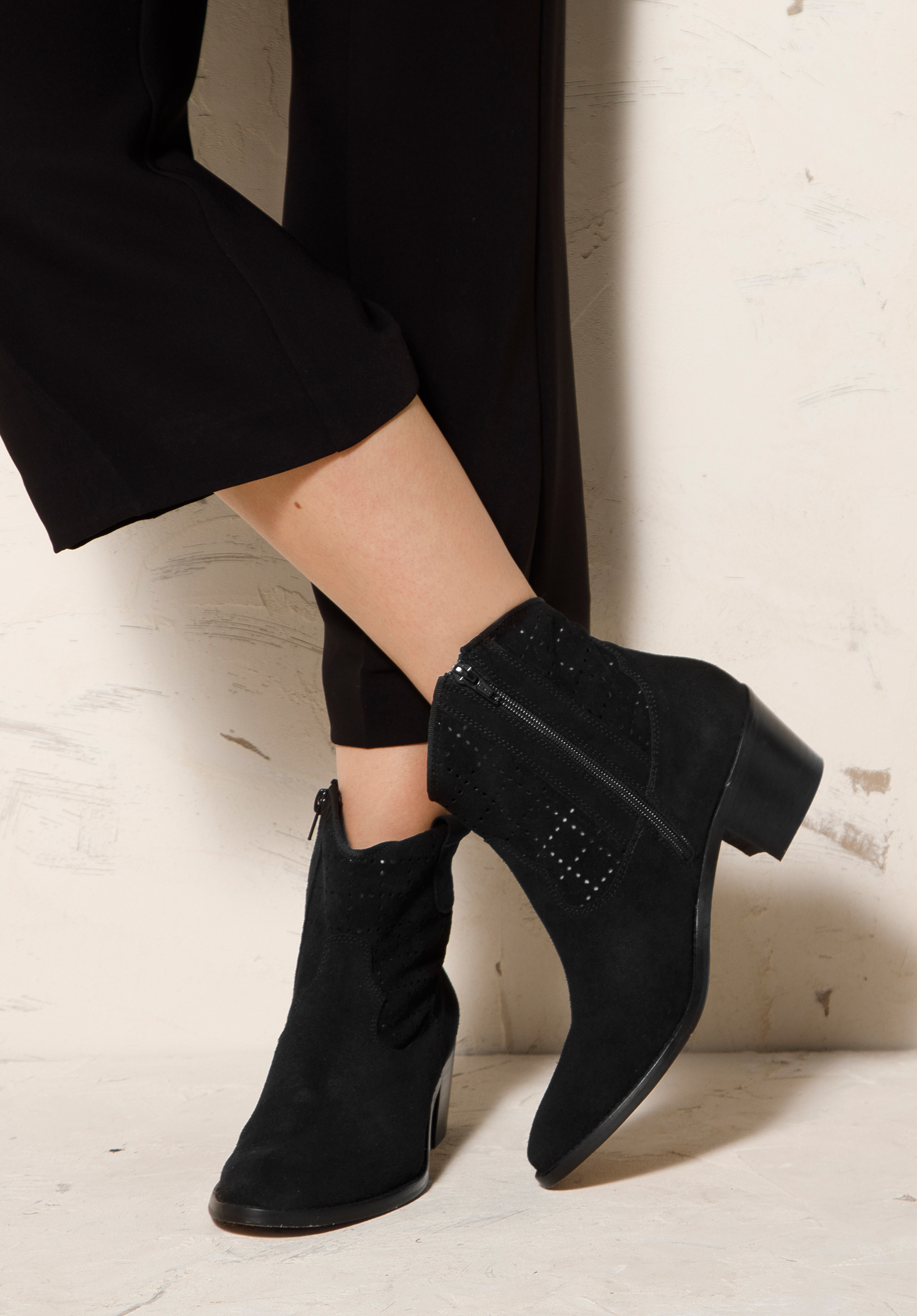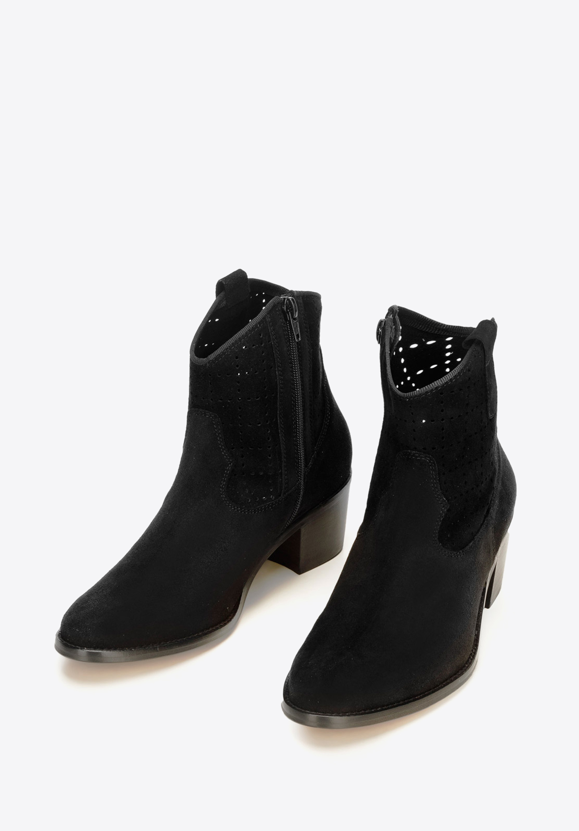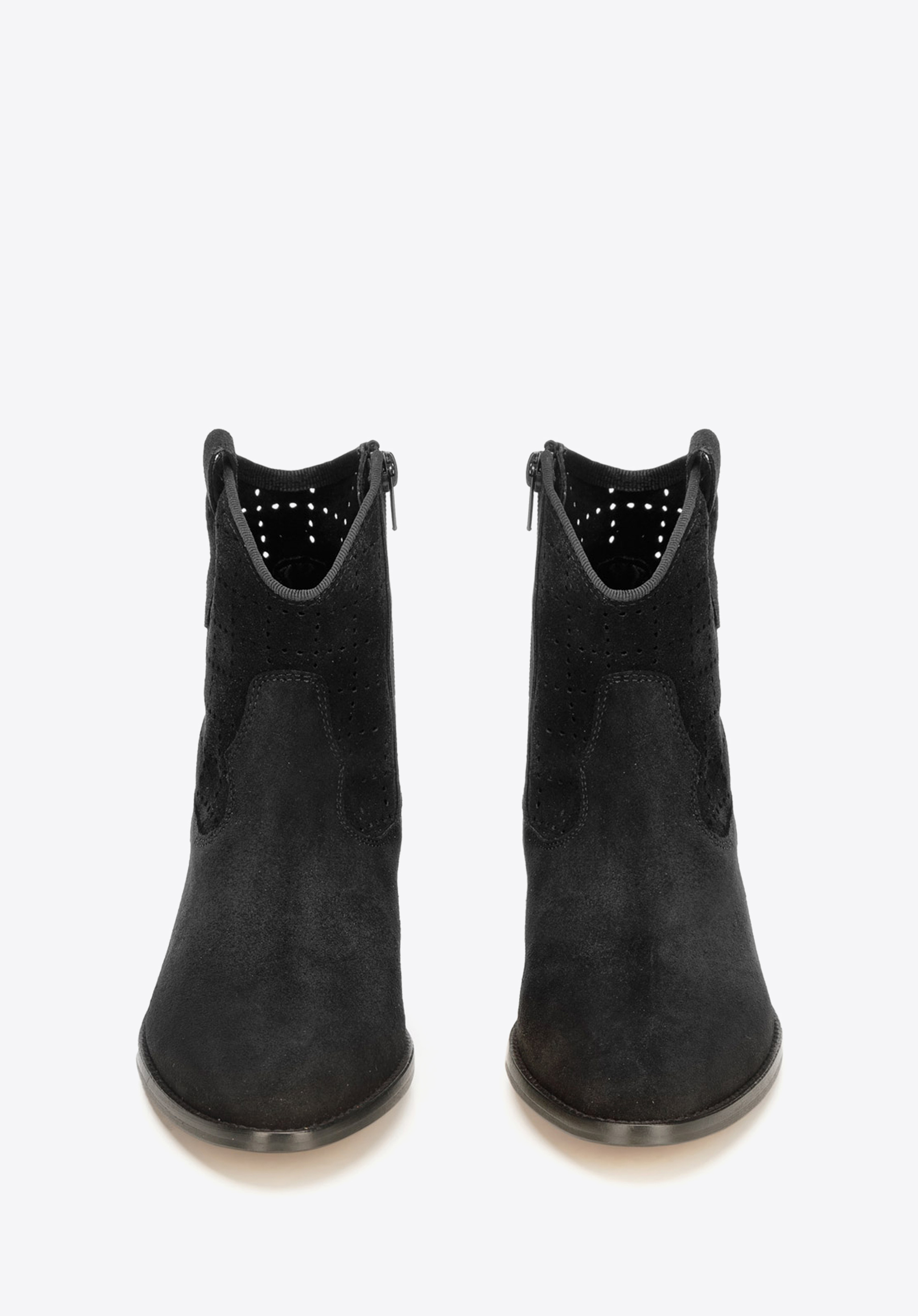 Ковбойські черевики жінки носять багато років. Хоча вони походять з робочого взуття, вони чудово вписуються в міські стилізації, наприклад, зі шкіряною курткою і короткою спідницею. Ця модель відрізняється ажурними перфораціями, які утворюють стильну клітку. Завдяки блискавці збоку надягати це взуття легко, а шкіряна устілка з м’якою підкладкою подбає про комфорт ваших ніг. Додаткова строчка на верхній частині не тільки виконує декоративну функцію, але і зміцнює структуру взуття. Ви можете носити ці ажурні замшеві ковбойські чоботи з усім.