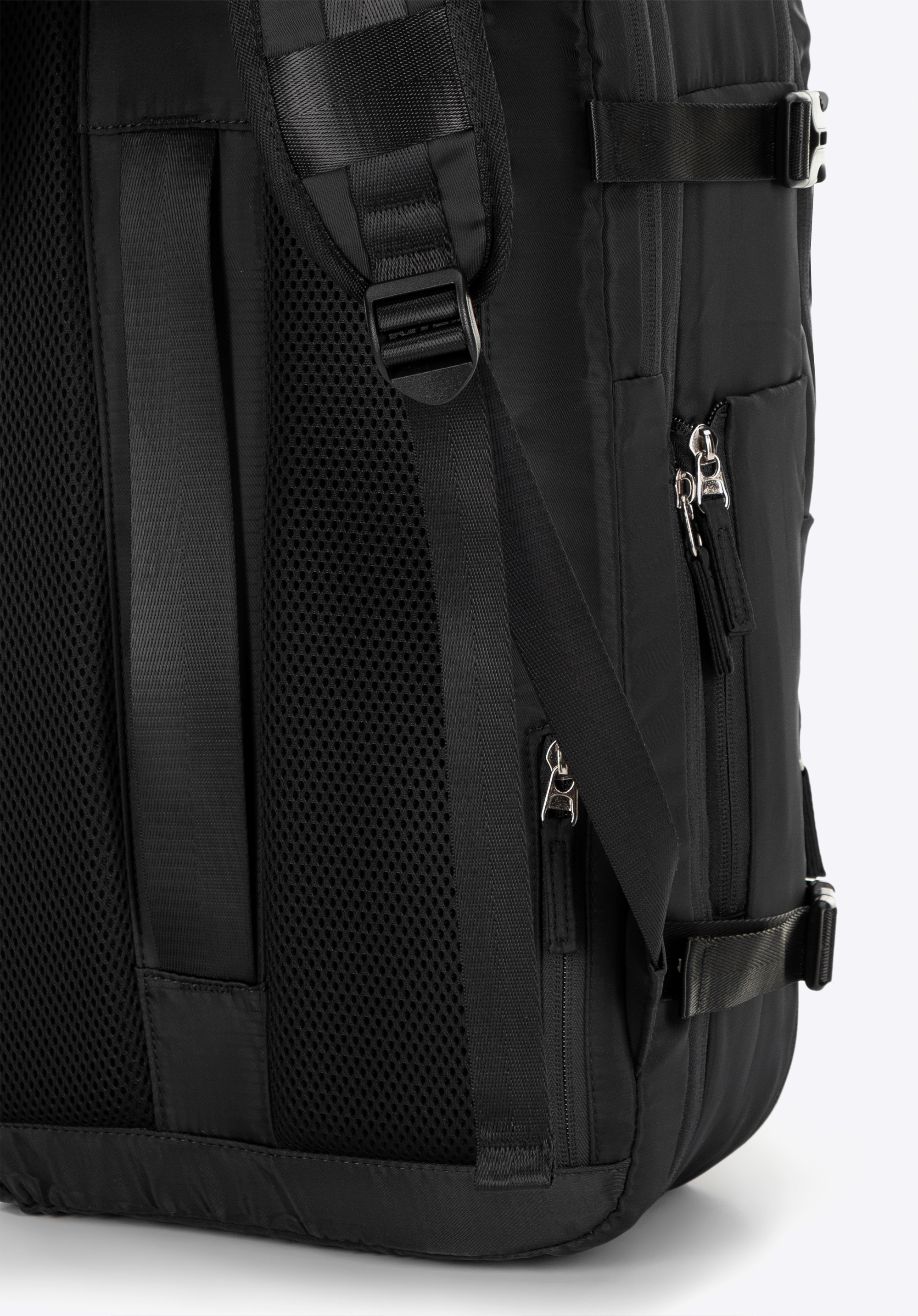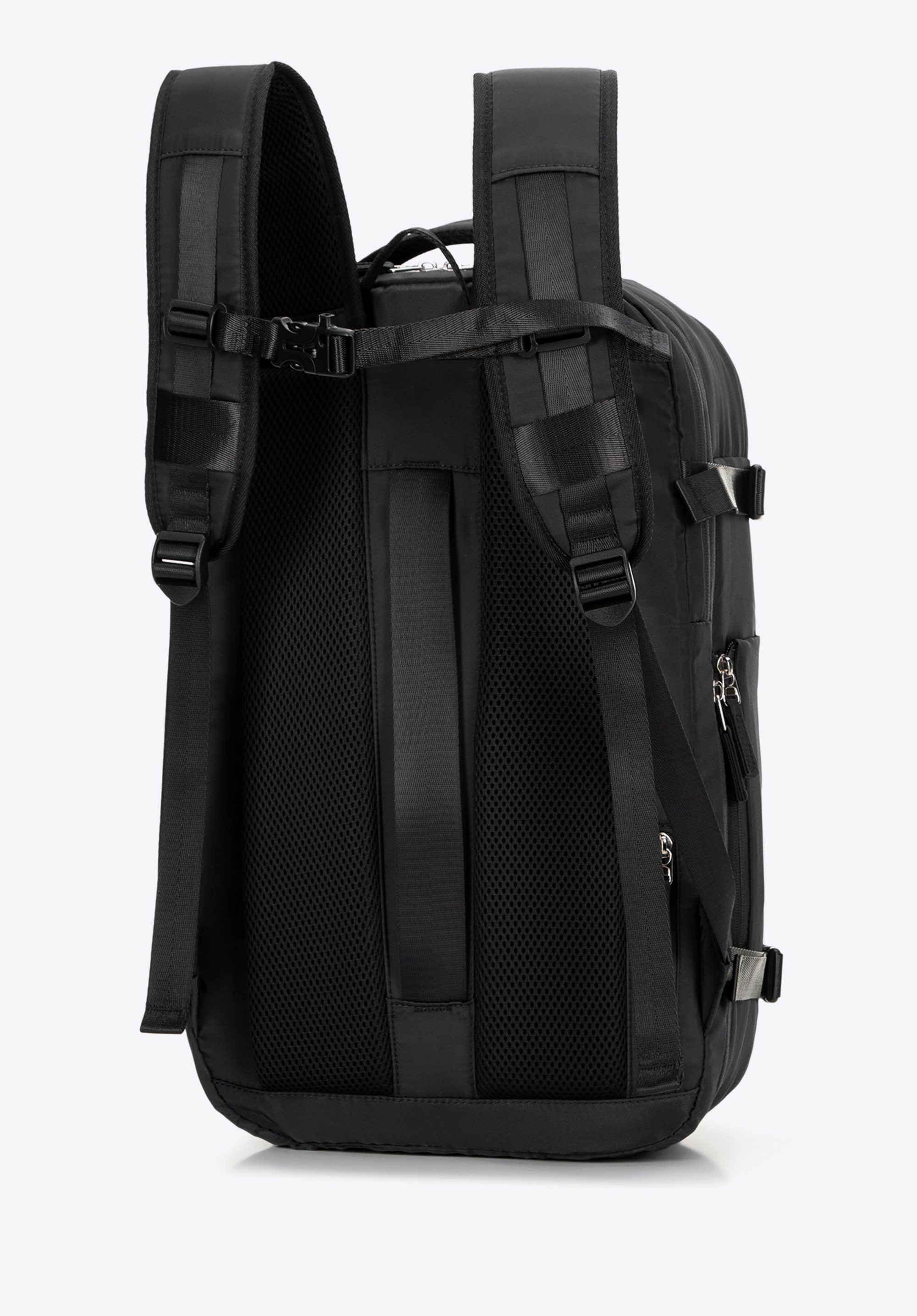 - Вертикальний ремінь на спині та кишеня на блискавці: полегшує кріплення рюкзака до великого багажу. Маленька кишенька для дрібниць (ключі, картки).