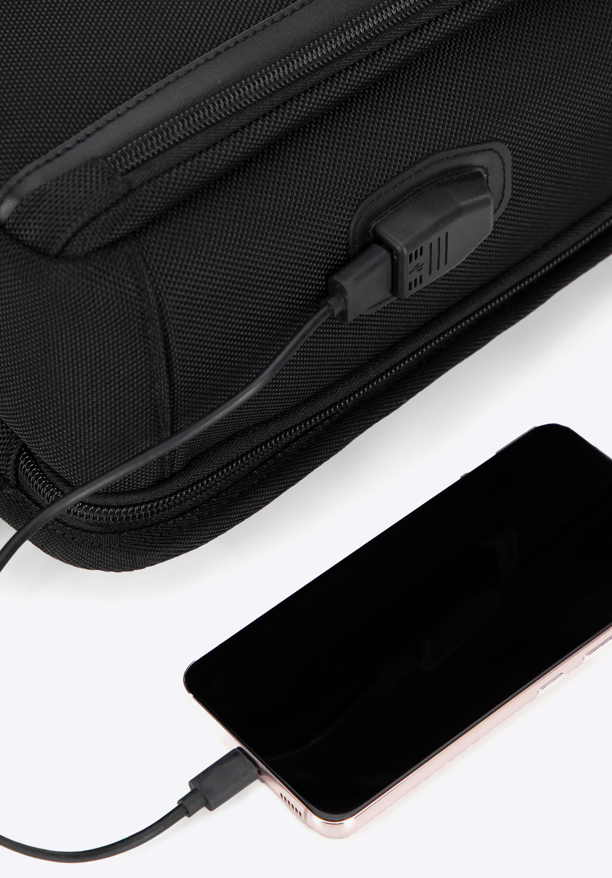- Розсувна блискавка дозволяє збільшити місткість переднього відділення, а вбудований USB-порт з кабелем дає змогу заряджати мобільні пристрої.
