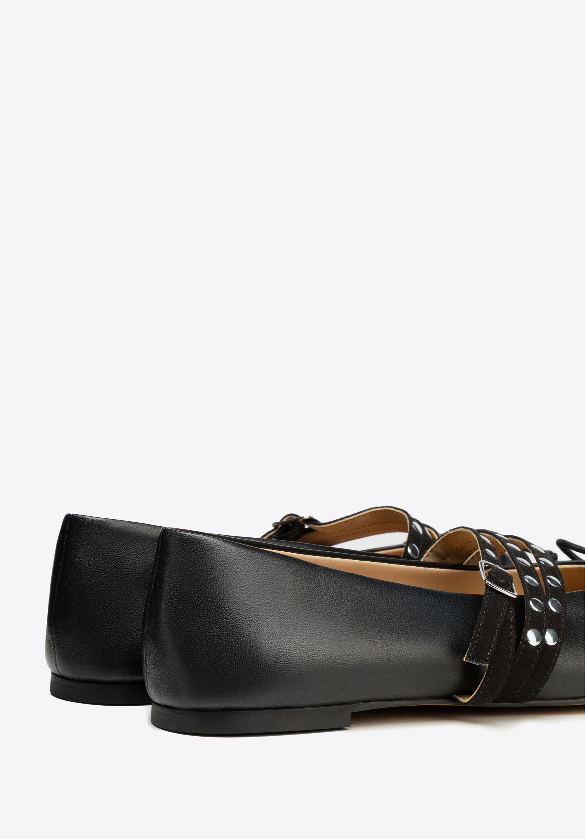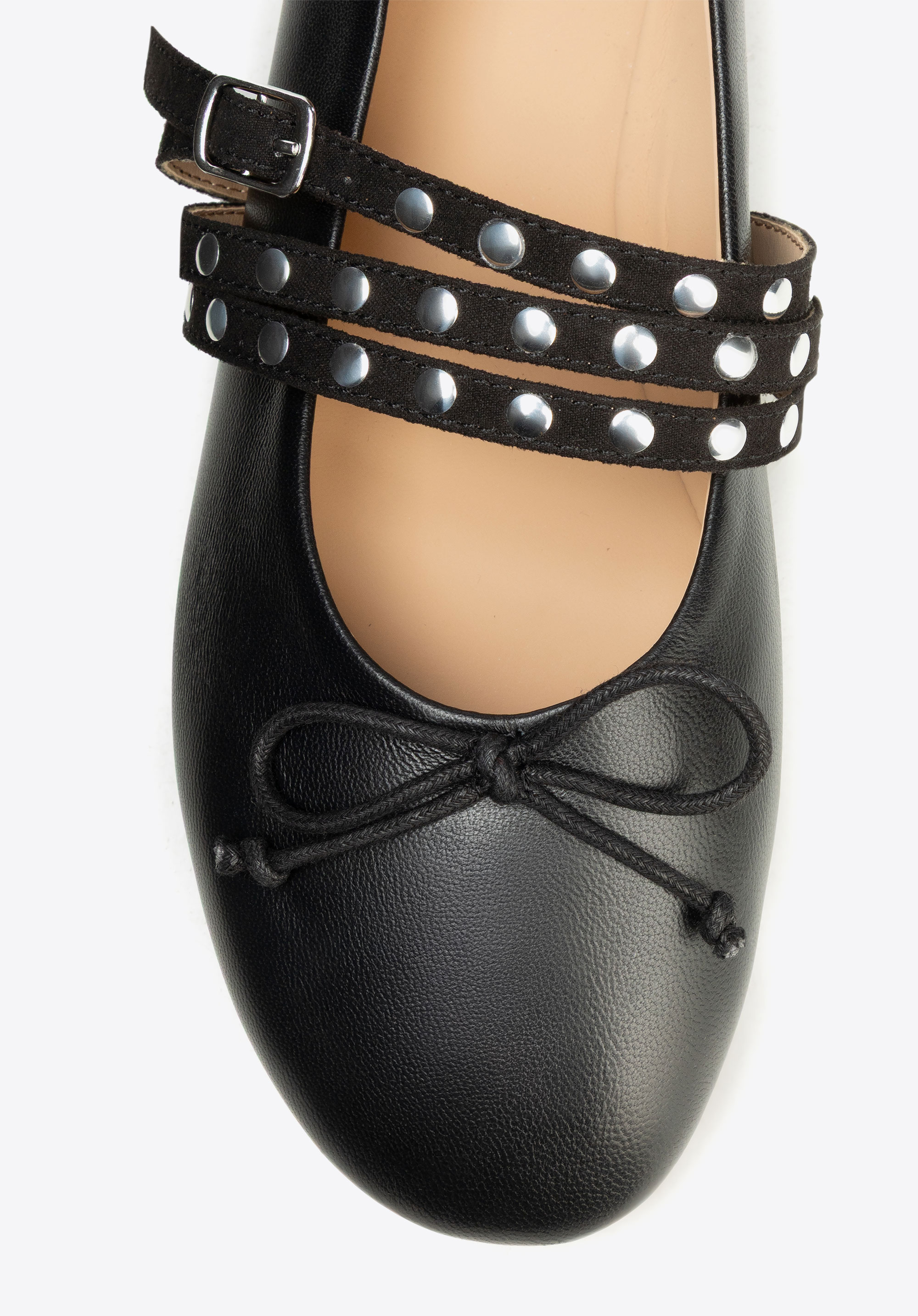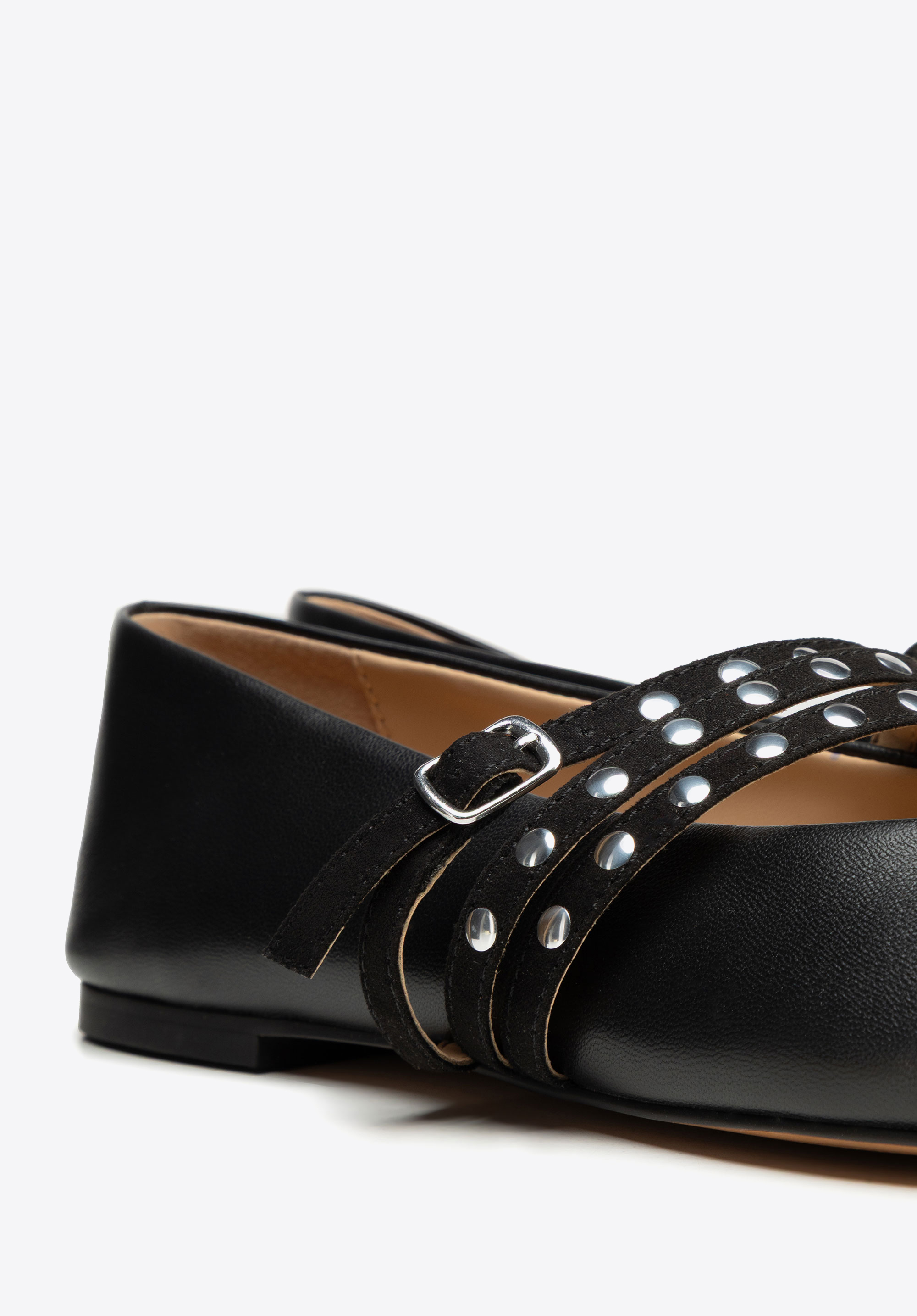 - Декоративні заклепки на ремінцях: Тонко виблискують і вносять сучасний акцент, завдяки якому балетки виглядають стильно та модно.