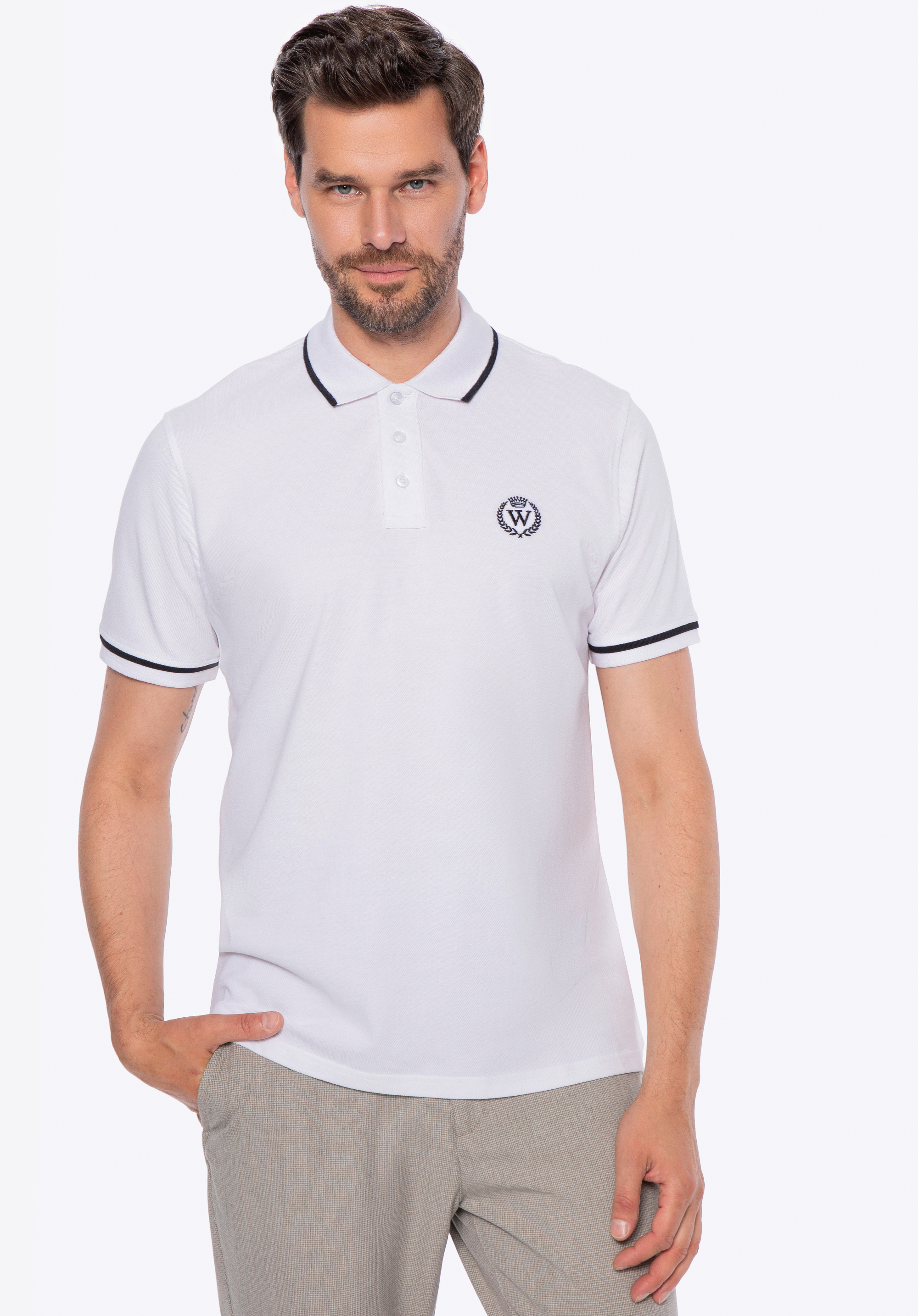 Шукаєте футболку-поло, яка підійде для будь-якої нагоди та завжди виглядатиме бездоганно? Ця чоловіча футболка-поло – це стильний компроміс між елегантністю та повсякденним комфортом. Виготовлена зі 100% бавовни, вона забезпечує повітропроникність, комфорт та ідеальну посадку для щоденного носіння – незалежно від того, чи йдете ви на роботу, зустріч з друзями чи насолоджуєтеся прогулянкою. Комір на ґудзиках та рукави оздоблені контрастною обробкою, яка надає футболці сучасного вигляду. Вишитий мотив з літерою «W», лавровим листком та короною підкреслює увагу до деталей, а подвійний шов по краю забезпечує довговічність та бездоганний силует з часом.