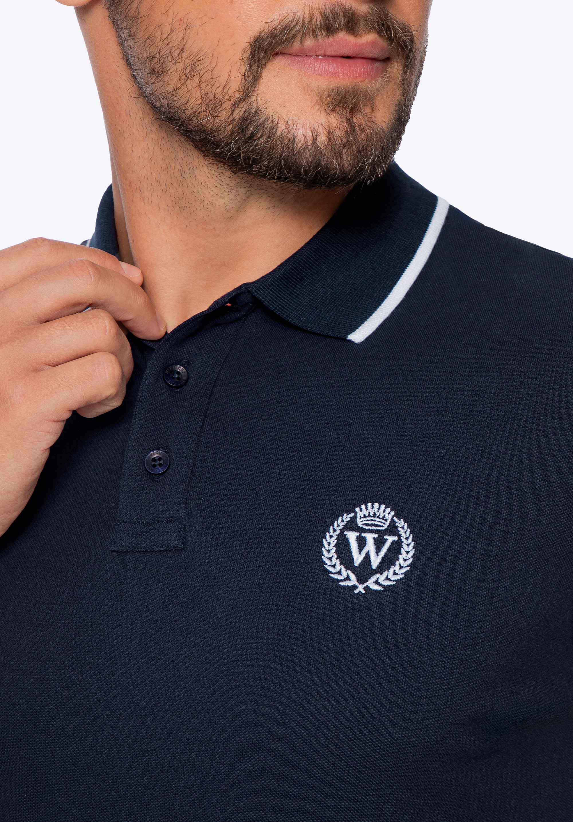 Шукаєте футболку-поло, яка підійде для будь-якої нагоди та завжди виглядатиме бездоганно? Ця чоловіча футболка-поло – це стильний компроміс між елегантністю та повсякденним комфортом. Виготовлена зі 100% бавовни, вона забезпечує повітропроникність, комфорт та ідеальну посадку для щоденного носіння – незалежно від того, чи йдете ви на роботу, зустріч з друзями чи насолоджуєтеся прогулянкою. Комір на ґудзиках та рукави оздоблені контрастною обробкою, яка надає футболці сучасного вигляду. Вишитий мотив з літерою «W», лавровим листком та короною підкреслює увагу до деталей, а подвійний шов по краю забезпечує довговічність та бездоганний силует з часом.