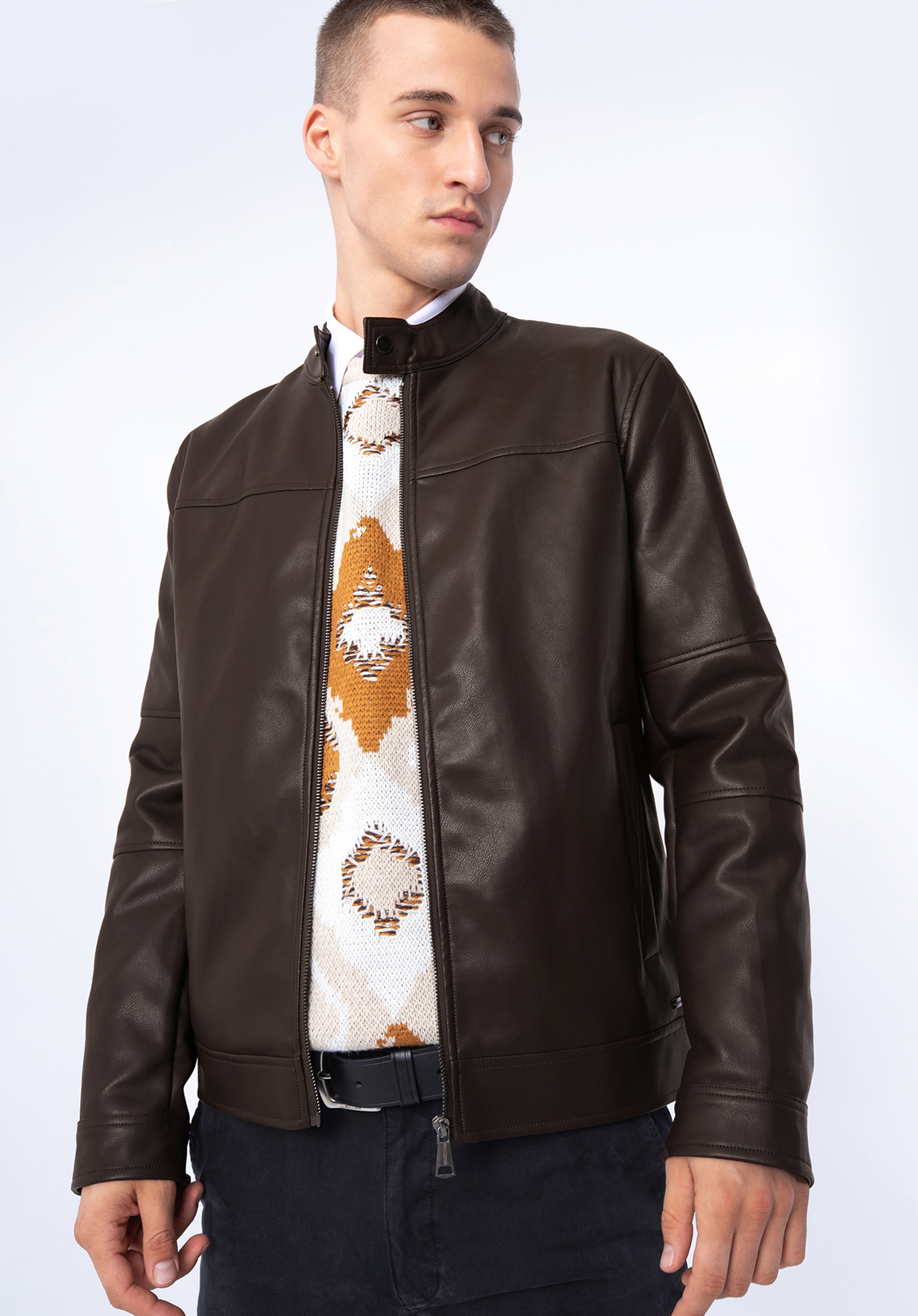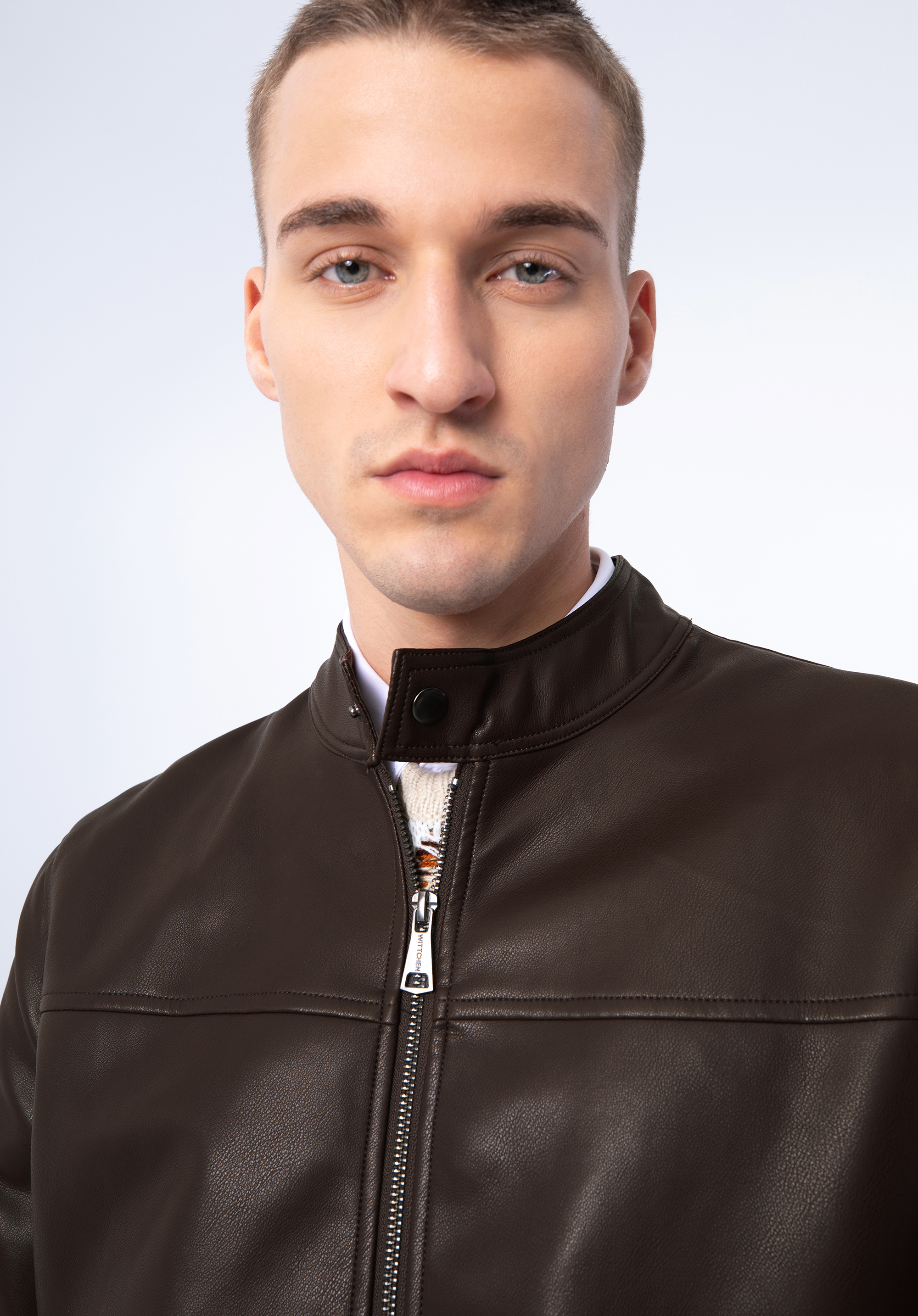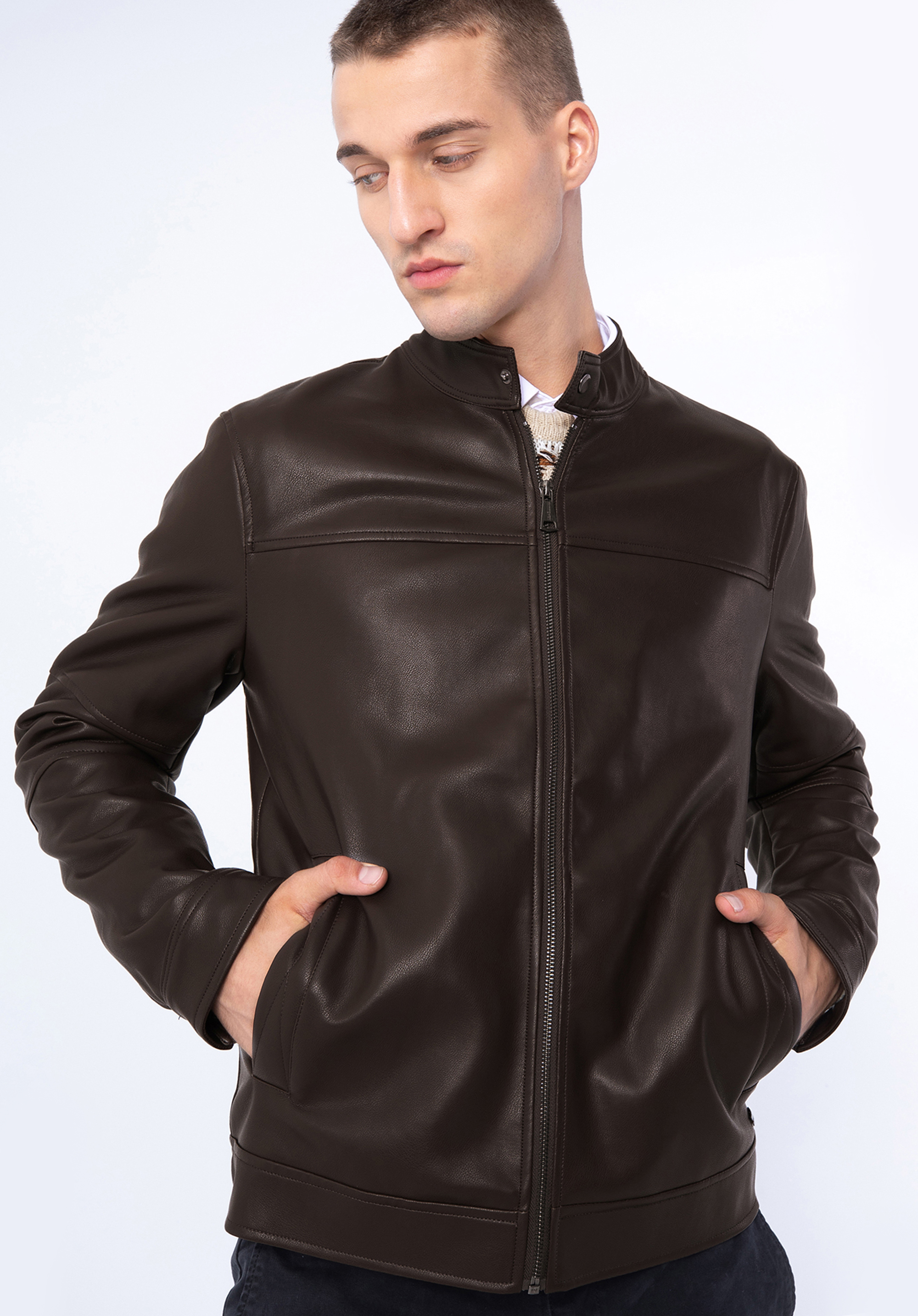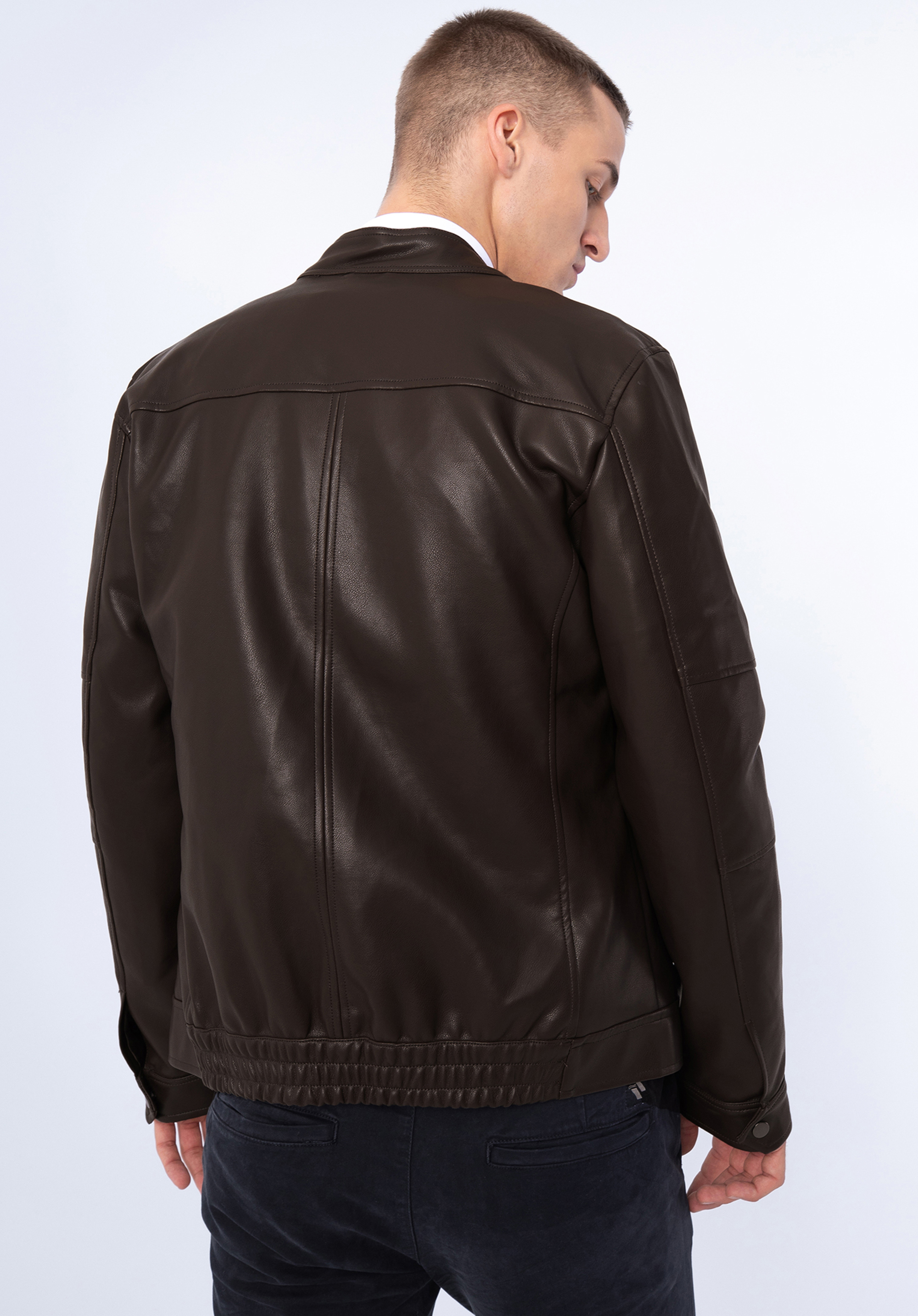 Ця вічна куртка - чудовий вибір для повсякденного носіння. Спинка куртки оброблена шнурком, завдяки чому вона ідеально сидітиме по фігурі. Дана модель виготовлена з приємної на дотик екошкіри. Вона стильно доповнить улюблені джинси та кросівки, а також напівофіційні стилі. Носити чоловічу куртку з екошкіри з декоративно обробленими кишенями можна щодня навесні і восени.