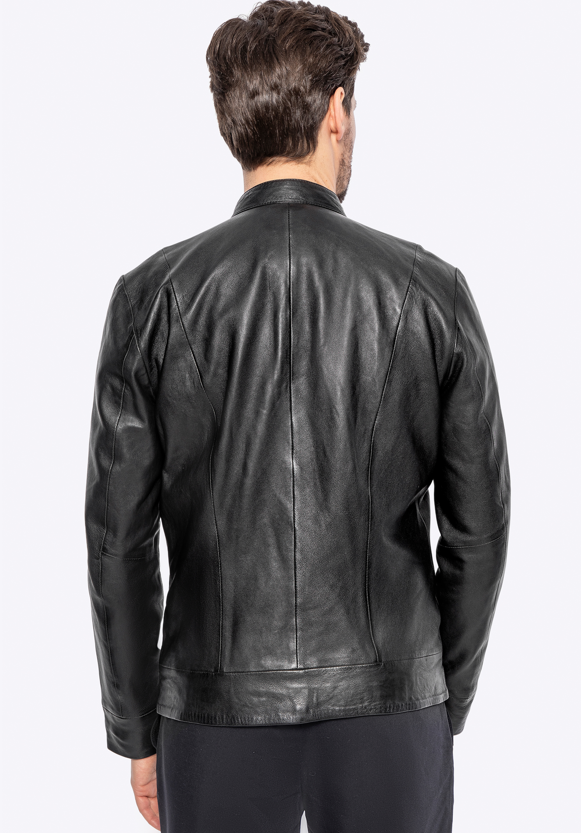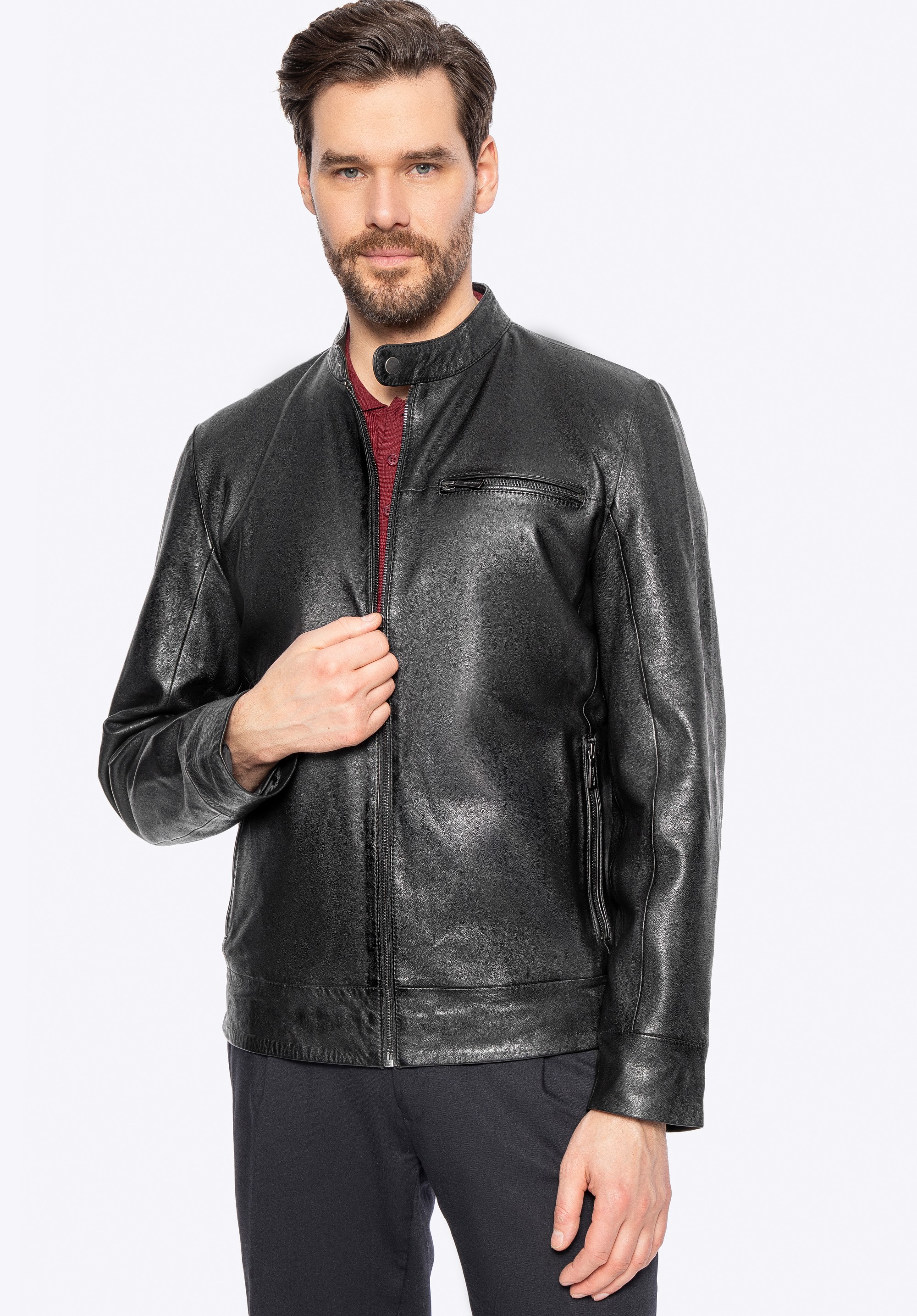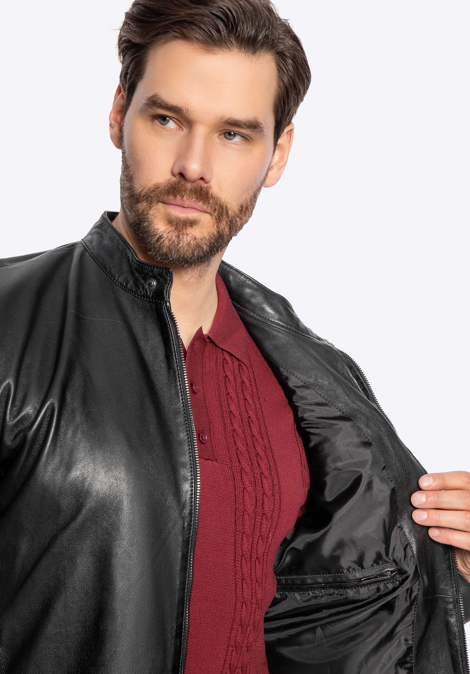 Відчуйте себе особливим щодня з чоловічою курткою, яка поєднує позачасовий стиль із найвищою якістю виконання. Виготовлена з натуральної овечої шкіри, м’якої на дотик і водночас надзвичайно міцної, ця куртка є синонімом розкоші та функціональності. Застібка на блискавку та комір-стійка на кнопці забезпечують захист від холоду, а сучасний, приталений крій додає впевненості та стильного вигляду.