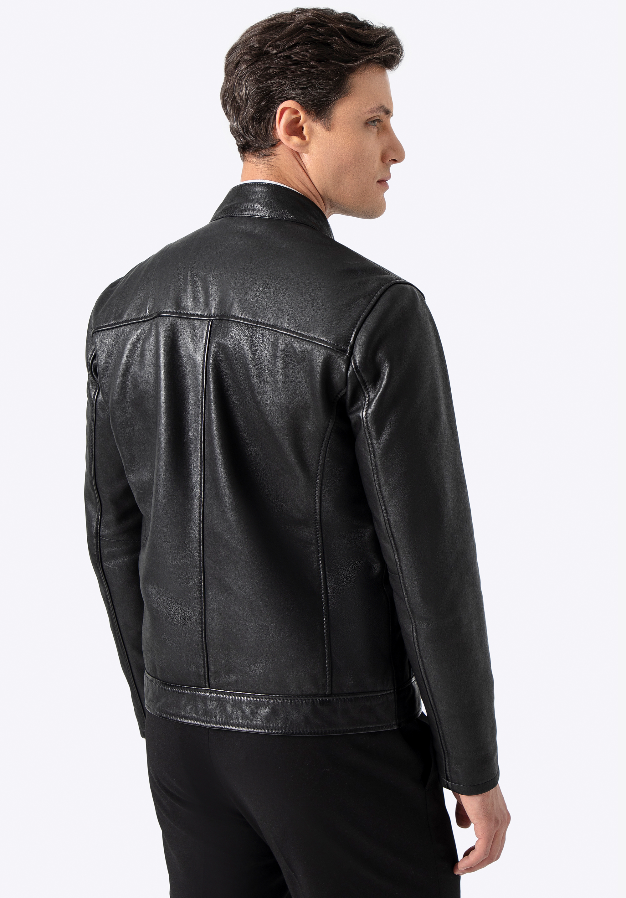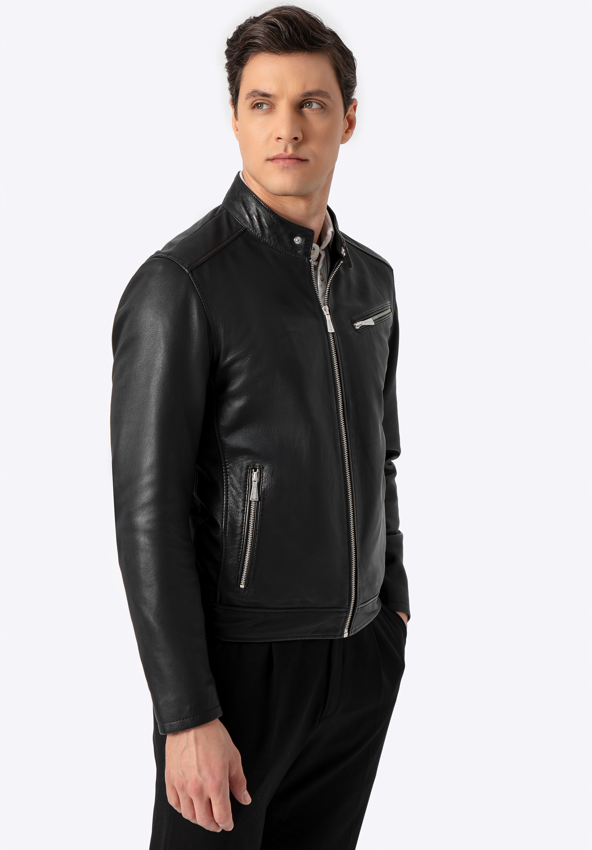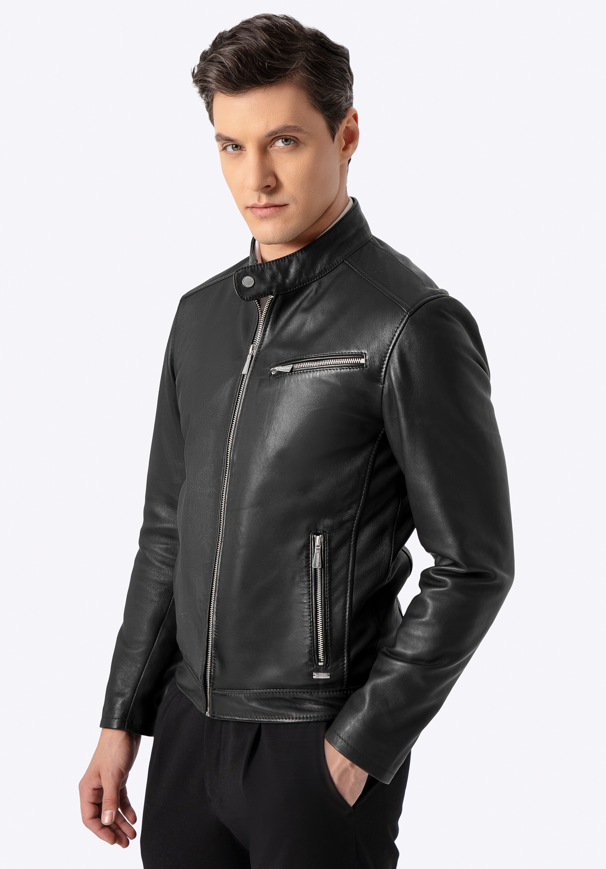Ця модель не просто куртка – це заява про стиль. Виготовлена з високоякісної натуральної овечої шкіри, вона привертає увагу не тільки ідеальним кроєм, але й досконалими деталями. Металеве логотип виробника, дискретно розміщене збоку, додає характеру, а блискавки з логотипом підкреслюють розкішний вигляд. Куртка застібається на міцну металеву блискавку, а комір-стійка з застібкою надає їй сучасного байкерського шарму.