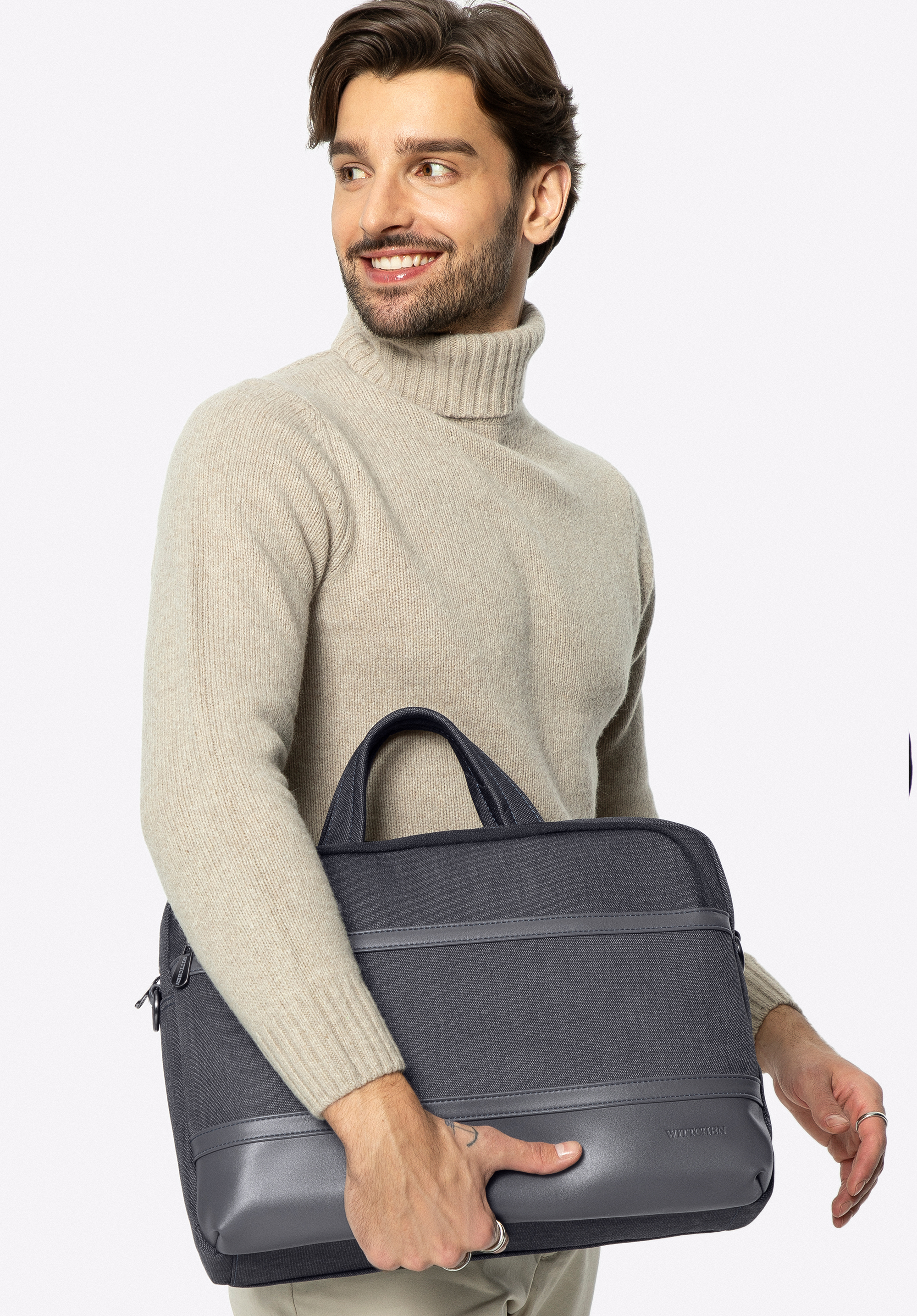 Велика сумка для ноутбука з елегантною обробкою з екошкіри завершить ваш діловий образ. Це незамінний чоловічий аксесуар для роботи, але і не тільки. Ви можете зручно носити її в руці з товстими ручками або повісити через плече на прикріпленому ремені. Спереду і ззаду є дві практичні кишені на блискавці. В одній з них захована додаткова ручка - ви зачепите її за ручку валізи. Всередині є окрема м''яка кишеня для ноутбука розміром 15,6 дюйма або менше, а також дві кишені. Крім комп''ютерного обладнання, ви також помістіть документи і блокноти формату A4 всередину. Ця чоловіча сумка для ноутбука з панеллю з екошкіри має класичний простий дизайн, який відмінно підійде для повсякденного носіння.