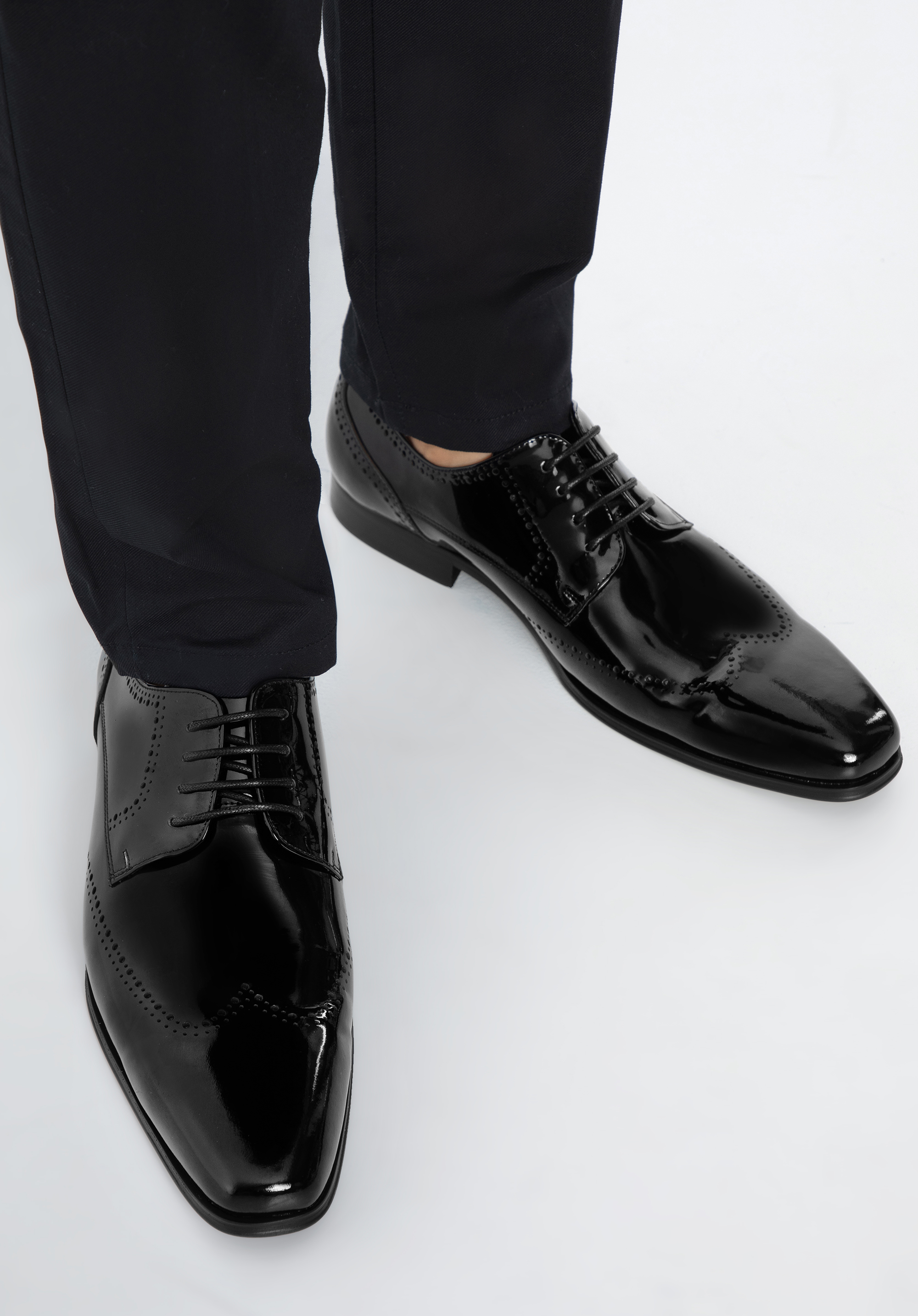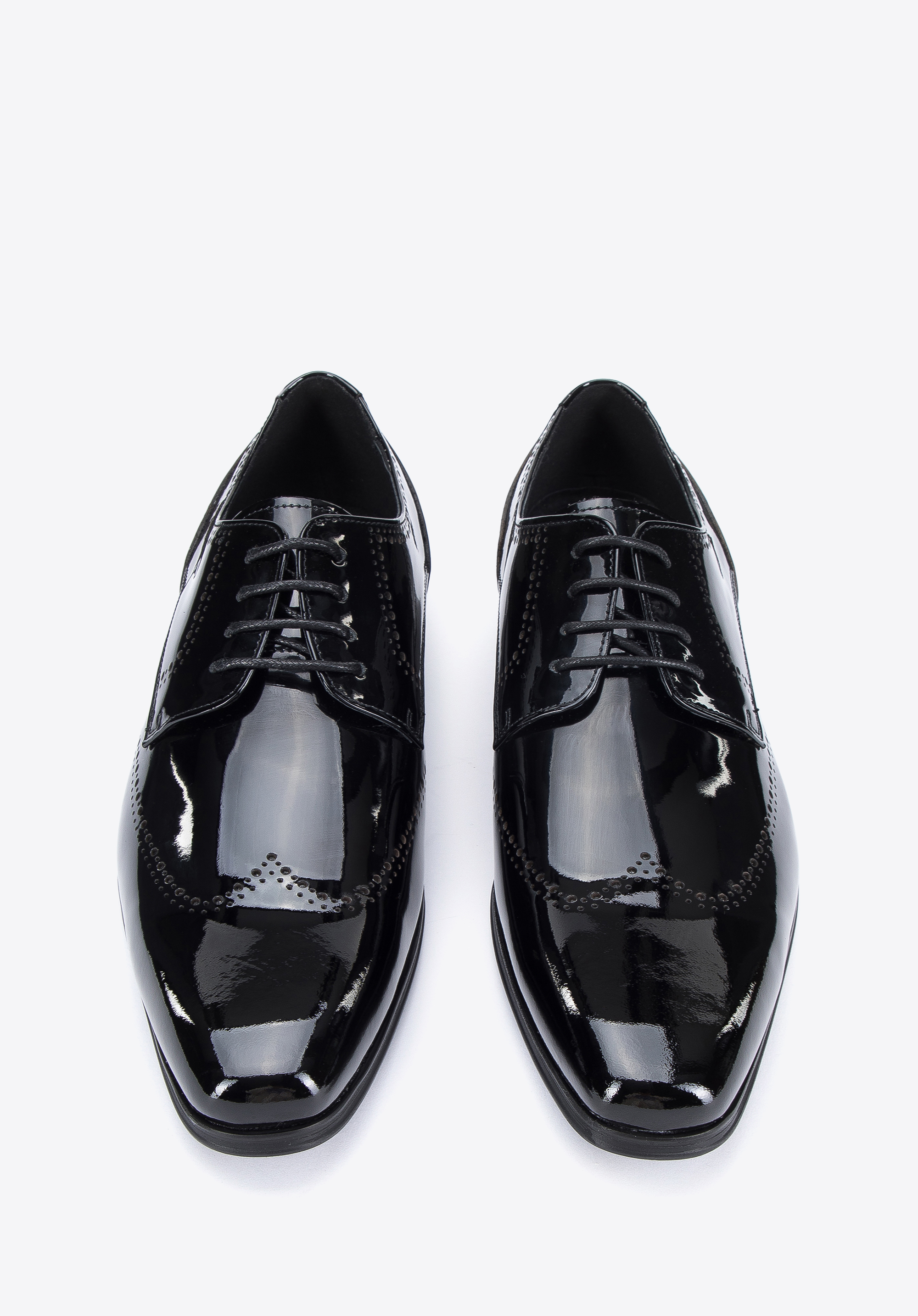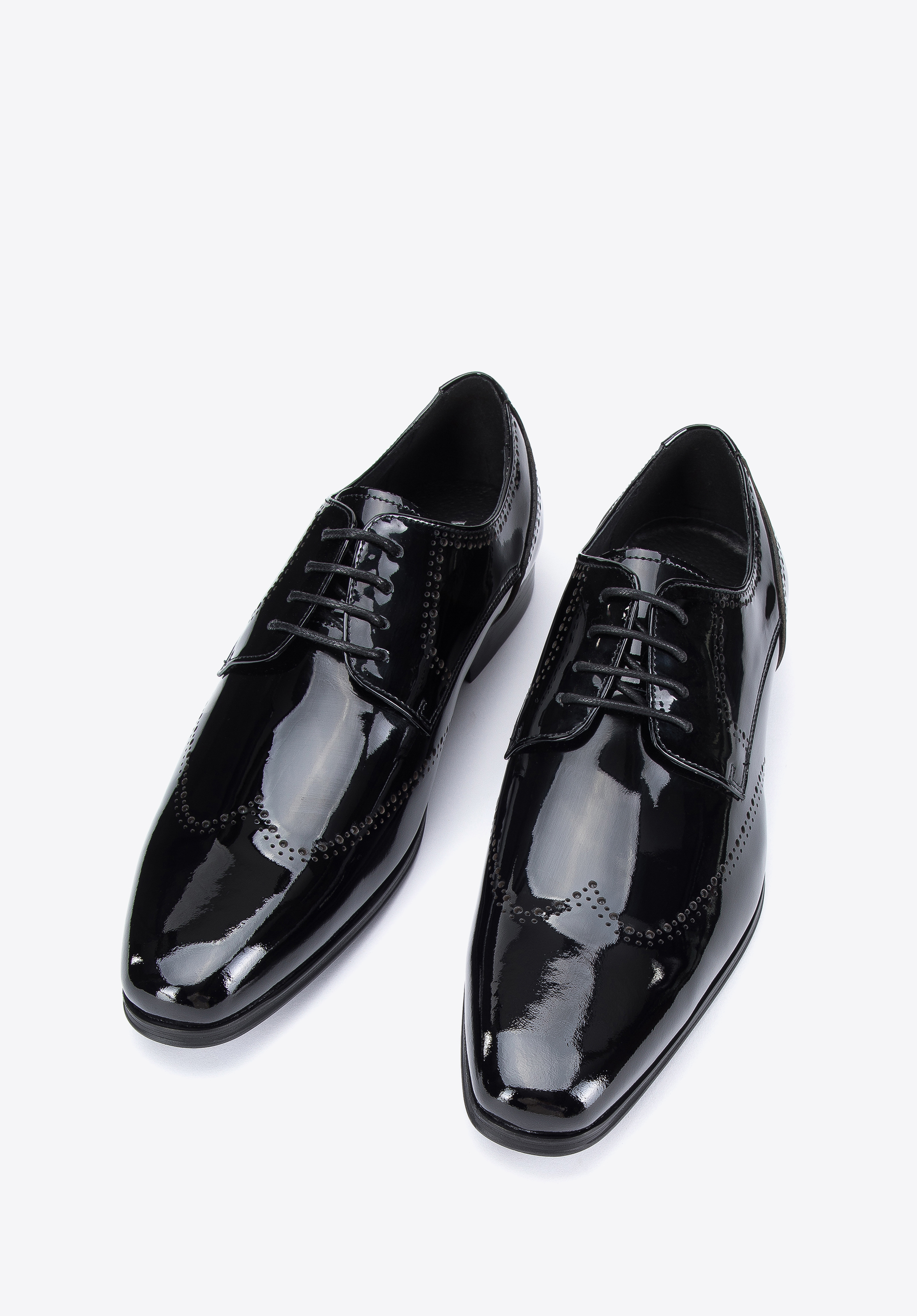 Ці елегантні чоловічі дербі стануть в нагоді на багатьох важливих урочистостях. Вони виготовлені з високоякісної лакованої шкіри, тому є аксесуаром на багато сезонів. Декор, відомий у брогах, помітний як на носі, так і на боках взуття, надає їм унікального характеру. Злегка подовжений носок додає стрункість стопи, а завдяки шкіряній устілці в них можна комфортно ходити багато годин. Чоловіче лаковане дербі з декоративною перфорацією - це класика в сучасній нотці, яку варто мати у своєму гардеробі.