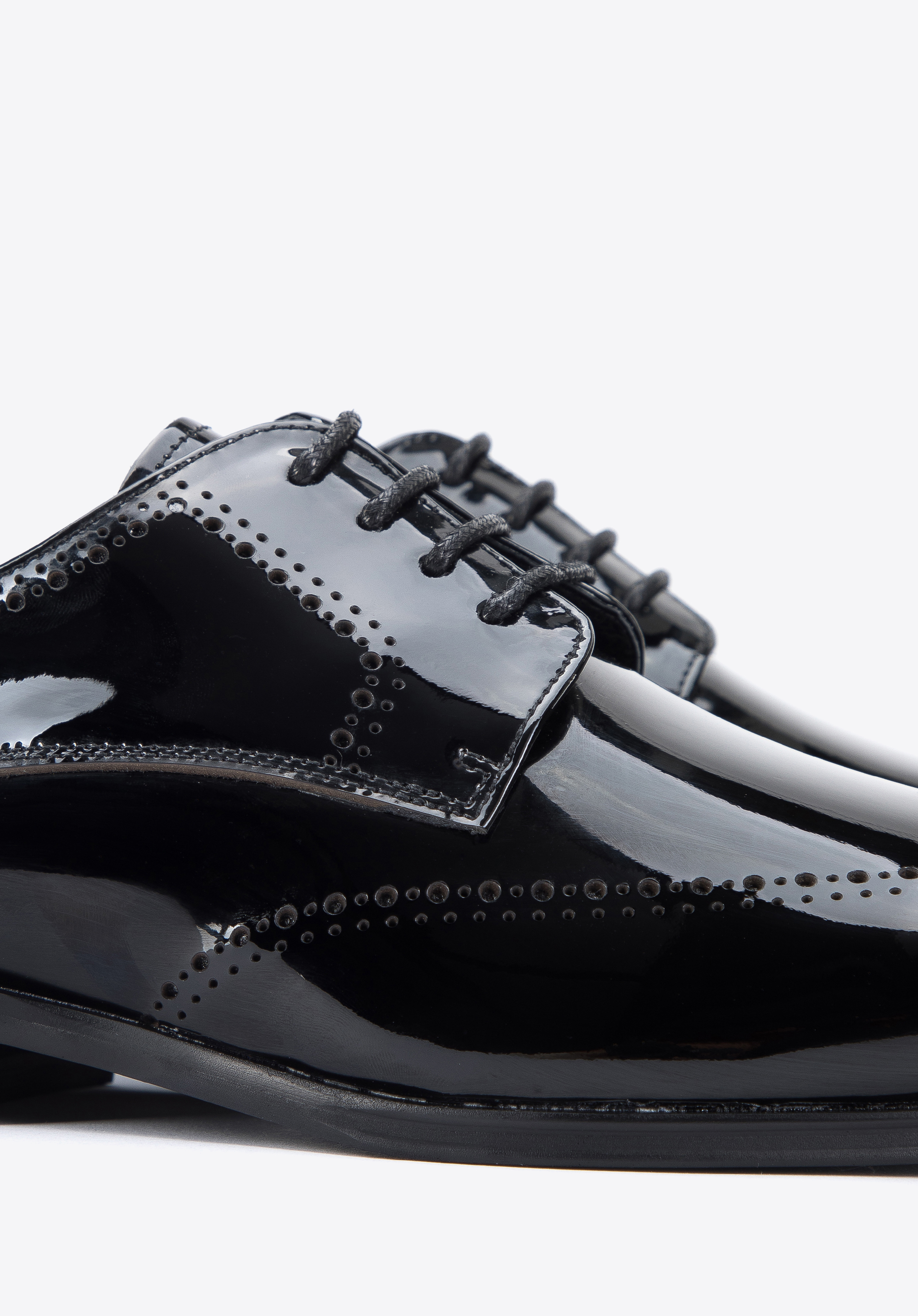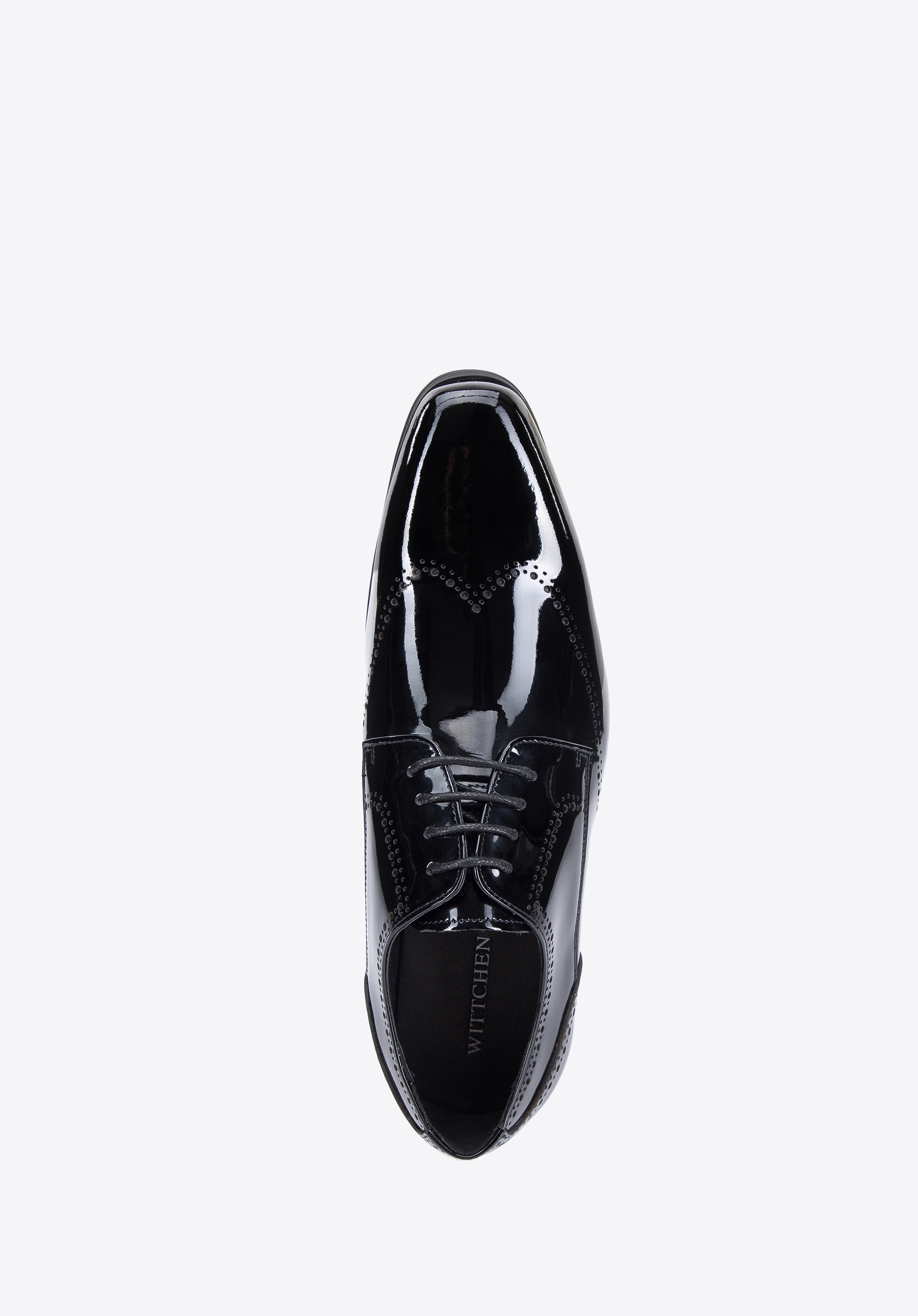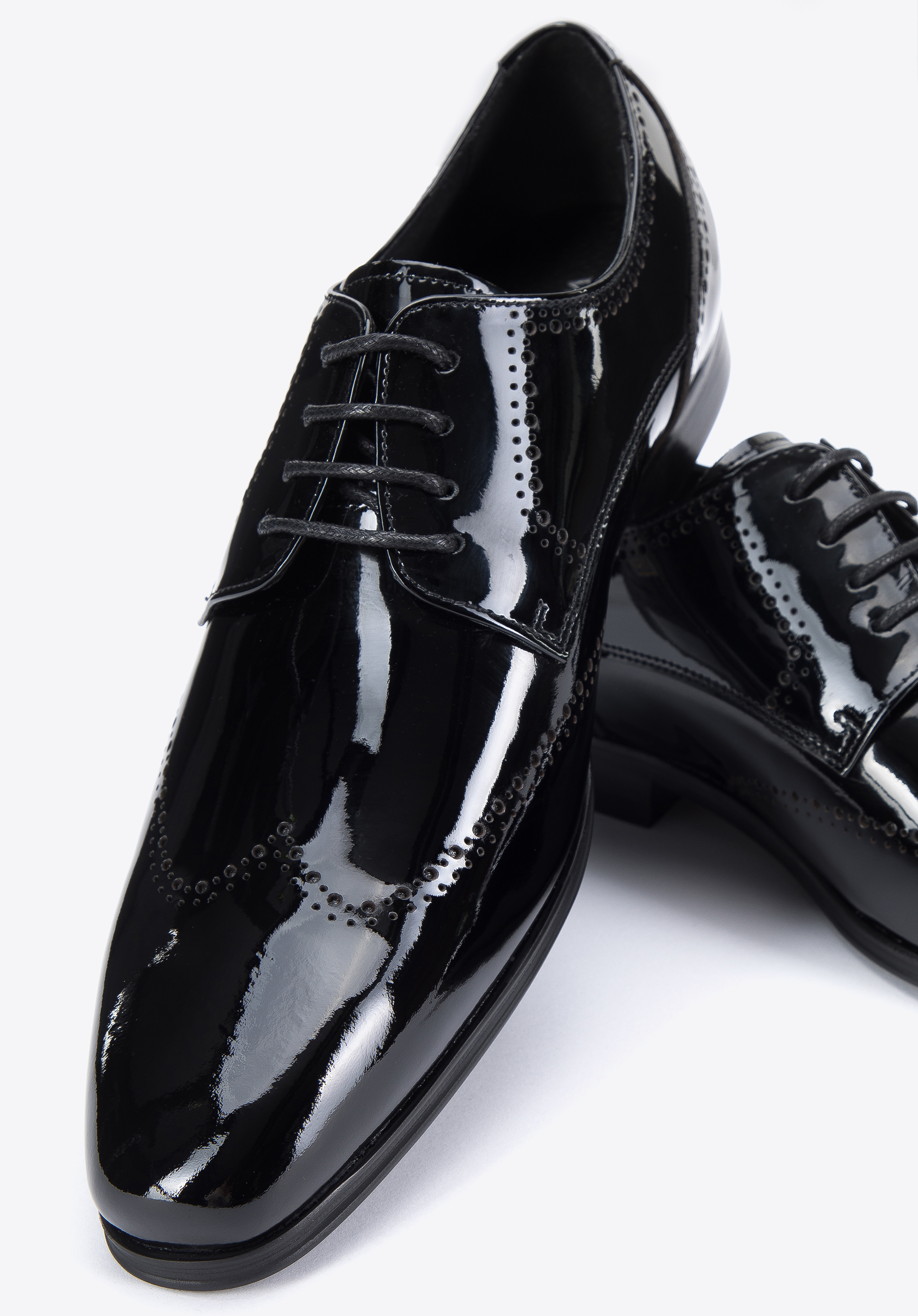 Ці елегантні чоловічі дербі стануть в нагоді на багатьох важливих урочистостях. Вони виготовлені з високоякісної лакованої шкіри, тому є аксесуаром на багато сезонів. Декор, відомий у брогах, помітний як на носі, так і на боках взуття, надає їм унікального характеру. Злегка подовжений носок додає стрункість стопи, а завдяки шкіряній устілці в них можна комфортно ходити багато годин. Чоловіче лаковане дербі з декоративною перфорацією - це класика в сучасній нотці, яку варто мати у своєму гардеробі.