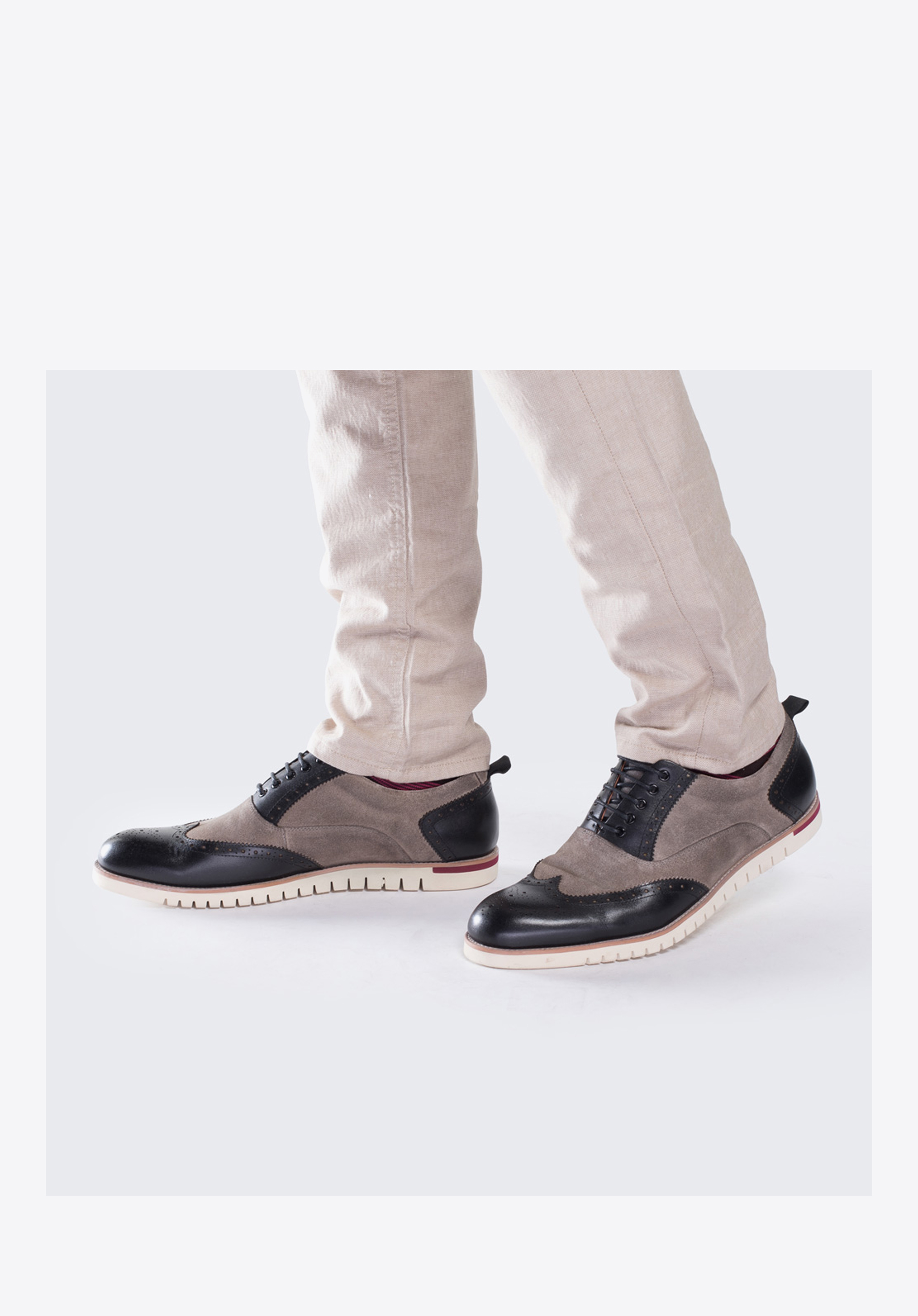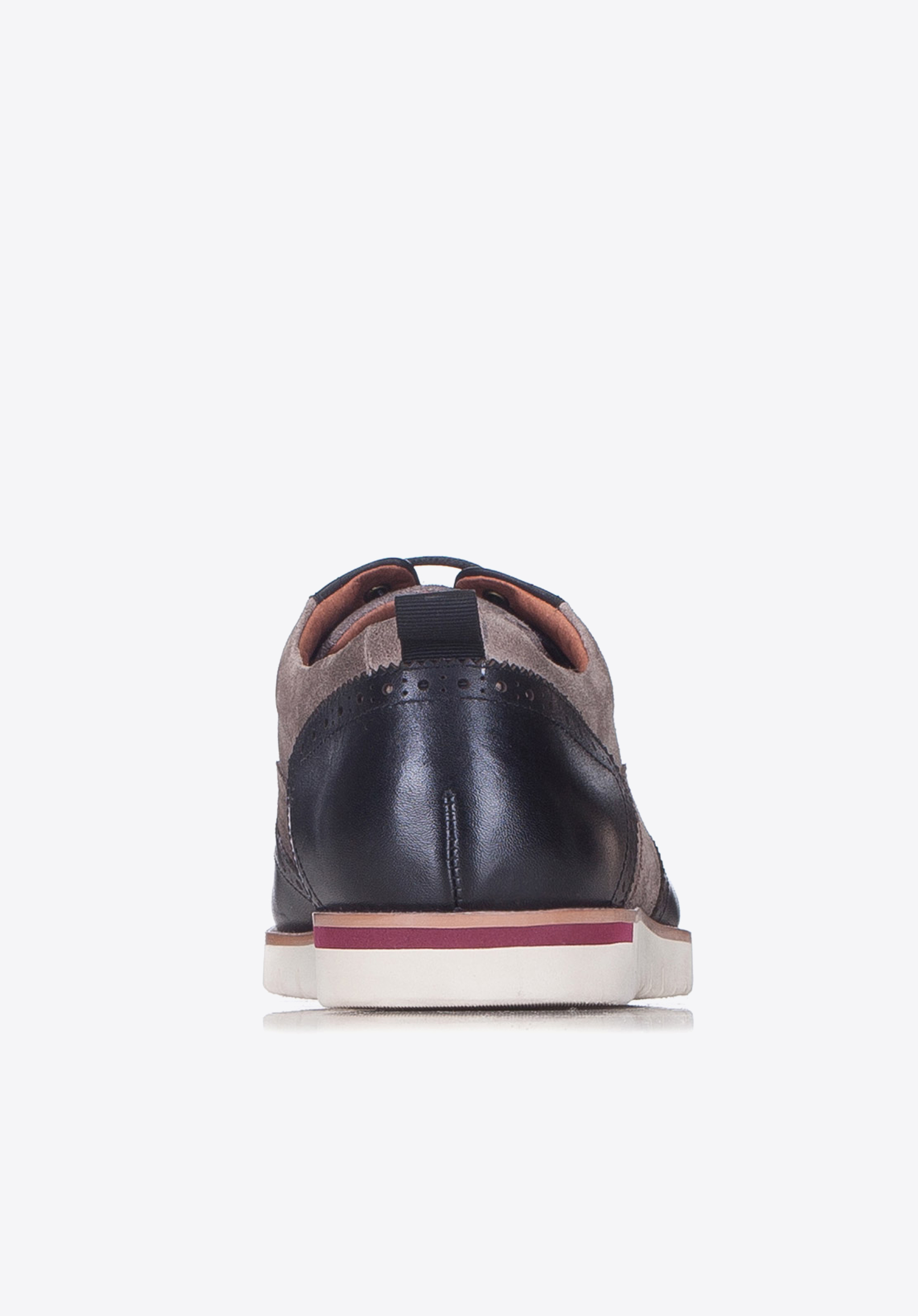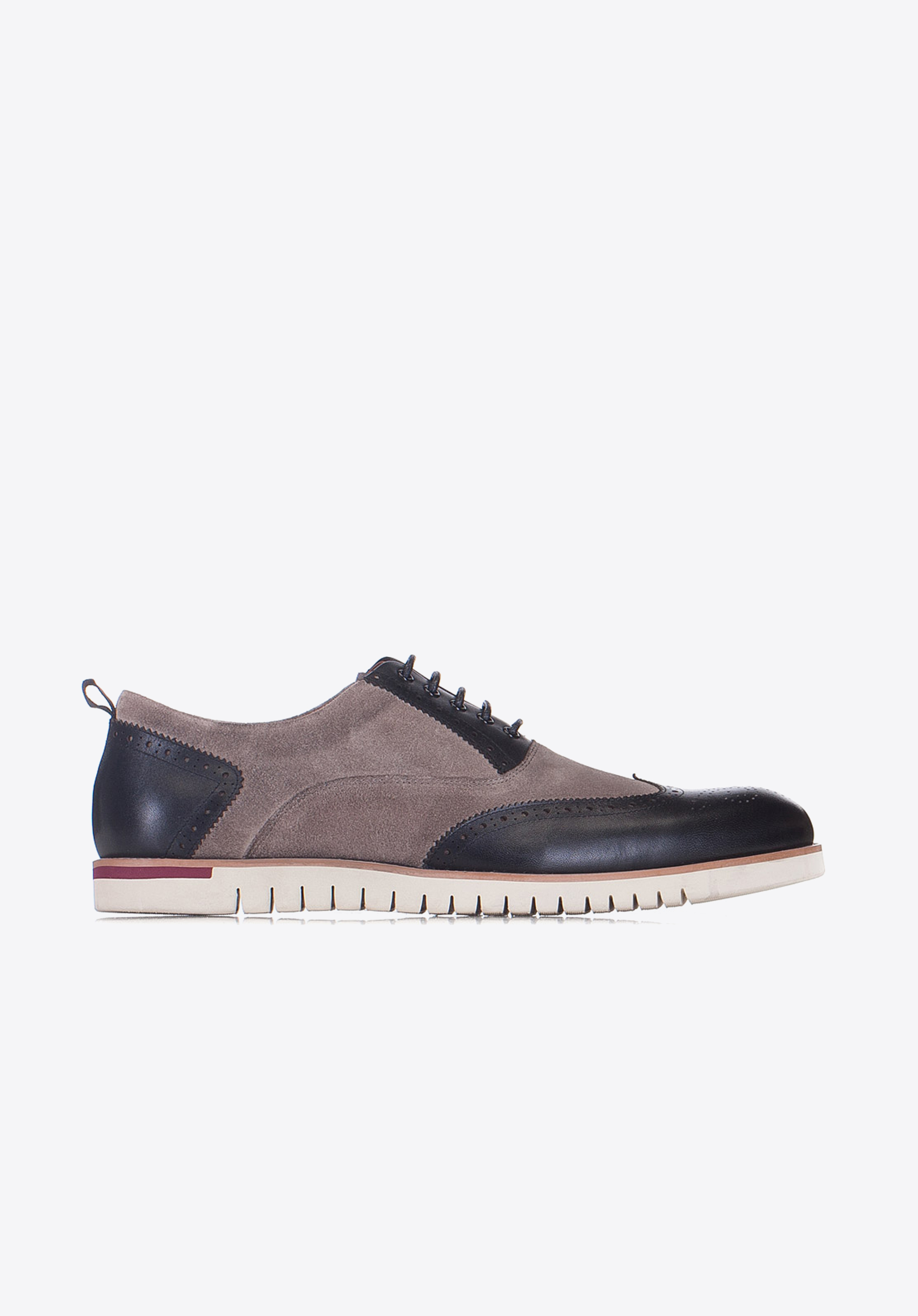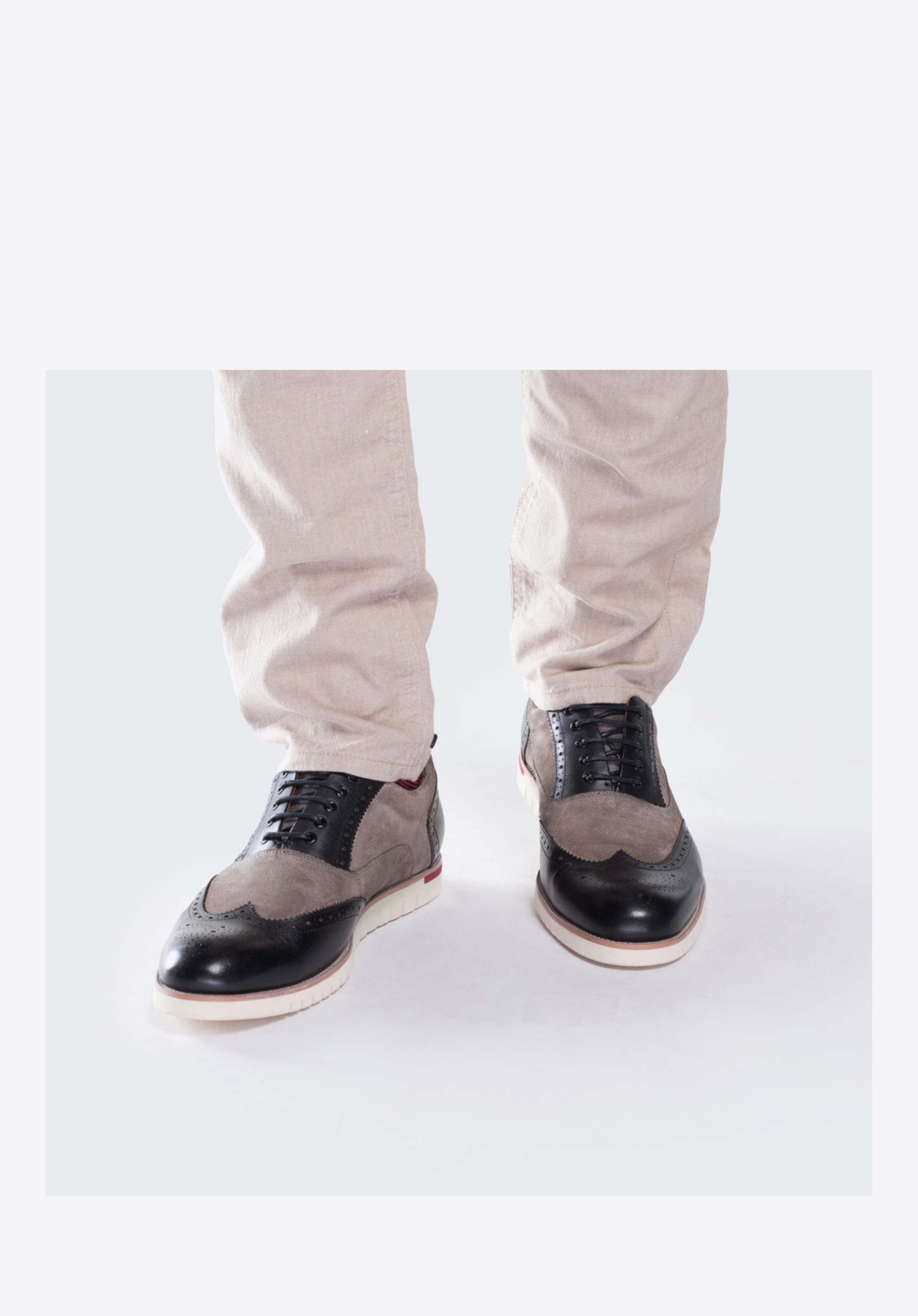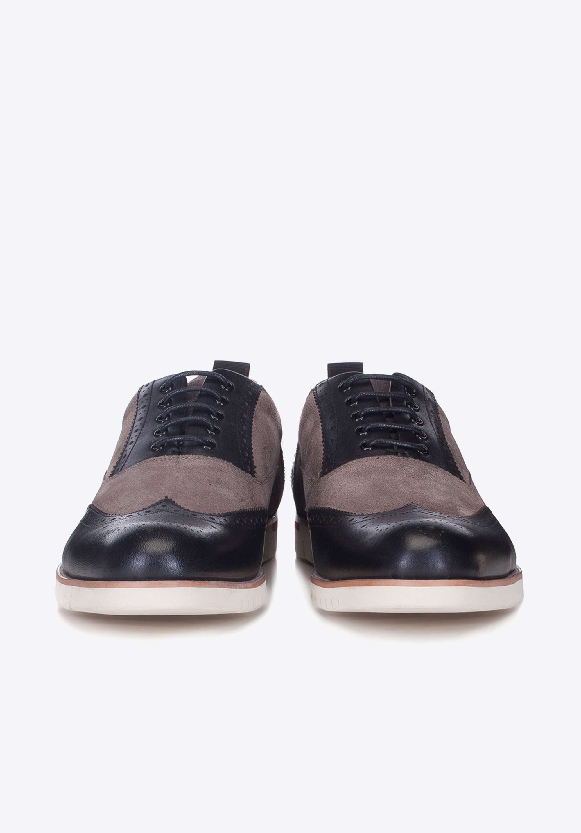 Чоловічі напівчеревики створені з поєднання чудової якості натуральної шкіри і шкіри нубуку. Чорно-сіра модель із закритим верхом і перфорацією являє собою сучасний гібрид елегантних оксфордів зі спортивним взуттям. Біла підошва з протектором надає моделі спортивний вигляд. Наша порада: модний дует по достоїнству оцінять чоловіки, що стежать за актуальними тенденціями моди.
