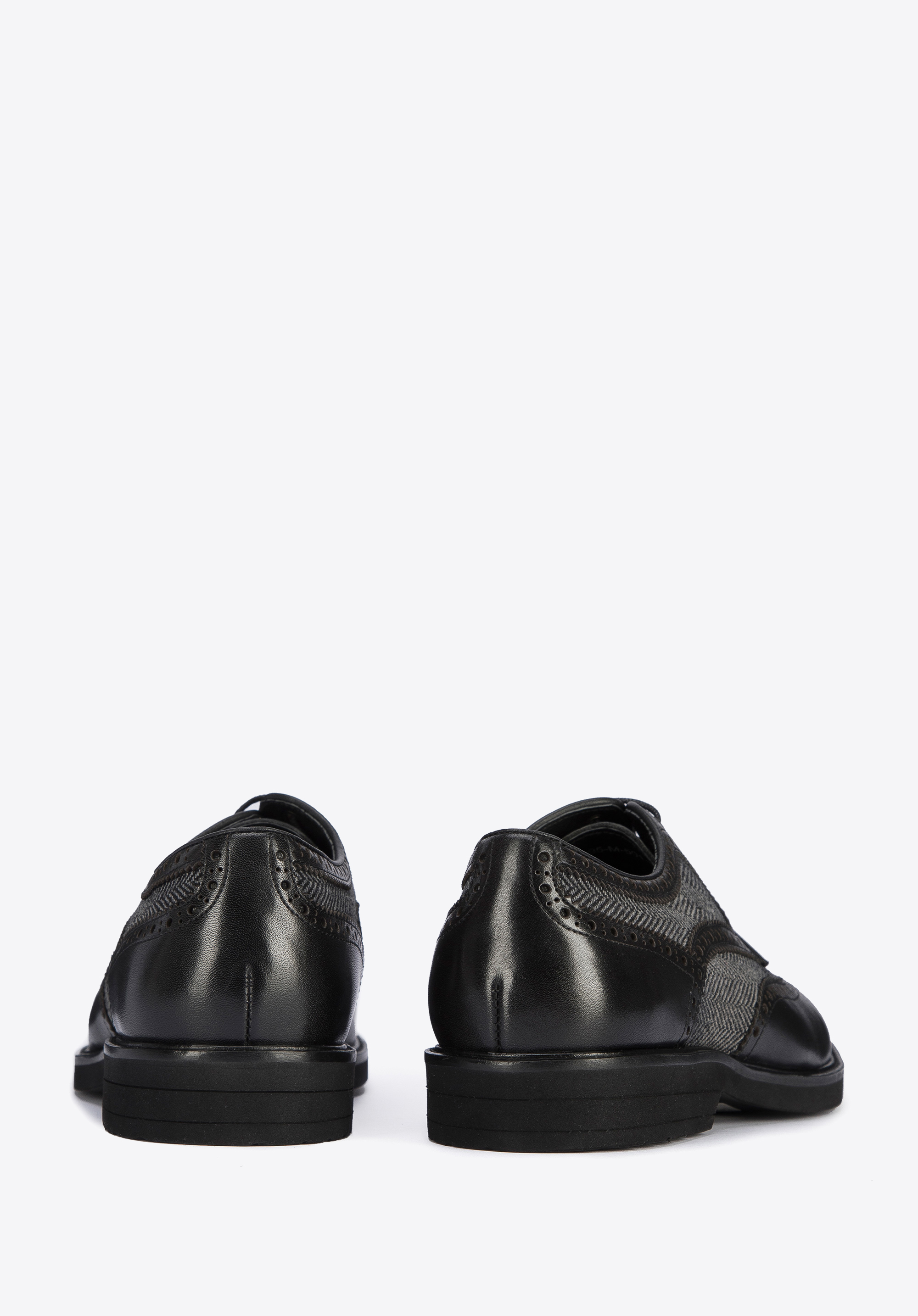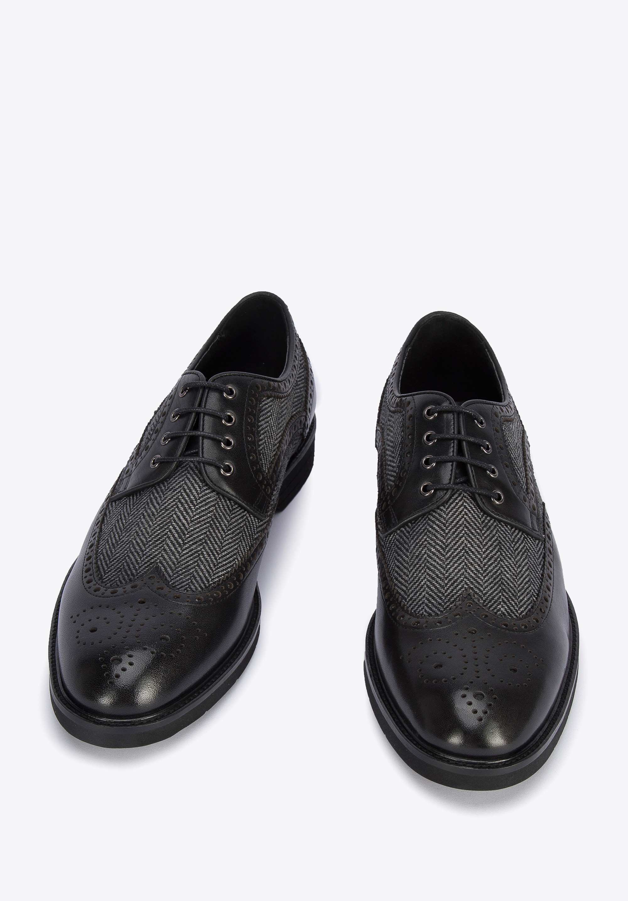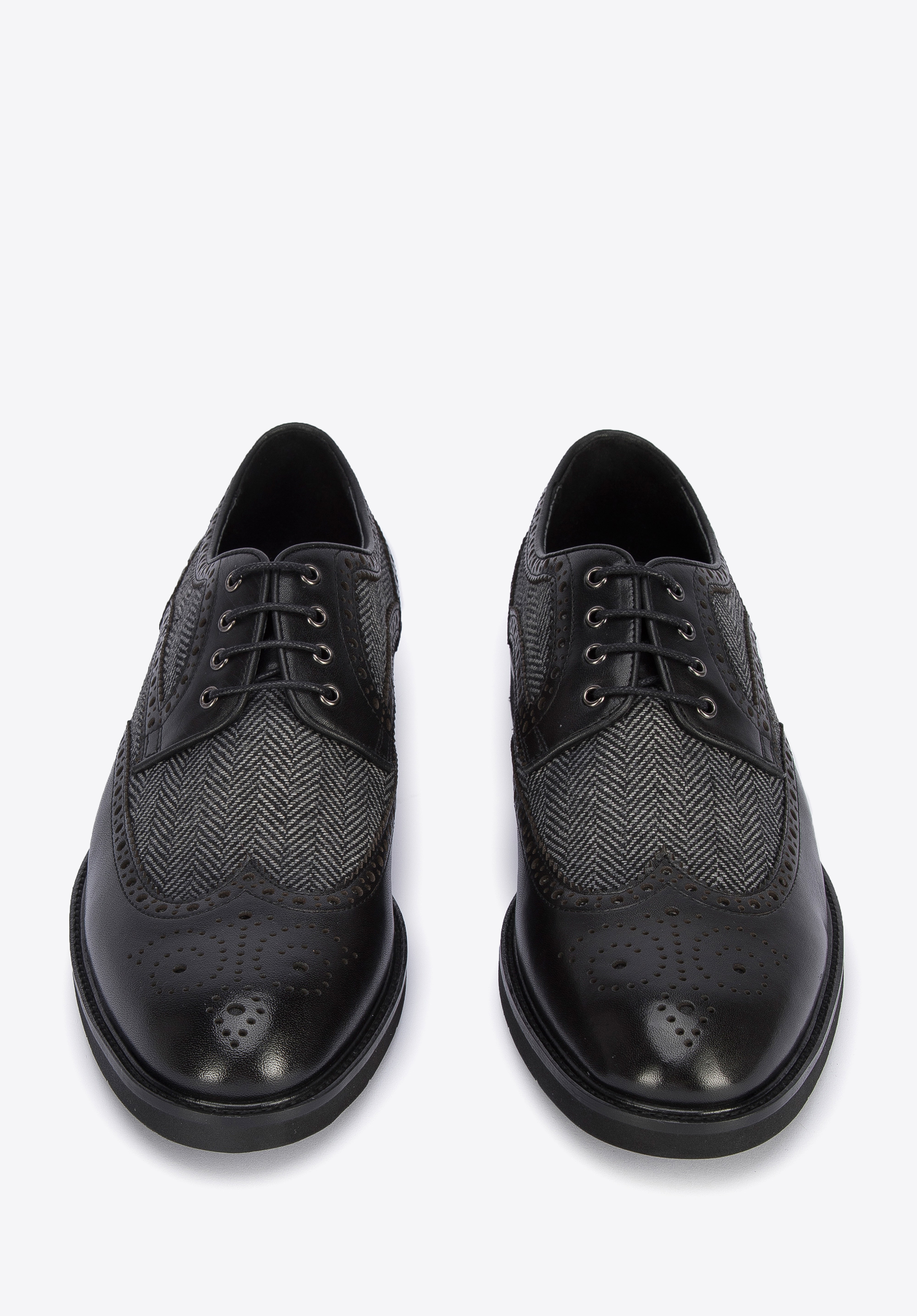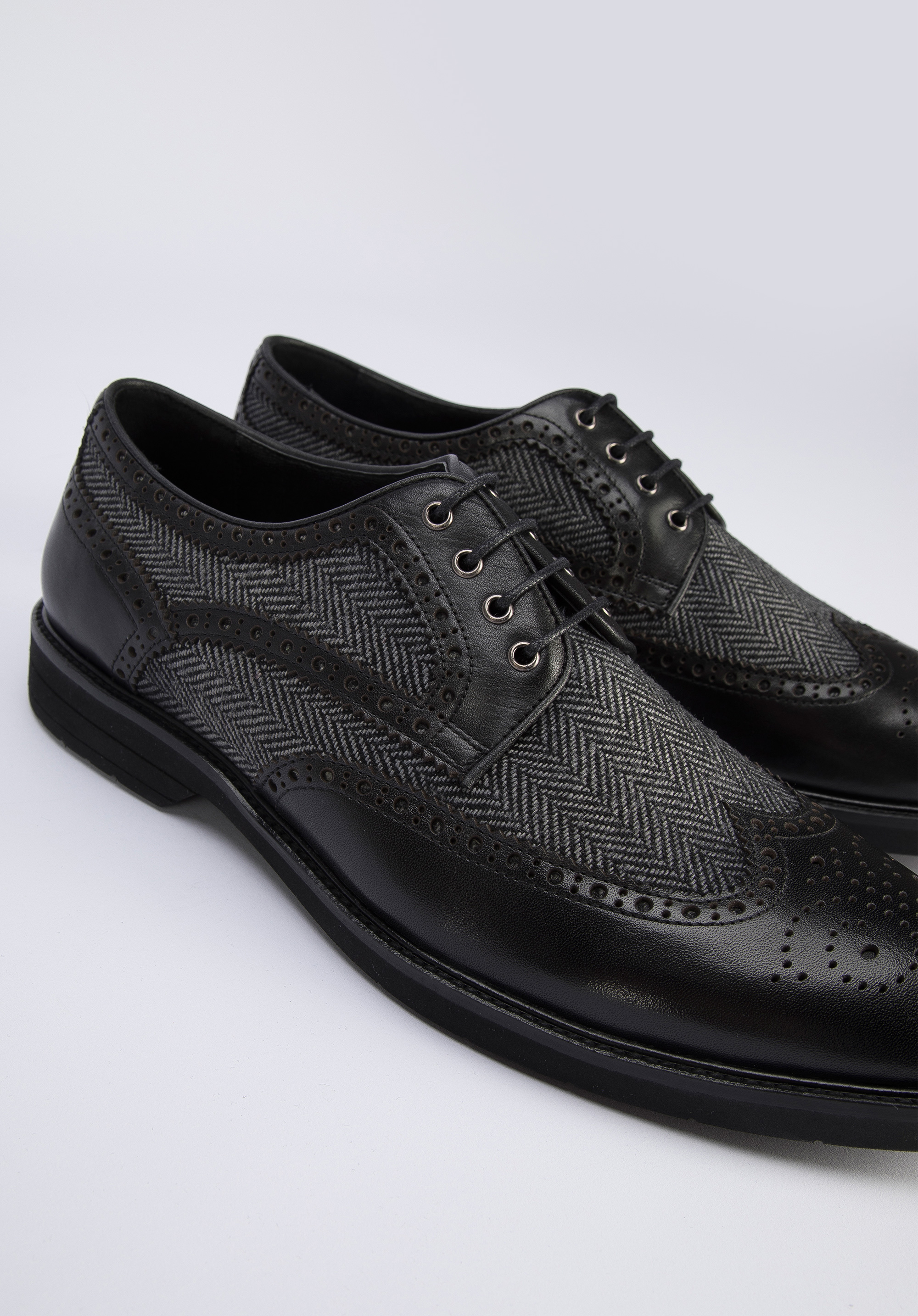 Ці броги - елегантний аксесуар в неочевидному виконанні. Класичний крій урізноманітнили фрагменти тканини «ялинка», яка поєднується з якісною натуральною шкірою. Крім того, вони мають перфорацію, зубчасті краї та «W» на носі. Вони чудово пасуватимуть до нарядів у стилі casual: наприклад, до костюма чи брюк та светра. Чоловічі шкіряні броги з мотивом «ялинка» — незамінний вибір для кожного стильного чоловіка.