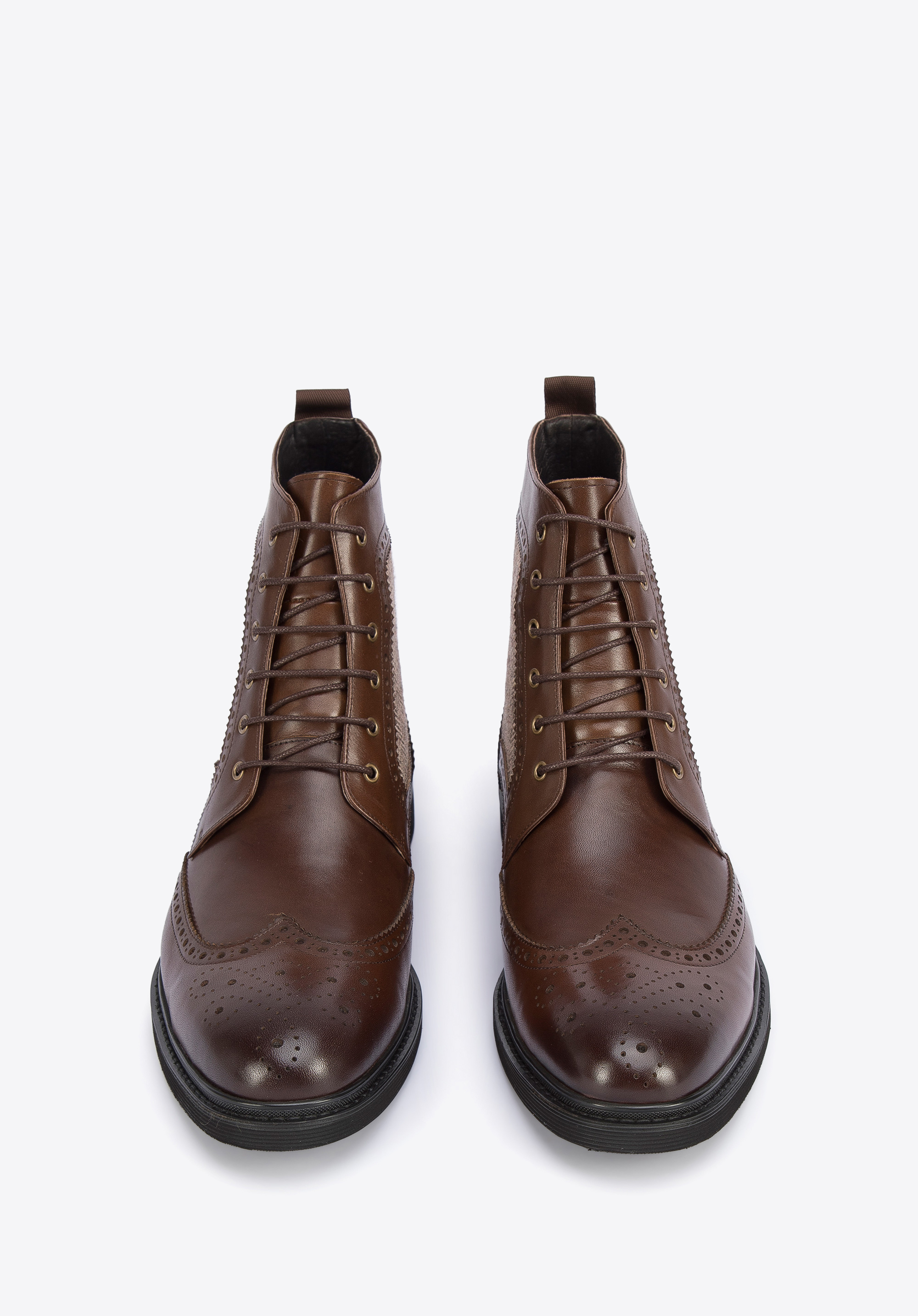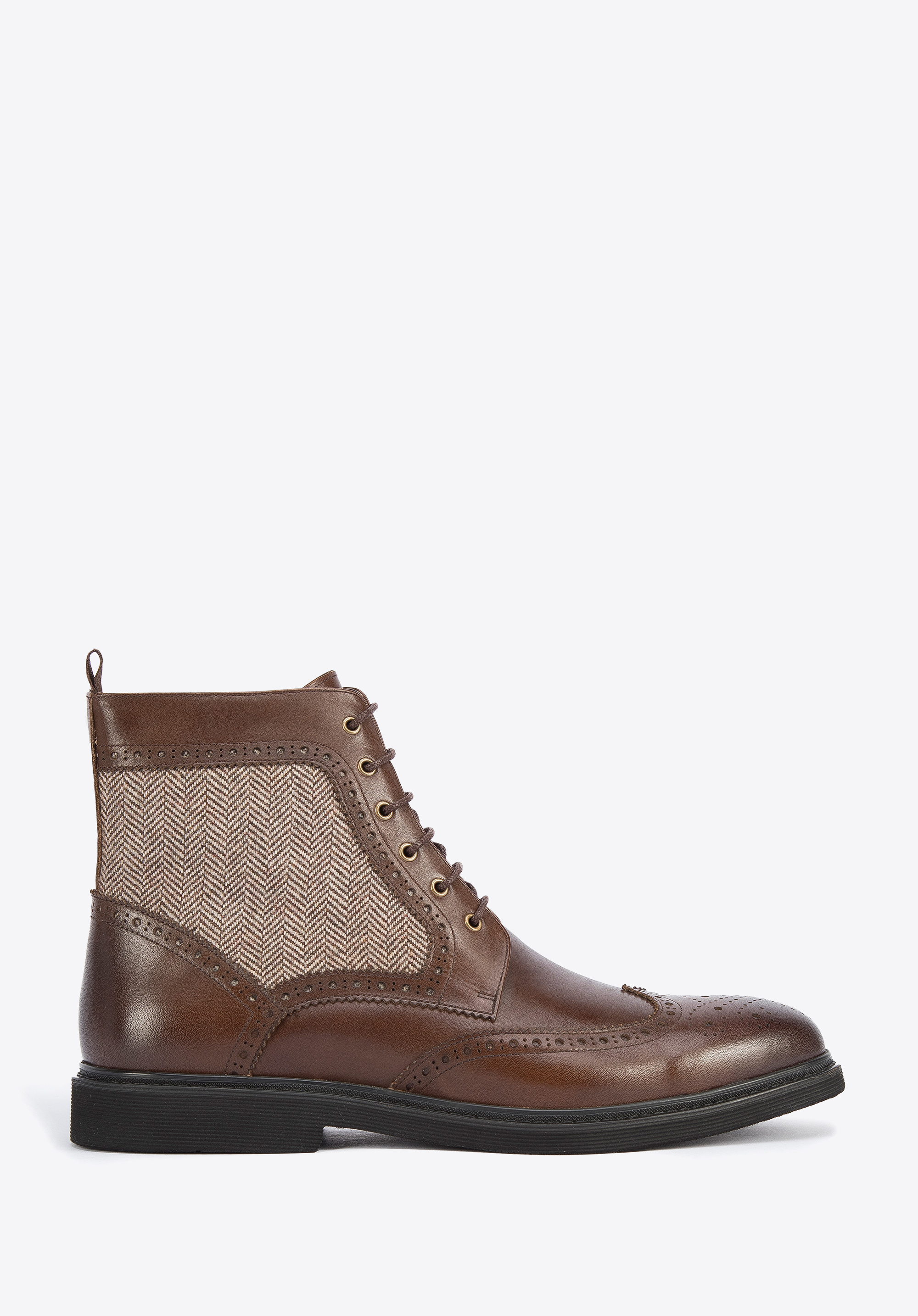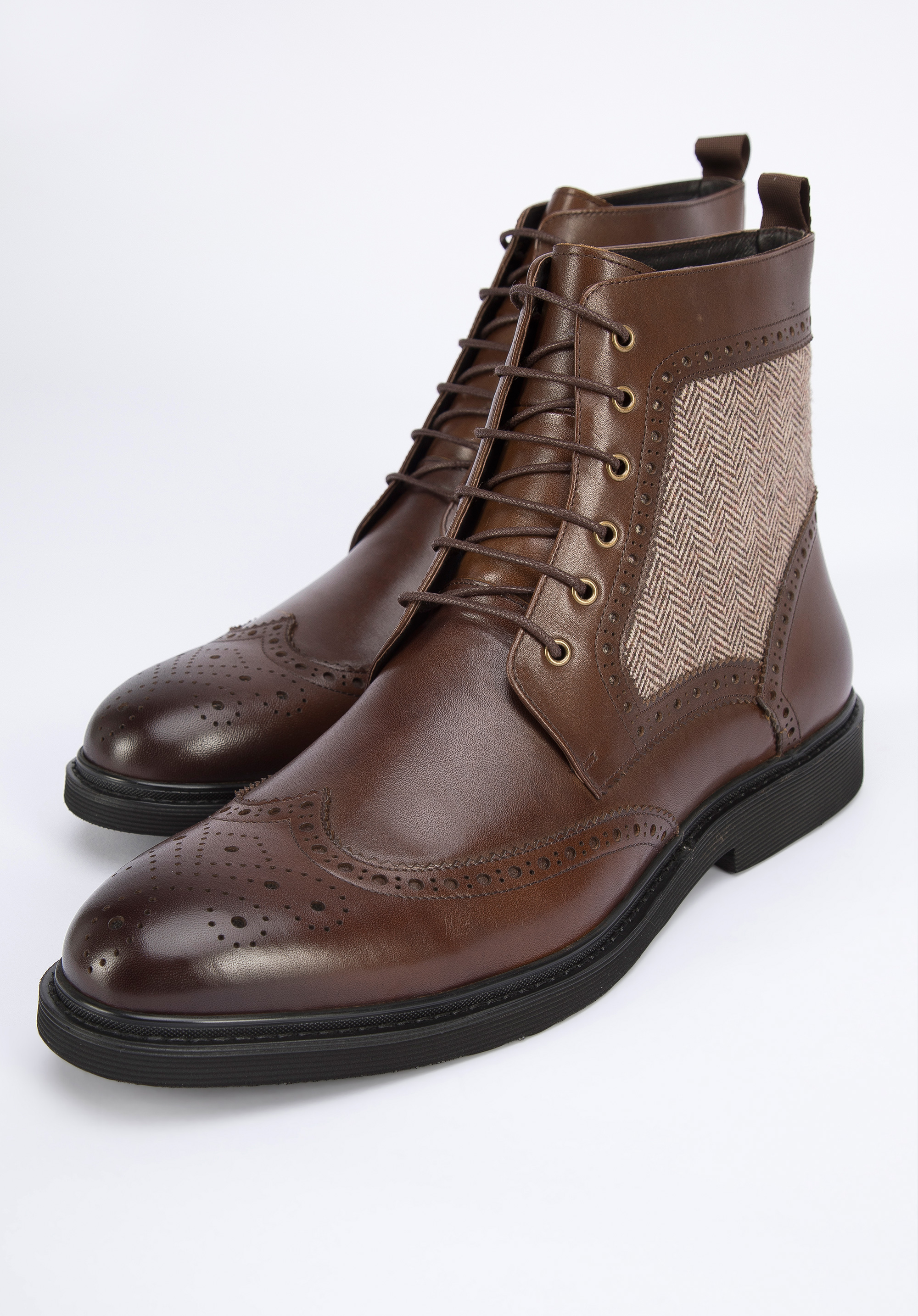 Це чоловіче взуття додасть стилю вашому гардеробу. Вони мають характерну для брогів перфорацію та бічні вставки з модним мотивом ялинки. Виготовлені з якісної натуральної шкіри, з трохи затемненим носиком. Завдяки підсиленням в області п''яти ви ходите в них тривалий час. Ви можете носити їх як з напівофіційним, так і з більш спортивним одягом. Чоловічі шкіряні черевики з мотивом «ялинка» стильно доповнять і підкреслять будь-який ваш наряд.
