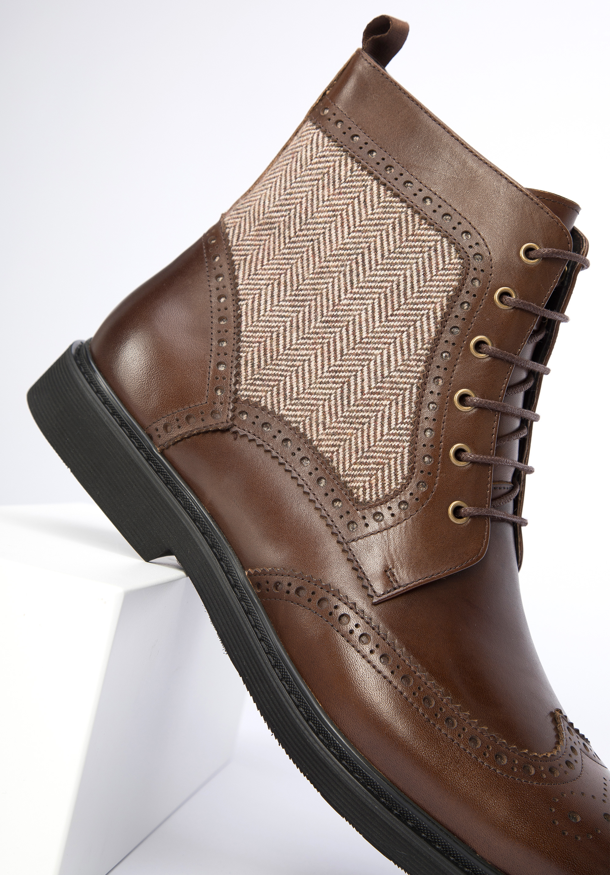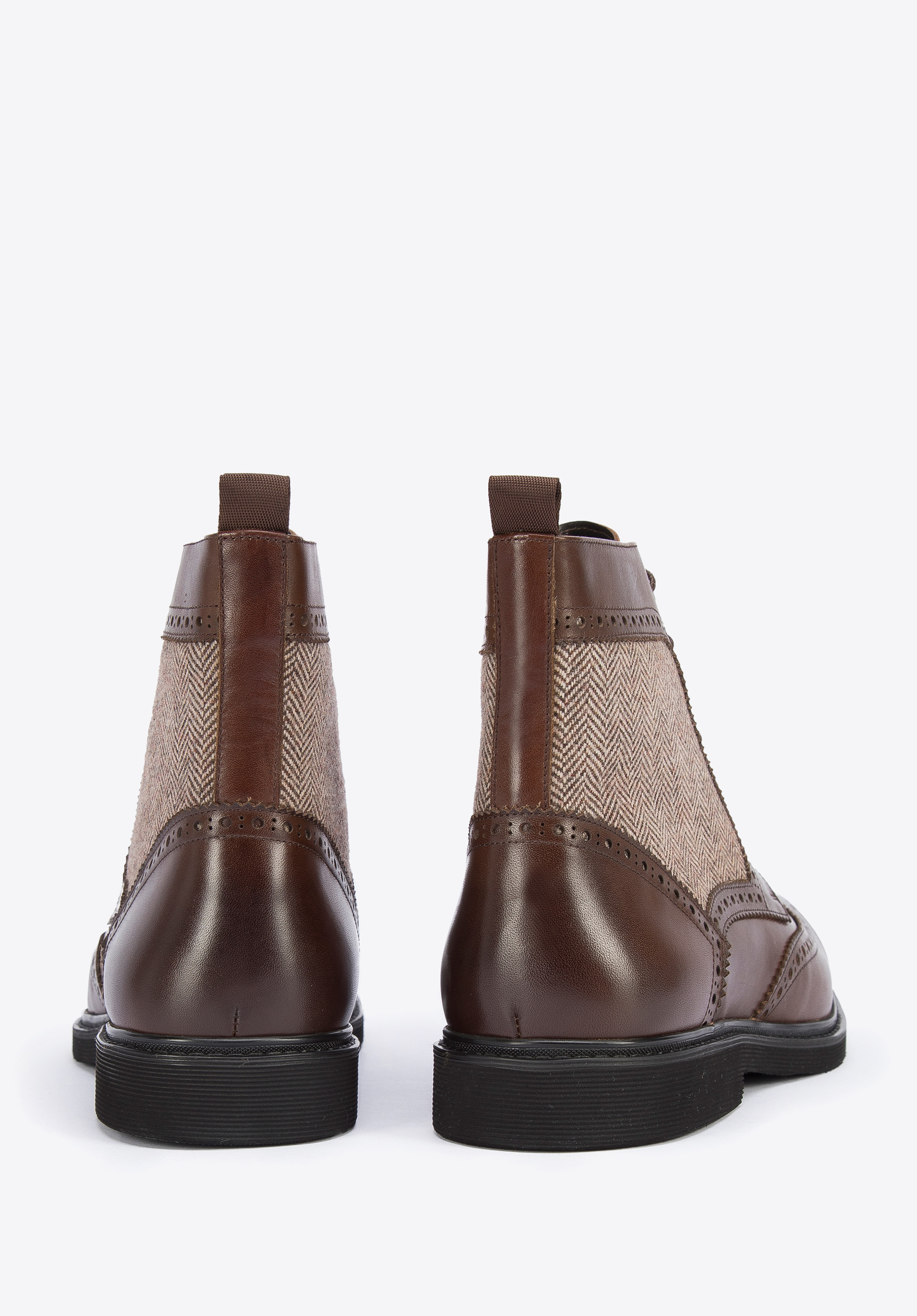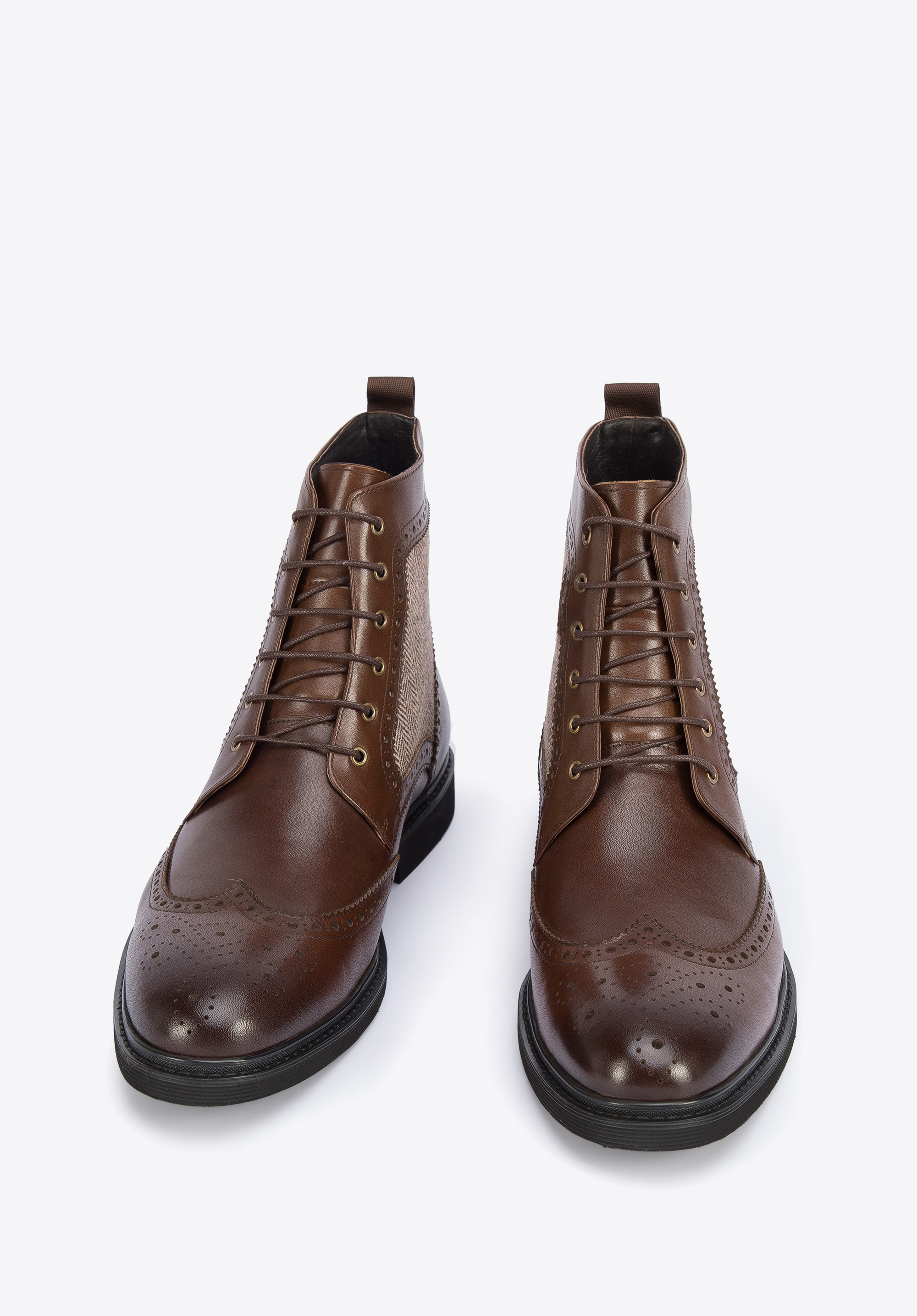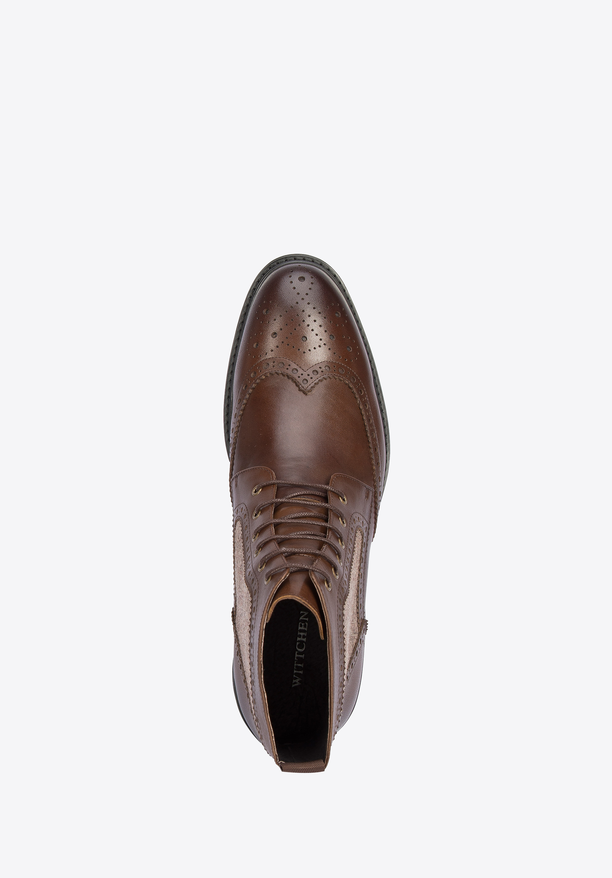 Це чоловіче взуття додасть стилю вашому гардеробу. Вони мають характерну для брогів перфорацію та бічні вставки з модним мотивом ялинки. Виготовлені з якісної натуральної шкіри, з трохи затемненим носиком. Завдяки підсиленням в області п''яти ви ходите в них тривалий час. Ви можете носити їх як з напівофіційним, так і з більш спортивним одягом. Чоловічі шкіряні черевики з мотивом «ялинка» стильно доповнять і підкреслять будь-який ваш наряд.
