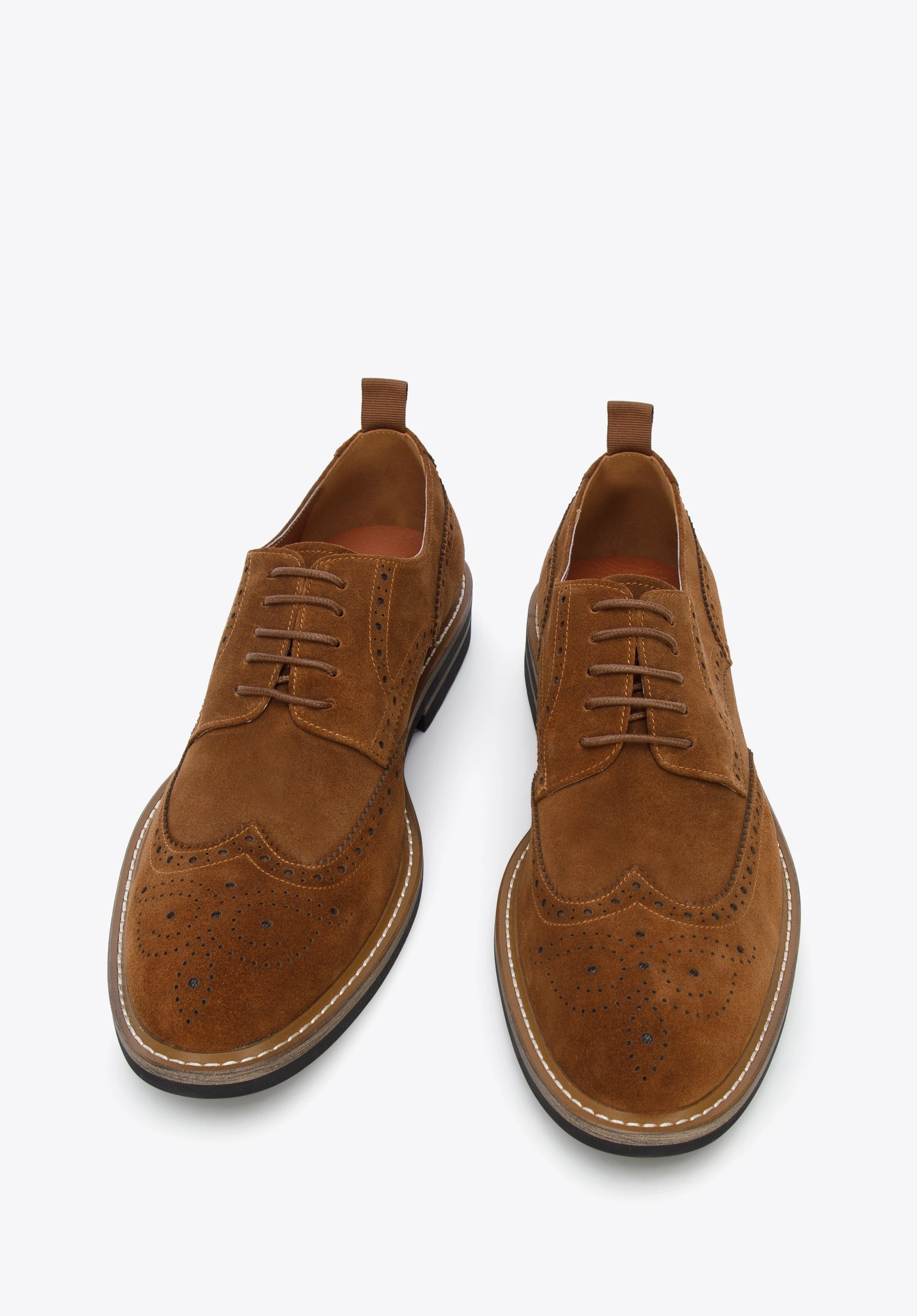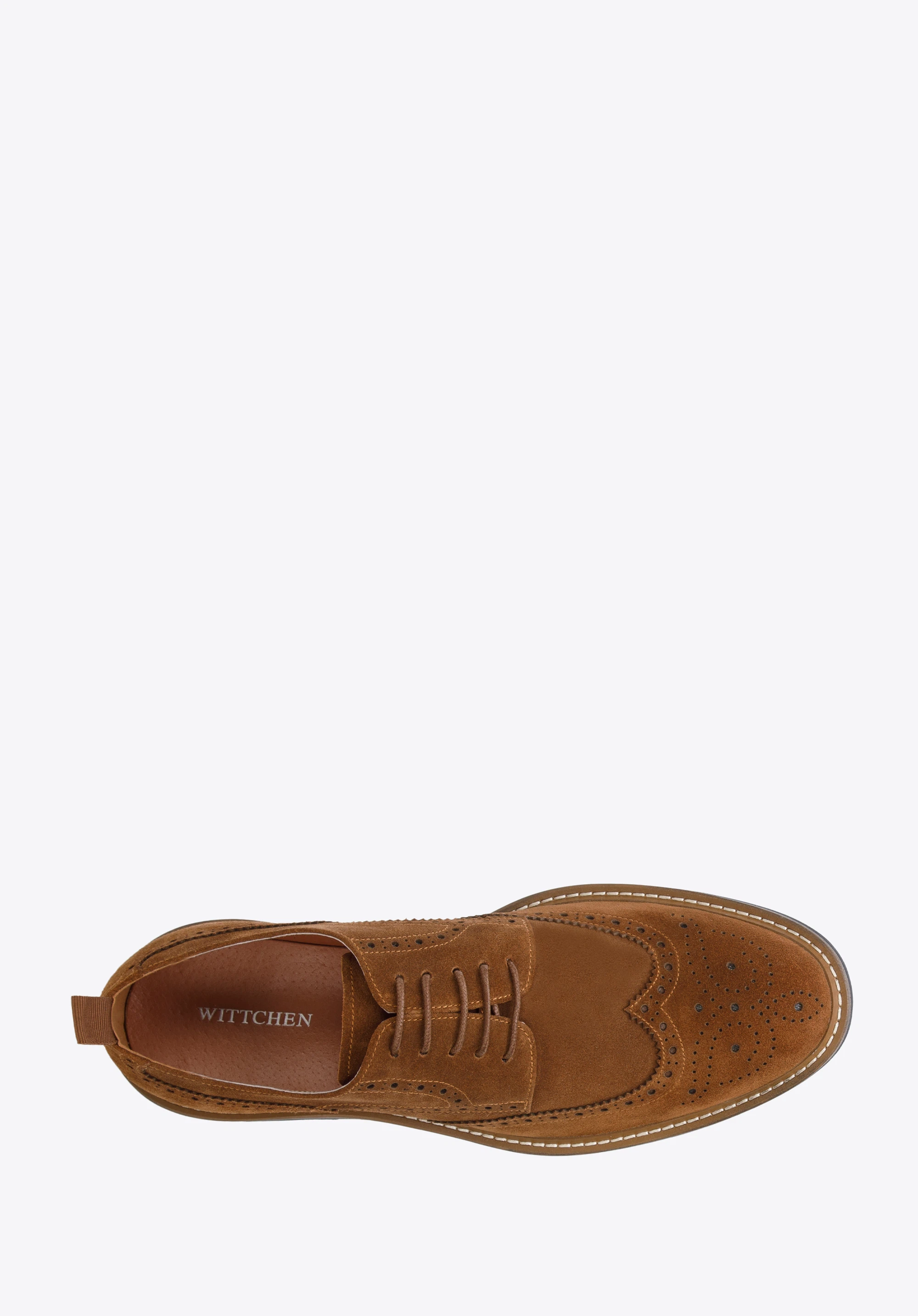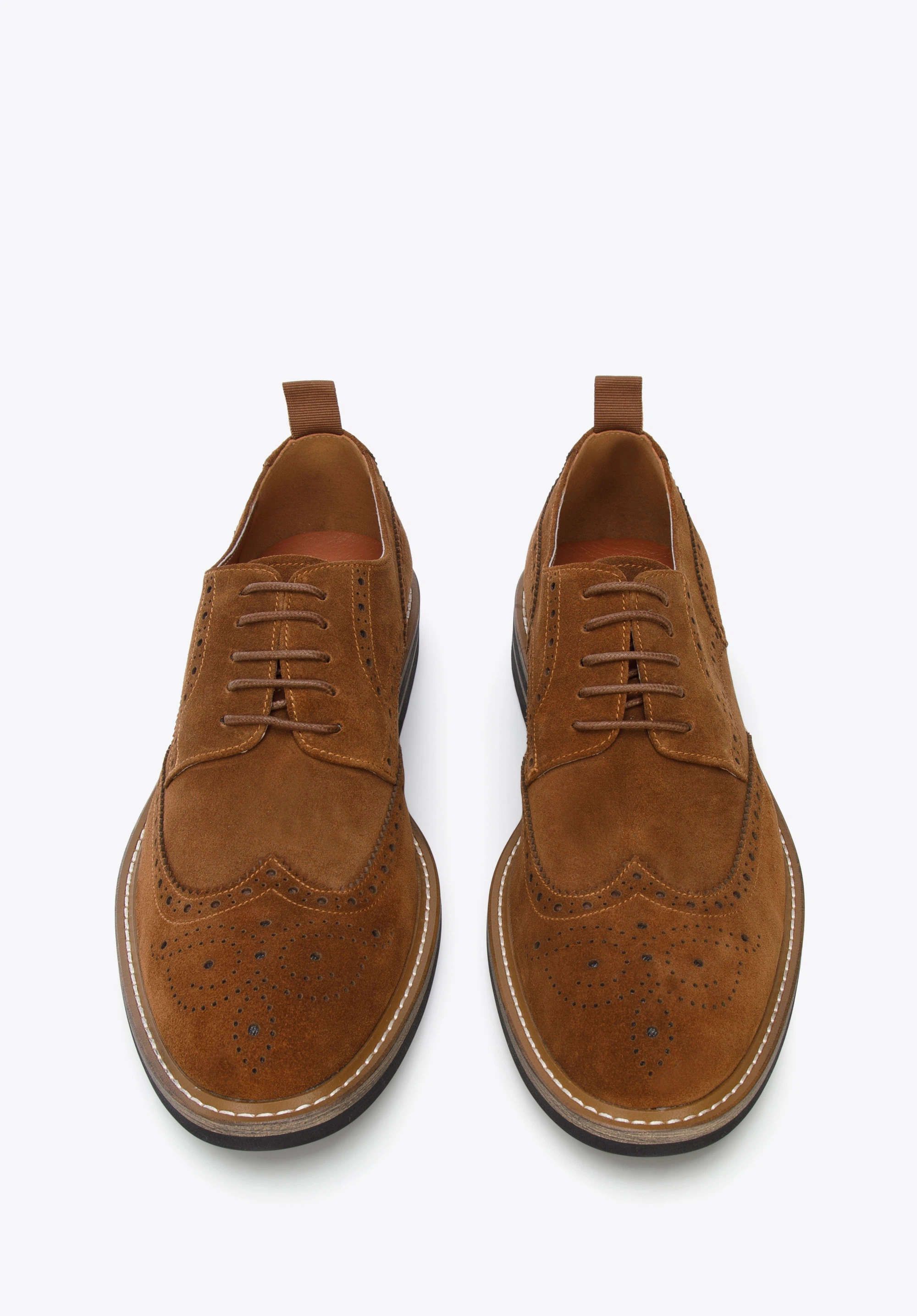 Стильні чоловічі броги - вічний вибір для кожного елегантного чоловіка. Дана модель виготовлена з високоякісної замшевої шкіри. Вони мають характерні декоративні перфорації на носку і з боків, що надає їм шикарний вигляд. Все це доповнюється підошвою, обробленою контрастною ниткою, і двоколірним каблуком. Чоловічі замшеві броги з контрастною ниткою - це класика в сучасному відтінку, яку варто мати у своєму гардеробі.