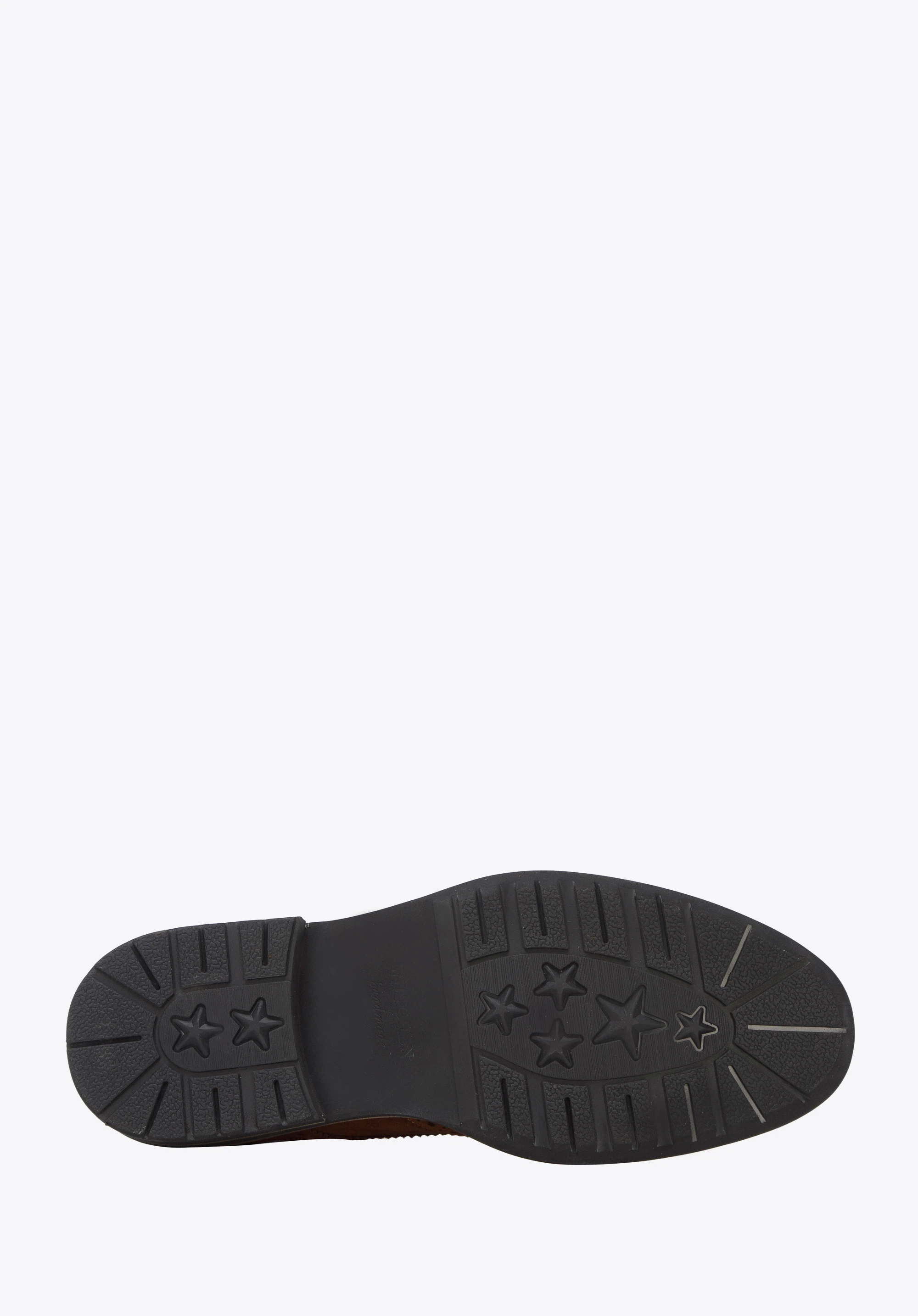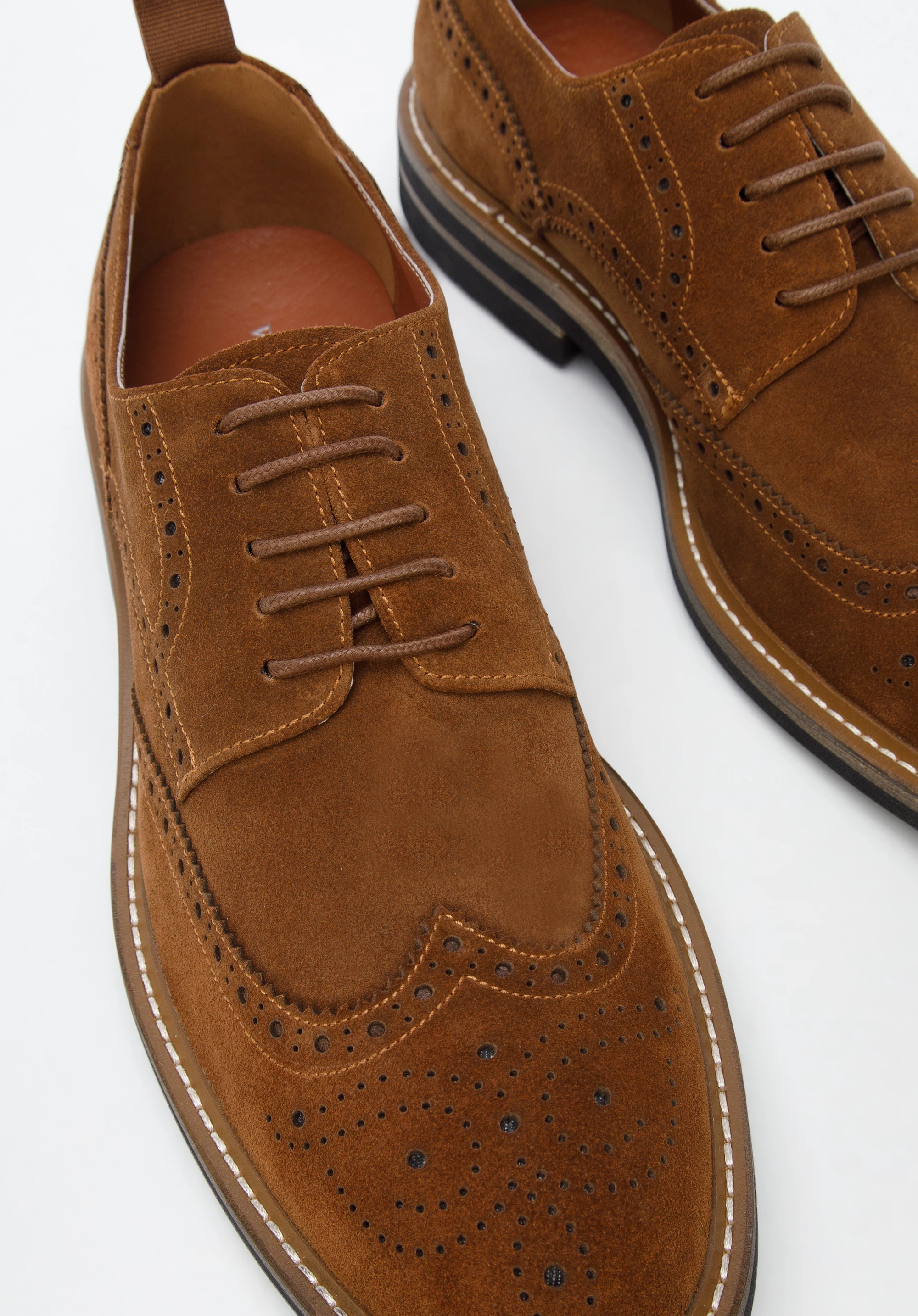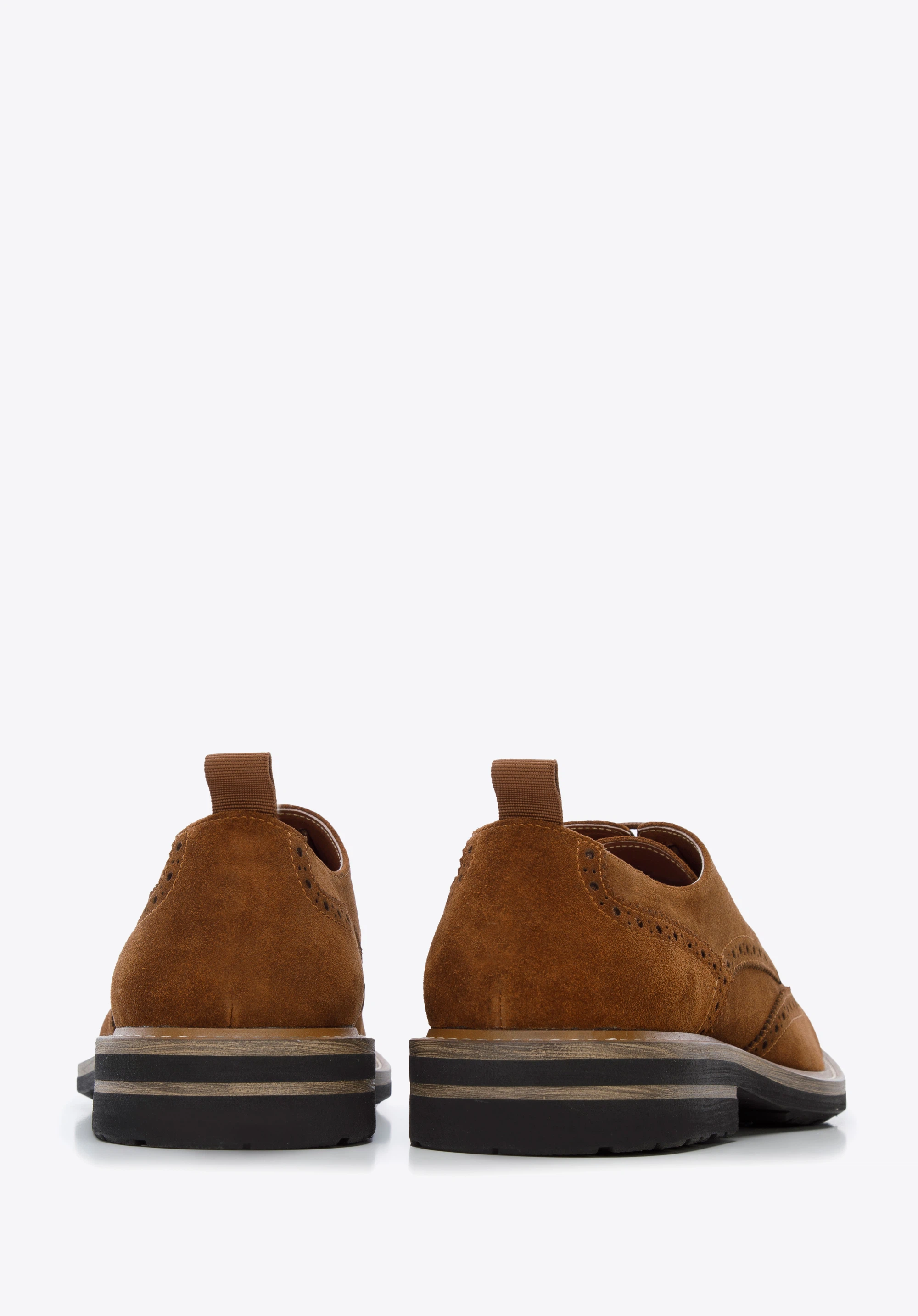 Стильні чоловічі броги - вічний вибір для кожного елегантного чоловіка. Дана модель виготовлена з високоякісної замшевої шкіри. Вони мають характерні декоративні перфорації на носку і з боків, що надає їм шикарний вигляд. Все це доповнюється підошвою, обробленою контрастною ниткою, і двоколірним каблуком. Чоловічі замшеві броги з контрастною ниткою - це класика в сучасному відтінку, яку варто мати у своєму гардеробі.