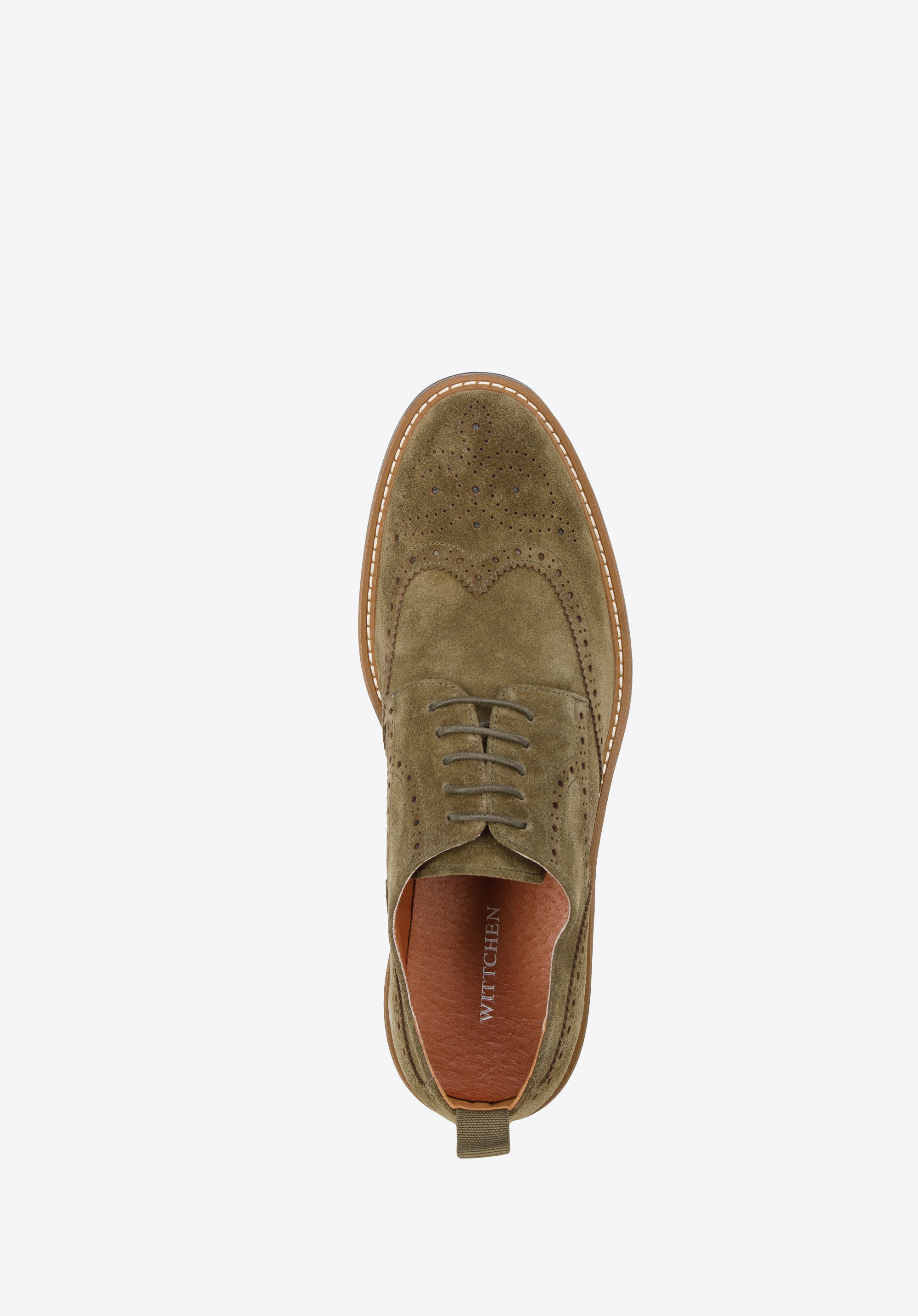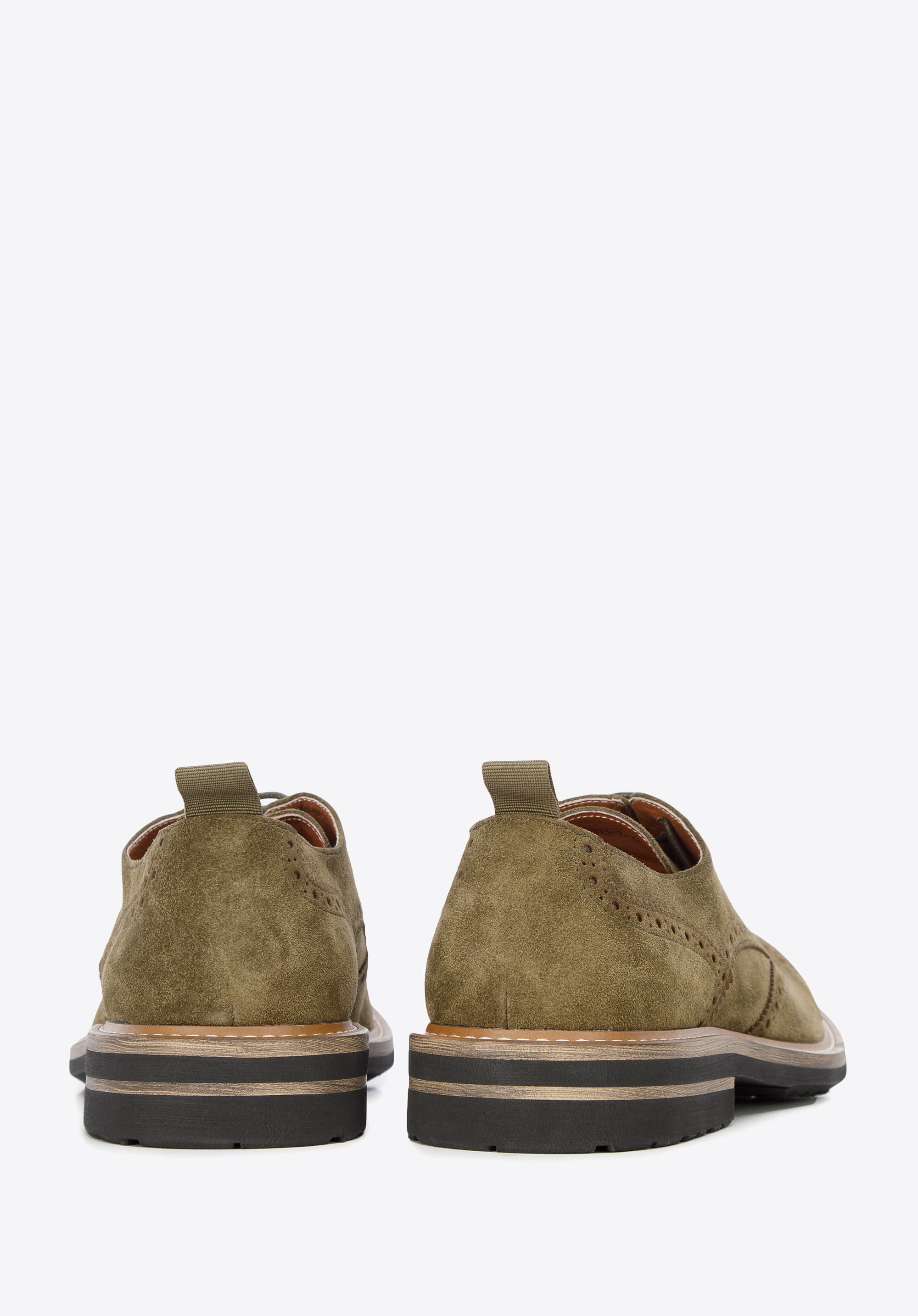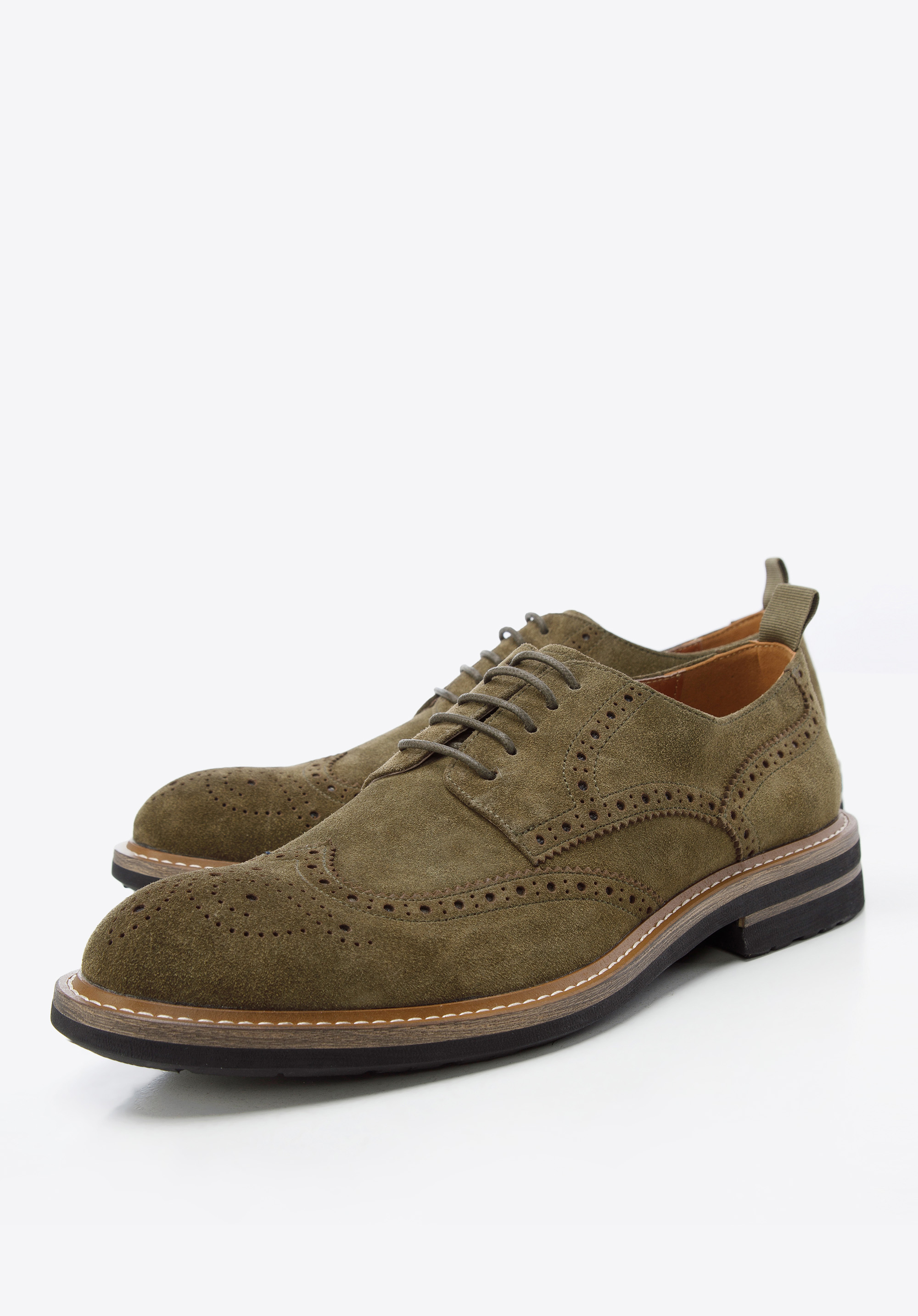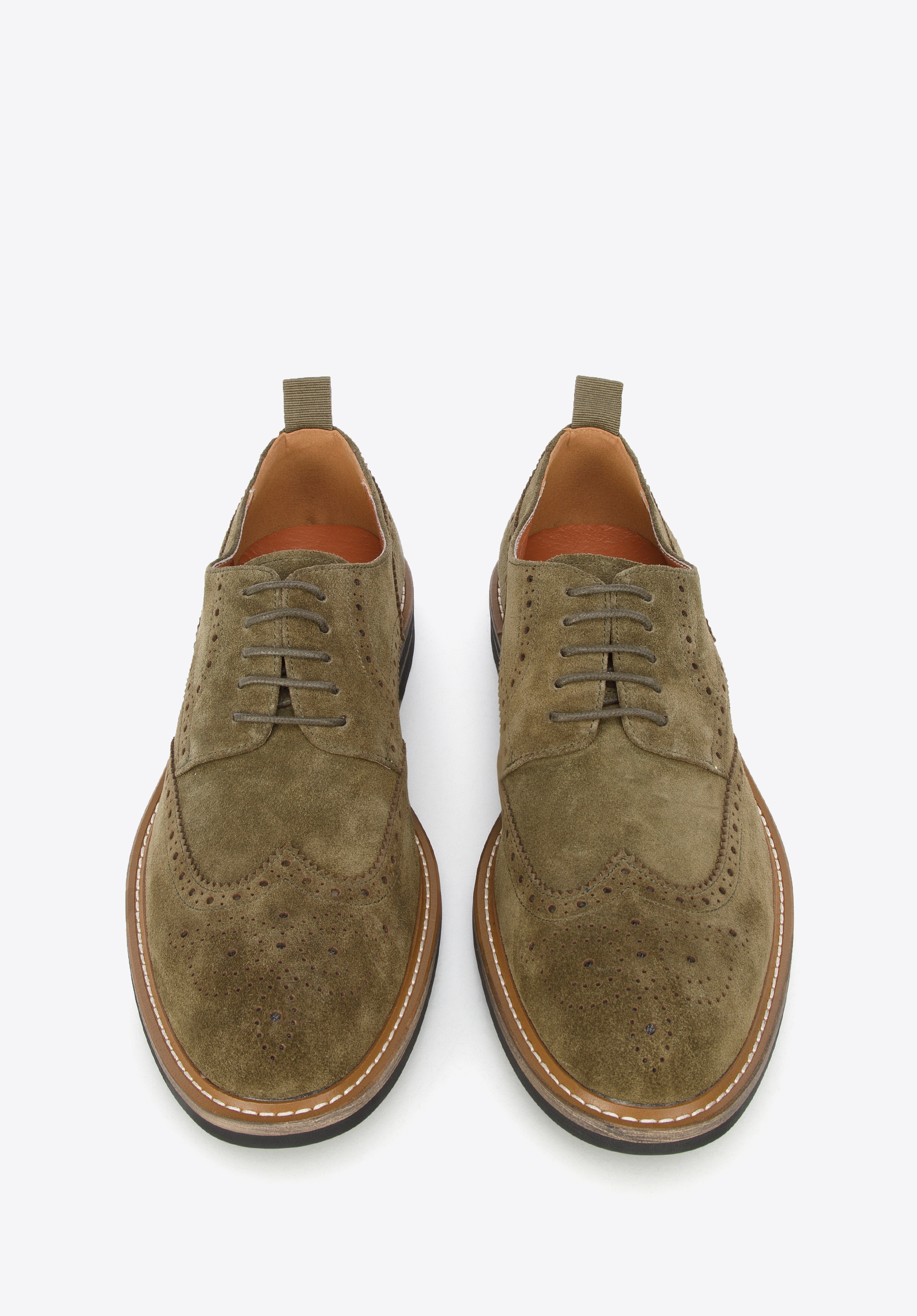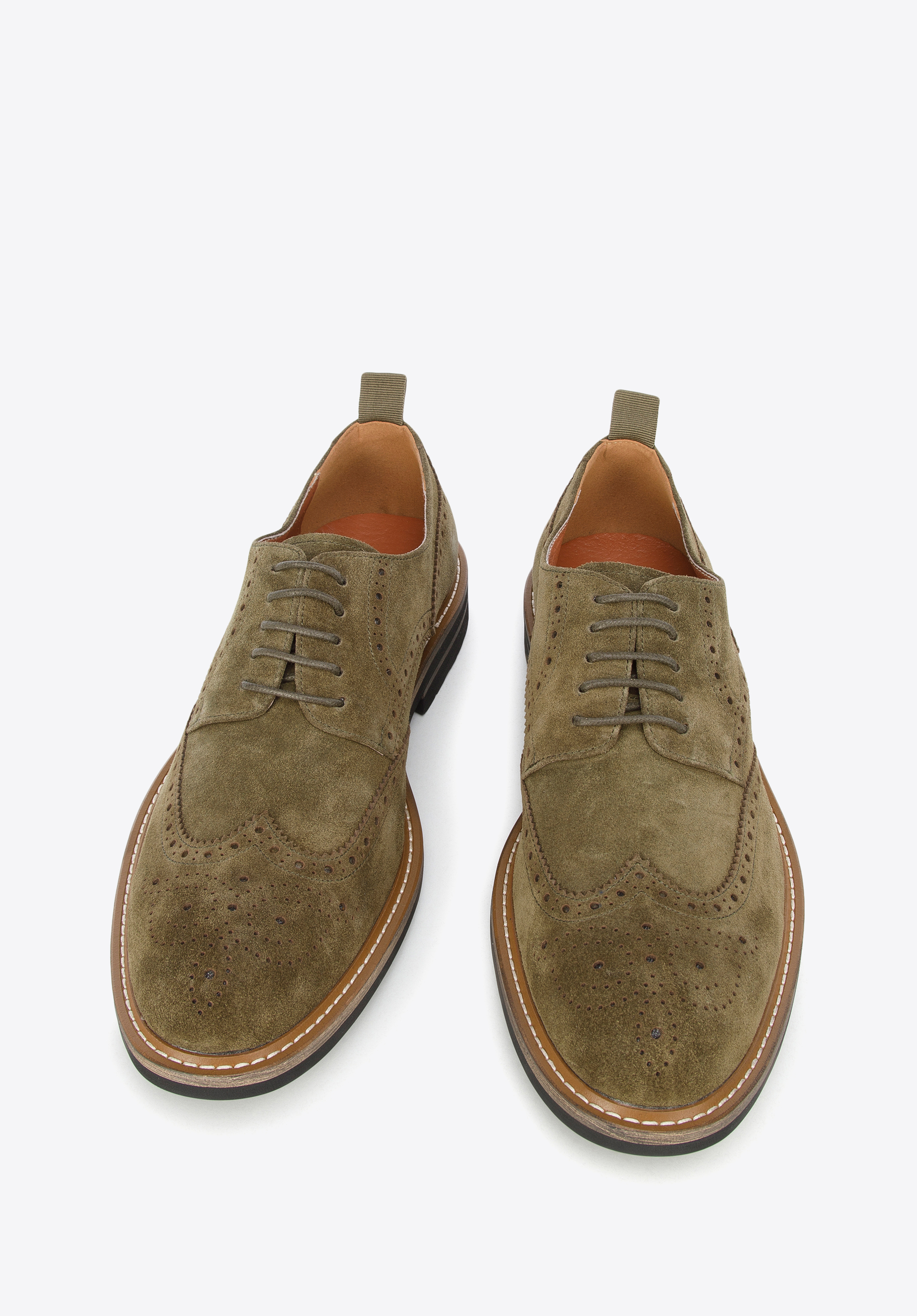 Стильні чоловічі броги - вічний вибір для кожного елегантного чоловіка. Дана модель виготовлена з високоякісної замшевої шкіри. Вони мають характерні декоративні перфорації на носку і з боків, що надає їм шикарний вигляд. Все це доповнюється підошвою, обробленою контрастною ниткою, і двоколірним каблуком. Чоловічі замшеві броги з контрастною ниткою - це класика в сучасному відтінку, яку варто мати у своєму гардеробі.