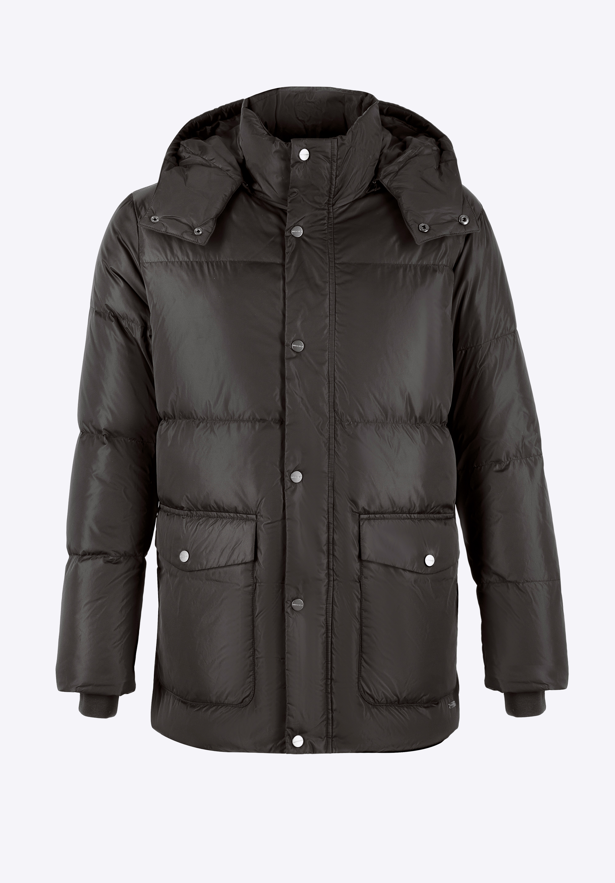 Дізнайтеся, як чоловіча елегантність поєднується з майстерністю в цьому пуховику зі знімним капюшоном.