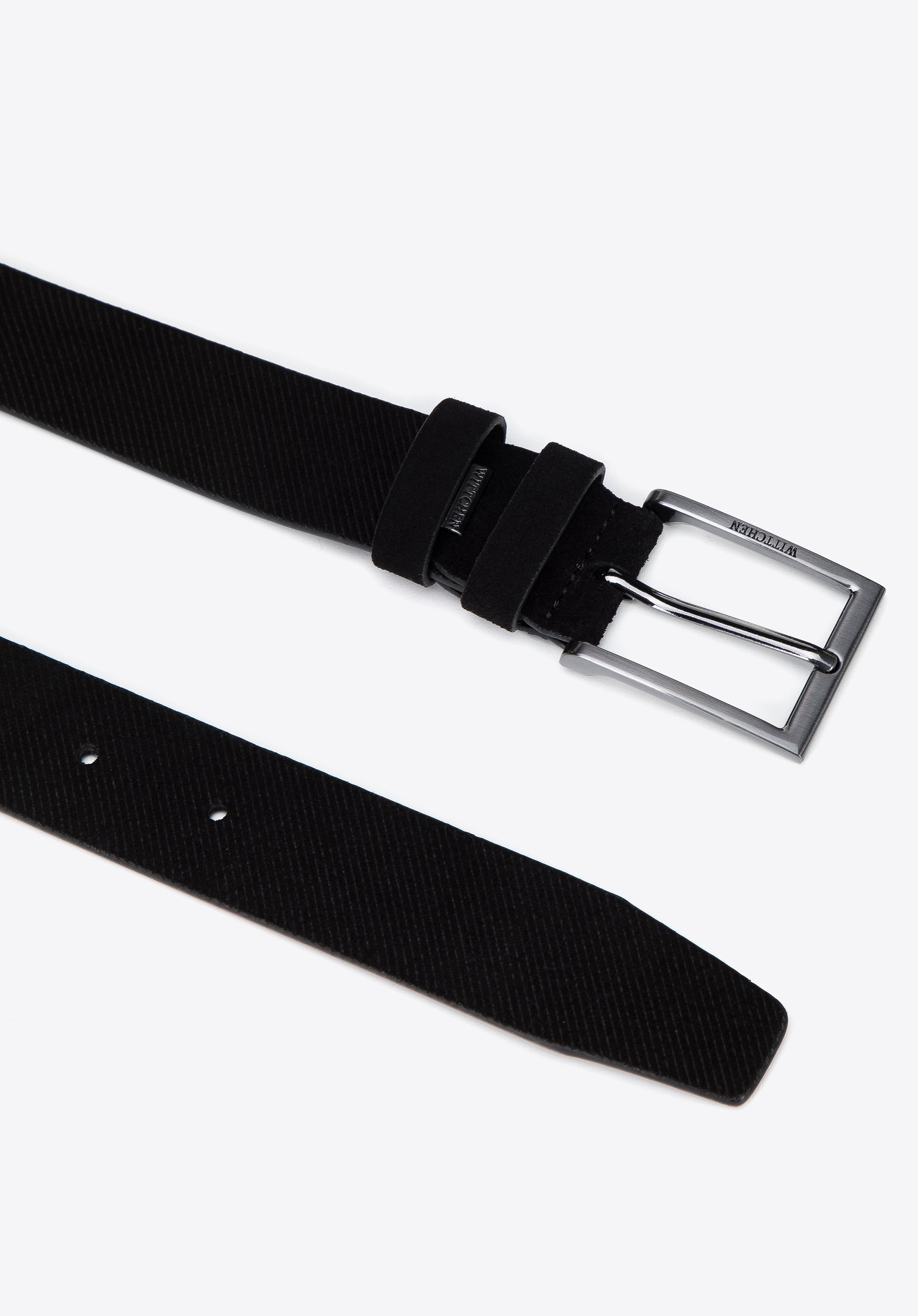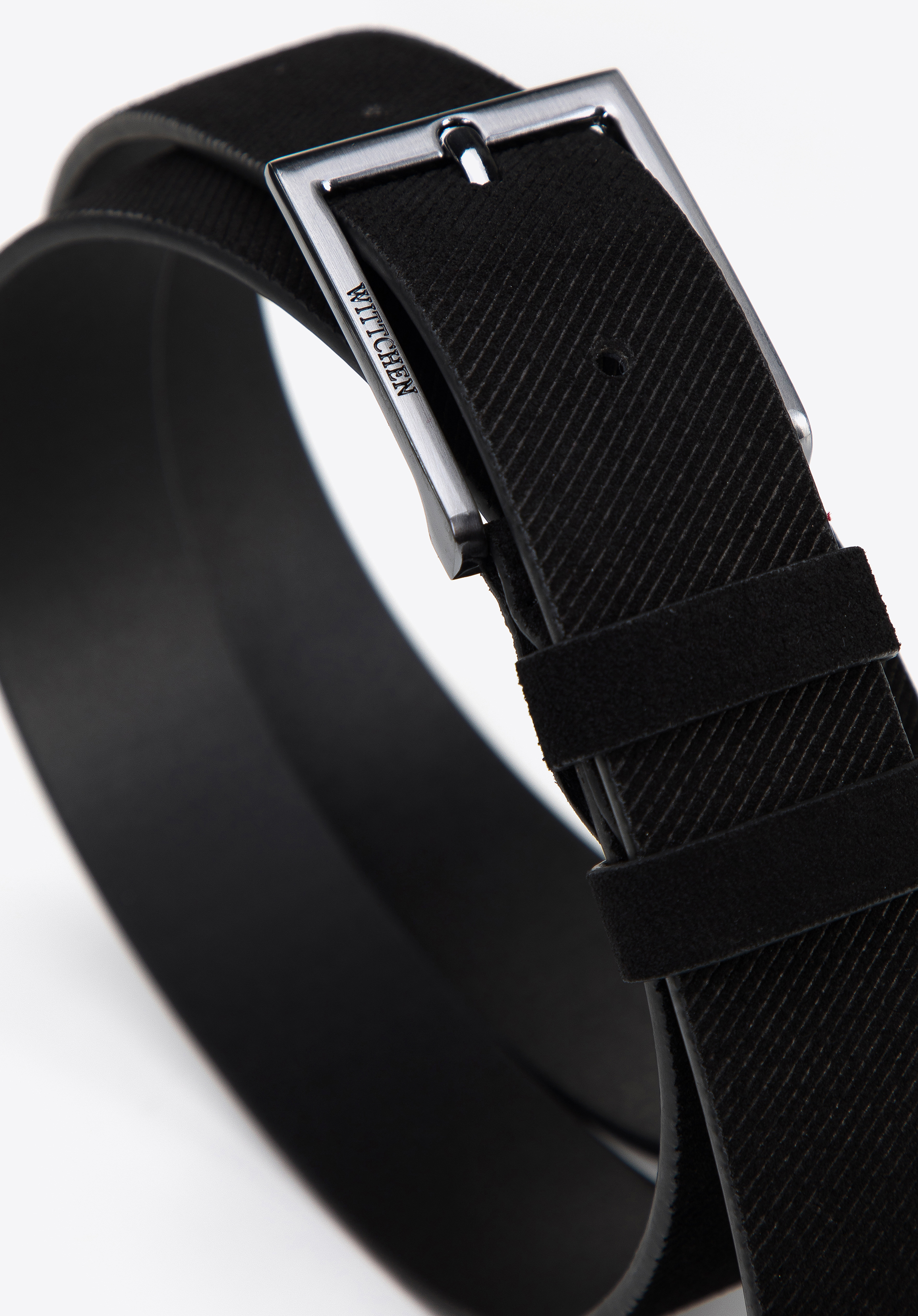 Цей чоловічий ремінь додасть нового стилю вашому гардеробу. Виготовлений з високоякісної замшевої шкіри з тисненням з непомітними діагональними смугами. Елегантності йому додає елегантна графітова пряжка. Носіть його з неформальними фасонами, джинсами або вельветом - ви будете виглядати стильно в будь-якій ситуації. Чоловічий замшевий ремінь з тисненням і смужками - це незамінний аксесуар, який стане в нагоді на багато випадків.