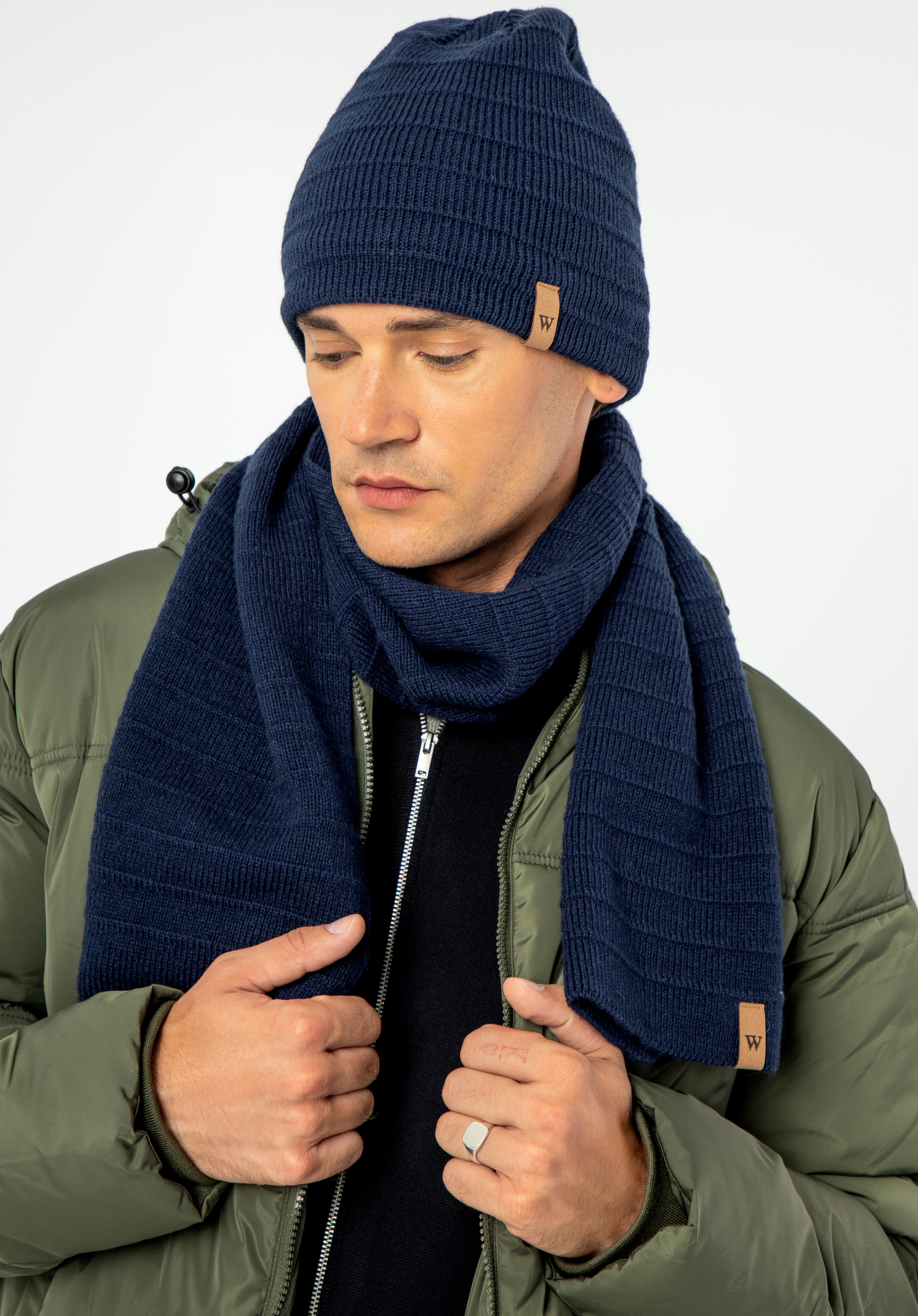 Чоловічий зимовий комплект (шапка і шарф)- обов''язковий для кожного, хто цінує елегантність і комфорт у холодні дні. Виготовлений із поєднання вовни та акрилу, він чудово захищає від холоду, залишаючись легким і зручним у носінні. Тонкі горизонтальні смуги надають йому сучасний характер, а непомітний логотип виробника додає стильний акцент, підкреслюючи високу якість продукту.