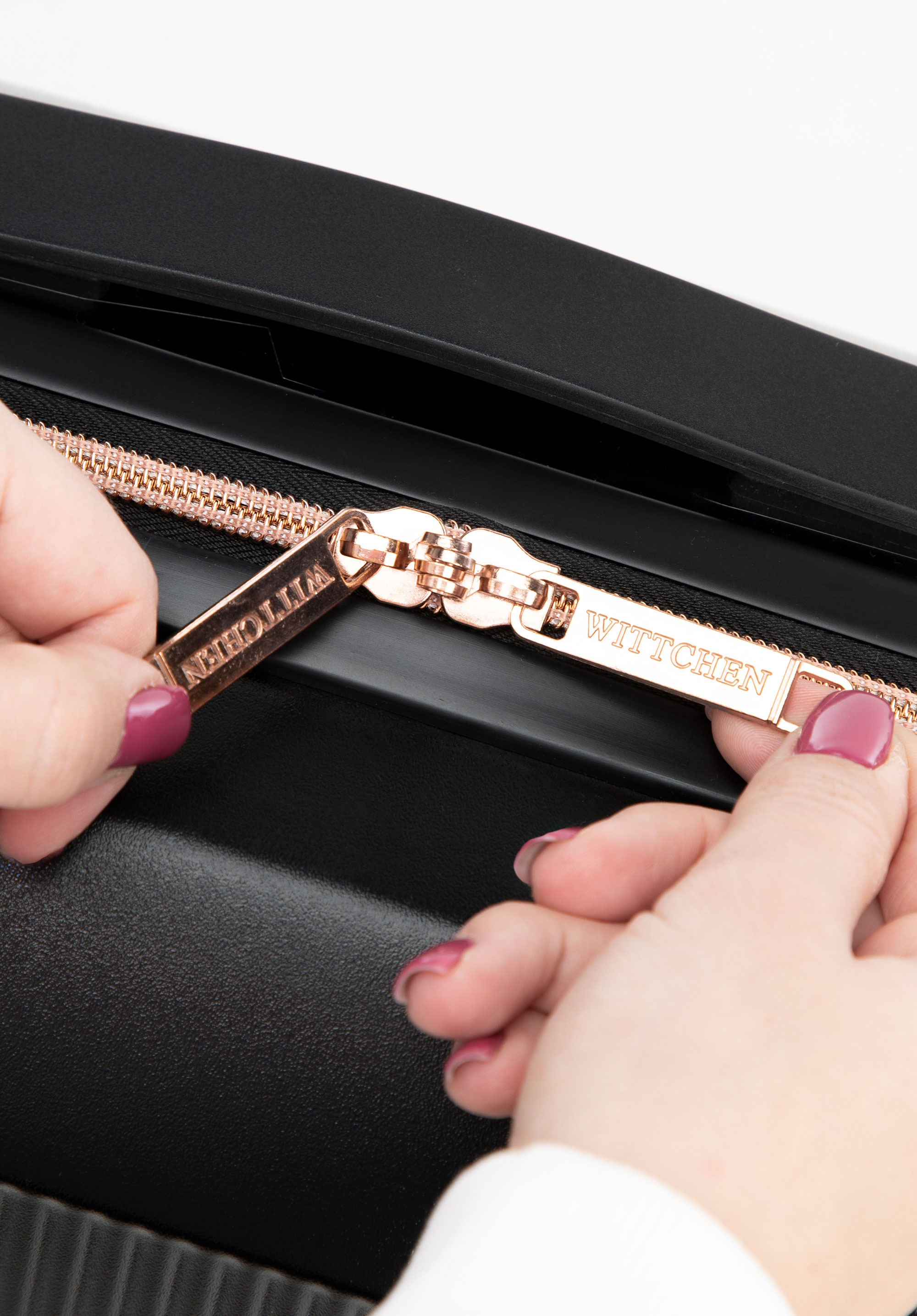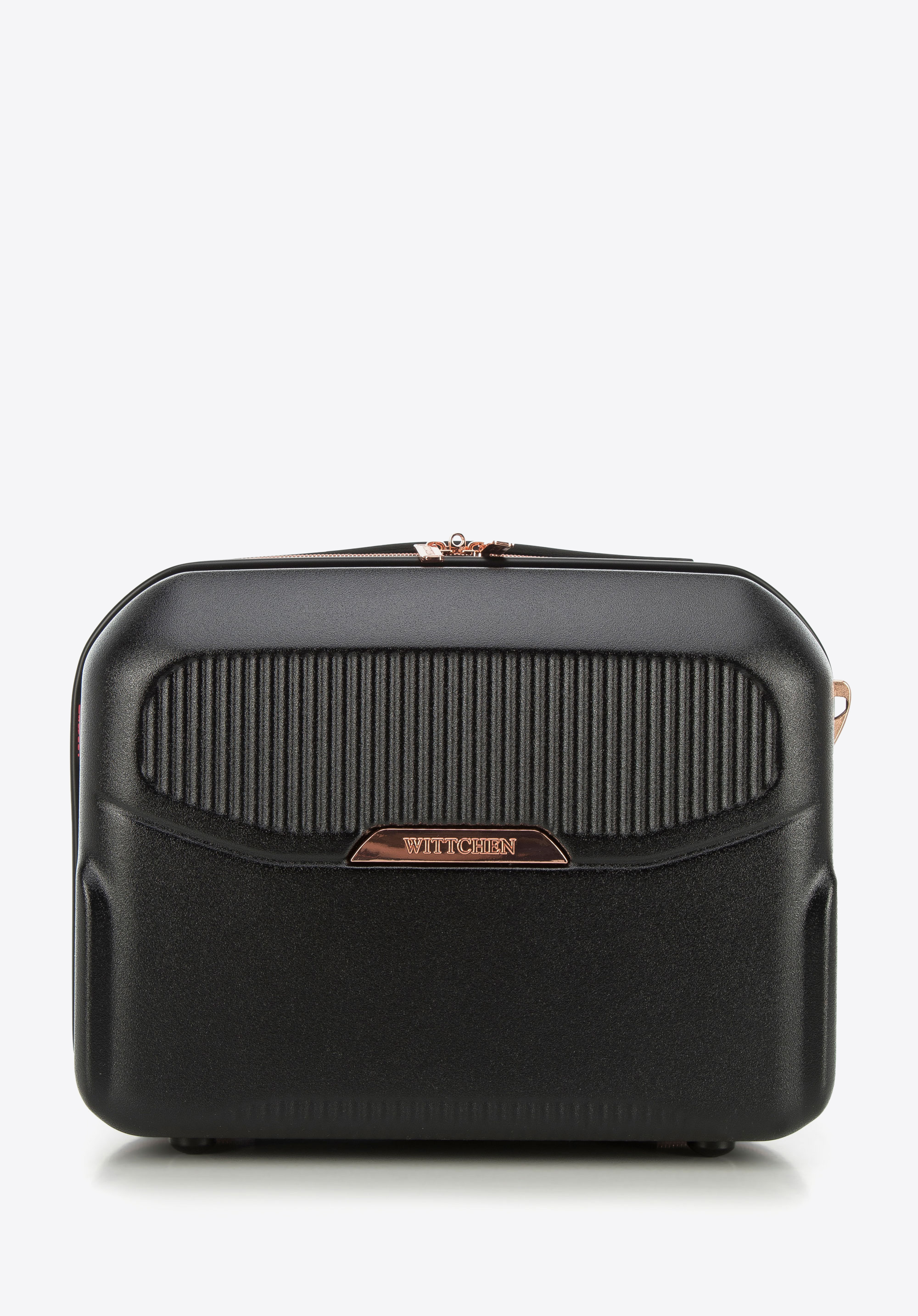 Ця стильна дорожня косметичка стане в нагоді кожній елегантній жінці. Вона виготовлена з міцного полікарбонату з фурнітурою кольору рожевого золота. У добре організований інтер’єр можна вмістити, наприклад, дорожній фен, шампунь, улюблені парфуми та іншу косметику. У центральну кишеню на блискавці можна сховати дрібні предмети. Ви можете комбінувати цю модель з валізами з цієї колекції і підтримувати незмінний вигляд у кожній поїздці. Дорожна косметичка з полікарбонату на блискавці кольору рожевого золота – практичний та елегантний аксесуар як для подорожей, так і для домашнього використання.