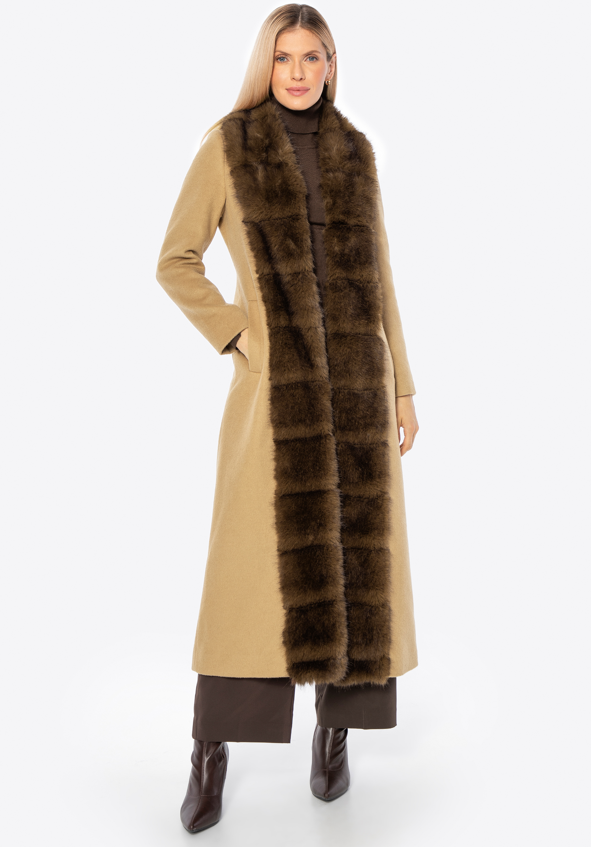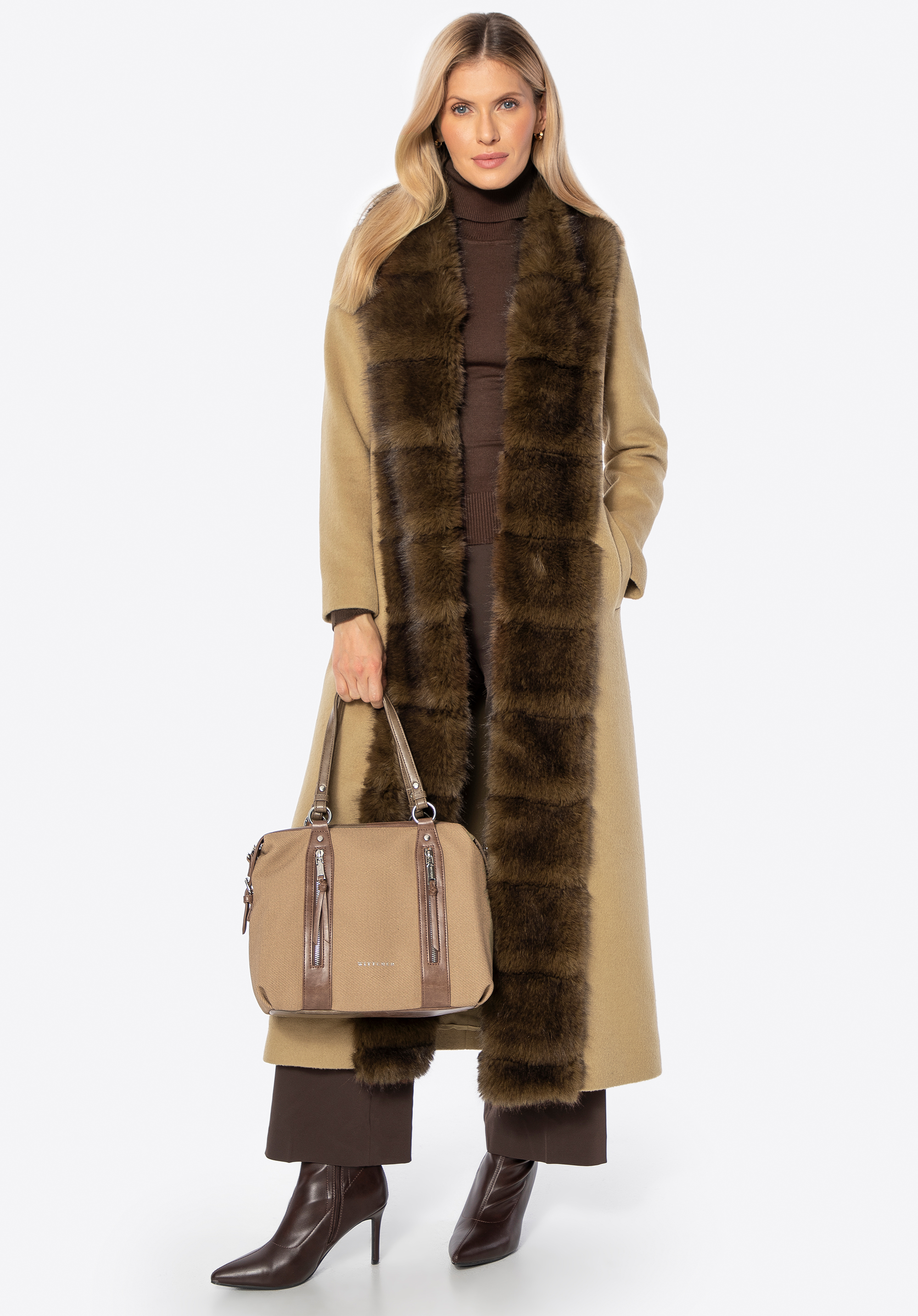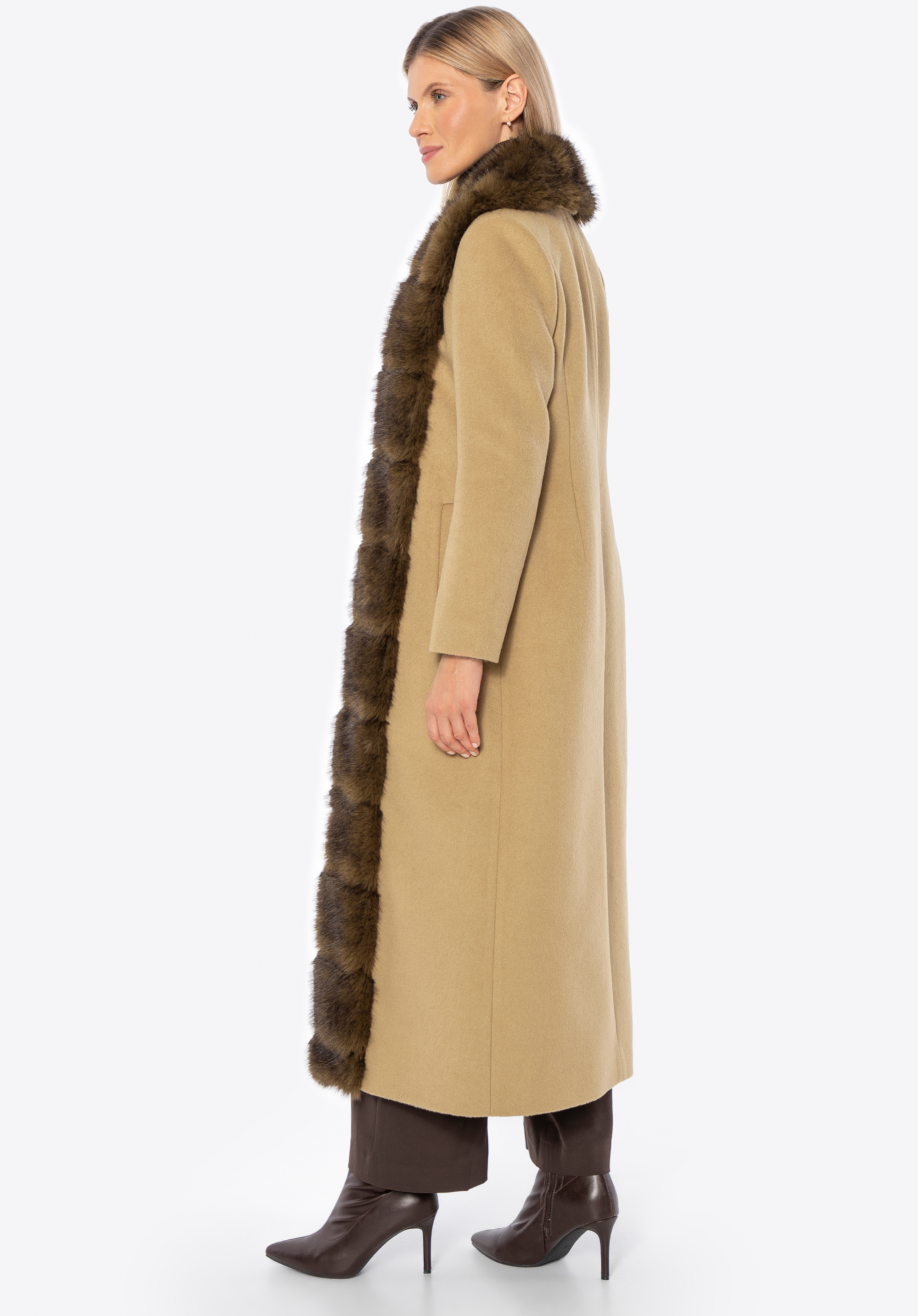 Це елегантне, довге жіноче пальто виготовлене з суміші вовни та поліестеру, що забезпечує відмінний захист від холоду та вітру, одночасно гарантуючи комфорт носіння. Стильний відкладний комір, оздоблений м’яким штучним хутром, додає характеру та тонкої елегантності. Внутрішня частина виконана з гладкої підкладки з віскози, що підвищує комфорт навіть при тривалому носінні. Застібка на непомітні гачки зберігає мінімалістичний вигляд пальта, одночасно роблячи його зручним у використанні.