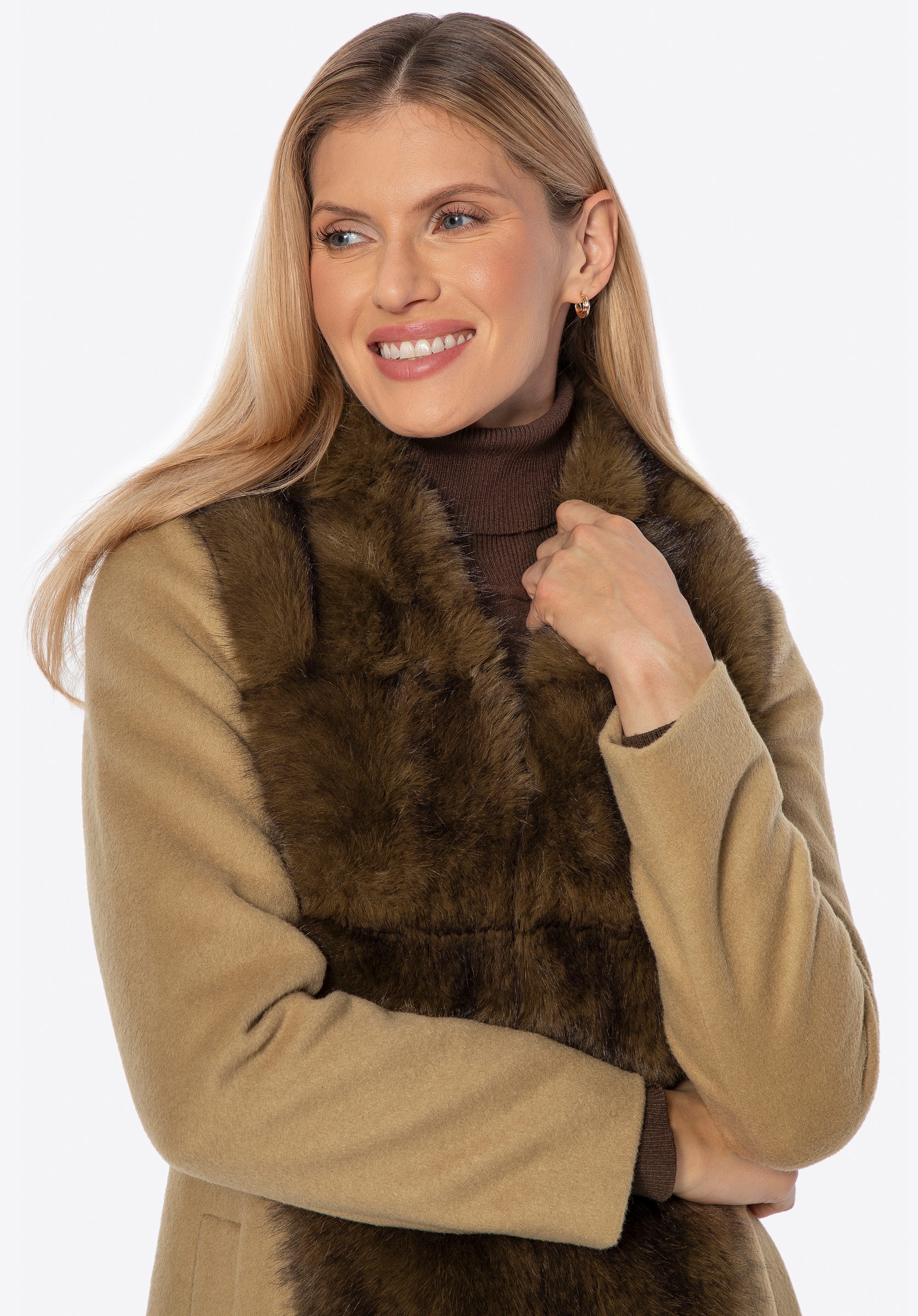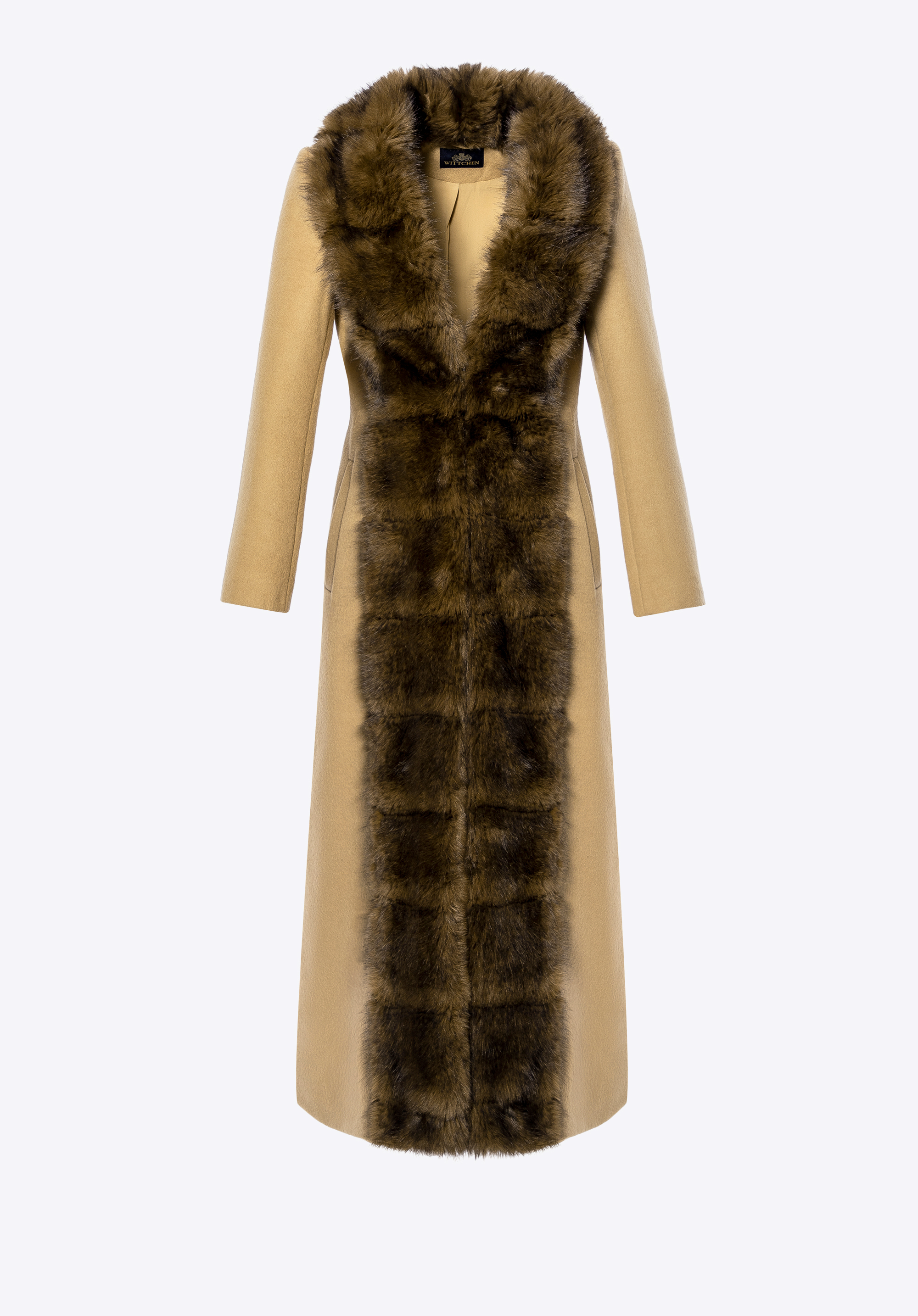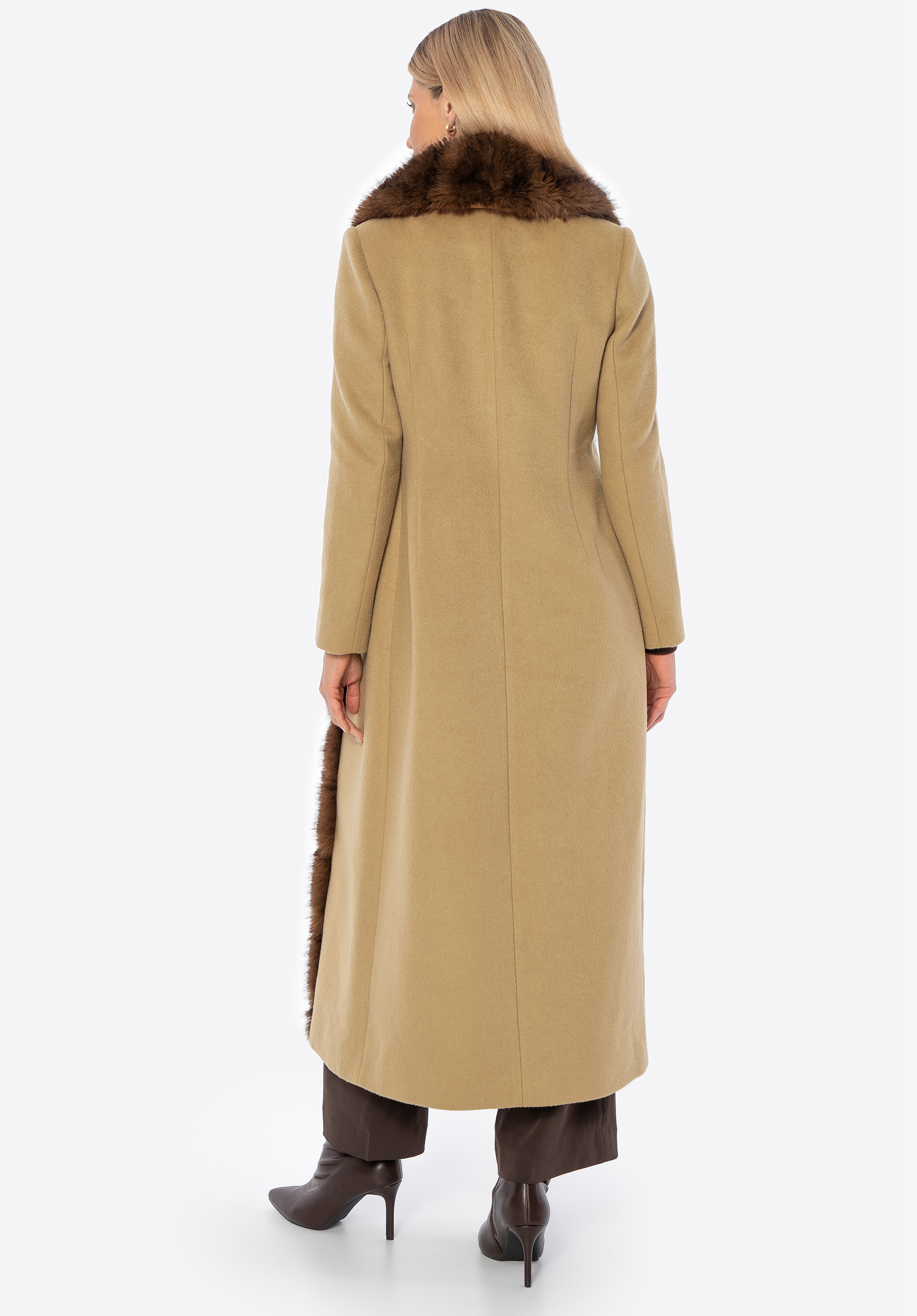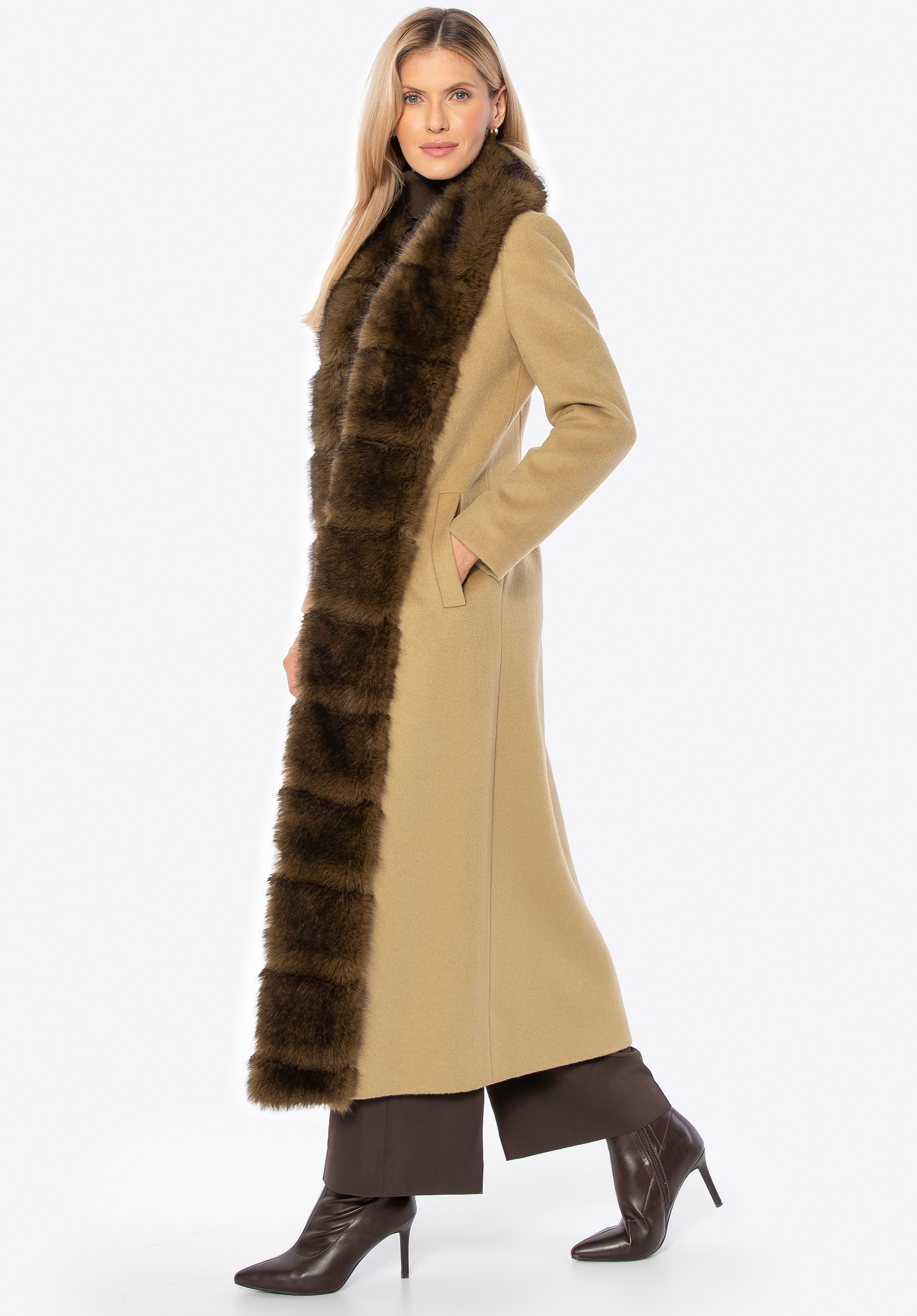 Це елегантне, довге жіноче пальто виготовлене з суміші вовни та поліестеру, що забезпечує відмінний захист від холоду та вітру, одночасно гарантуючи комфорт носіння. Стильний відкладний комір, оздоблений м’яким штучним хутром, додає характеру та тонкої елегантності. Внутрішня частина виконана з гладкої підкладки з віскози, що підвищує комфорт навіть при тривалому носінні. Застібка на непомітні гачки зберігає мінімалістичний вигляд пальта, одночасно роблячи його зручним у використанні.