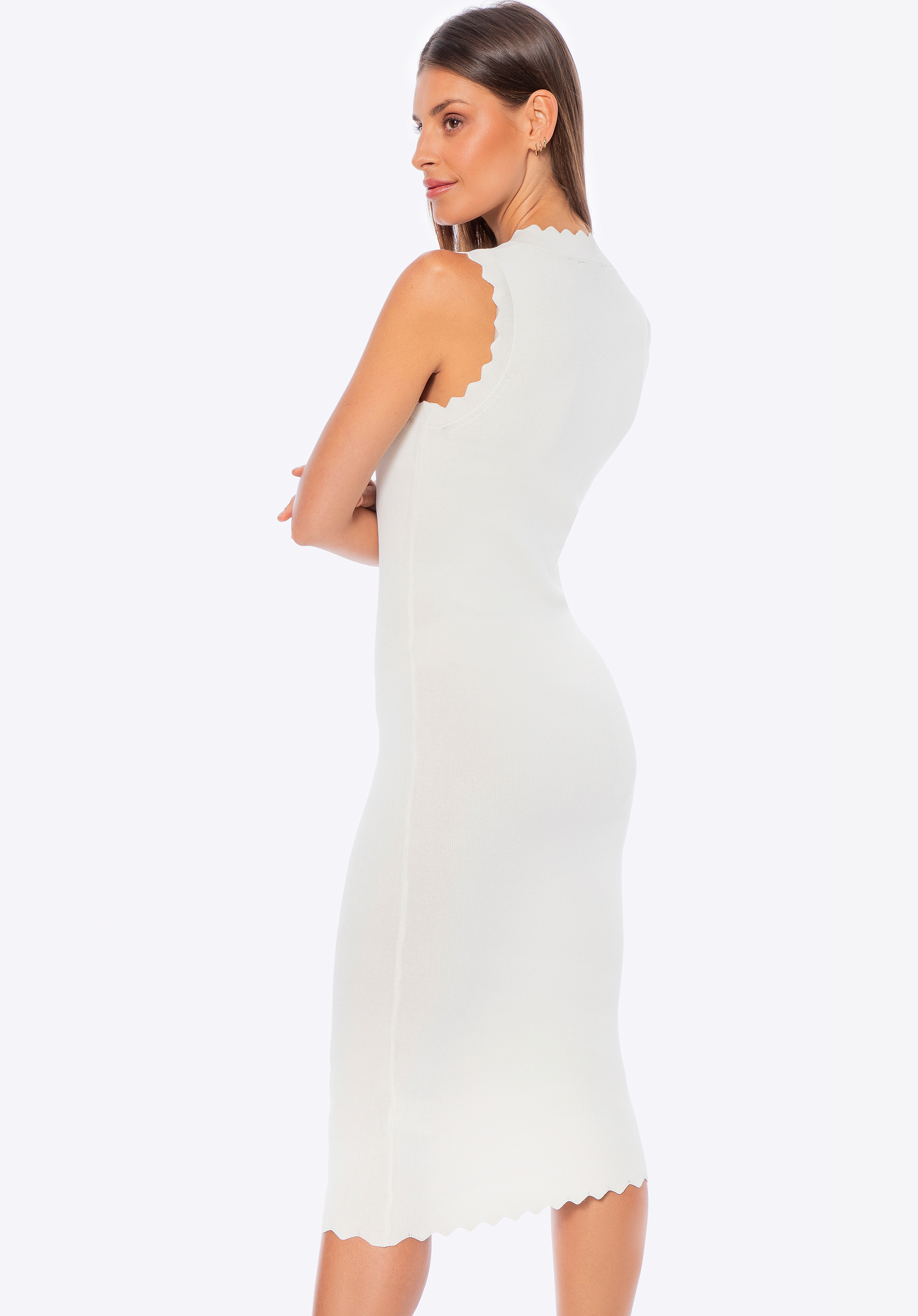 Ця сукня – ідеальний приклад того, як простота може поєднуватися з витонченими деталями, створюючи щось справді особливе. Виготовлена з м’якого, еластичного трикотажу з віскози та нейлону, вона ніжно облягає фігуру, підкреслюючи ваш силует, забезпечуючи комфорт протягом усього дня. Без рукавів і довжиною midi, ідеально підійде як для повсякденних, так і для більш офіційних образів. Унікальність сукні підкреслюють декоративні вирізи на декольте, бретельках і по краю – вони додають легкої витонченості та оригінальності, тонко підкреслюючи шкіру. Ретельно виконані оздоблення підвищують естетику та надають всьому образу жіночної елегантності.