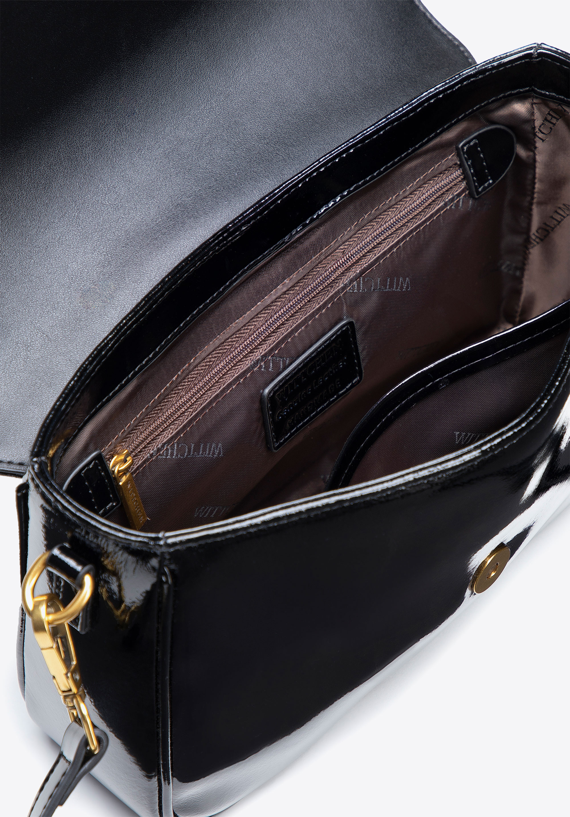 - Матеріал: Лакована натуральна шкіра вирізняється елегантним блиском та довговічністю, а панель під клапаном, плечовий ремінь та внутрішні елементи зі штучної шкіри додають легкості та забезпечують комфортне щоденне носіння.