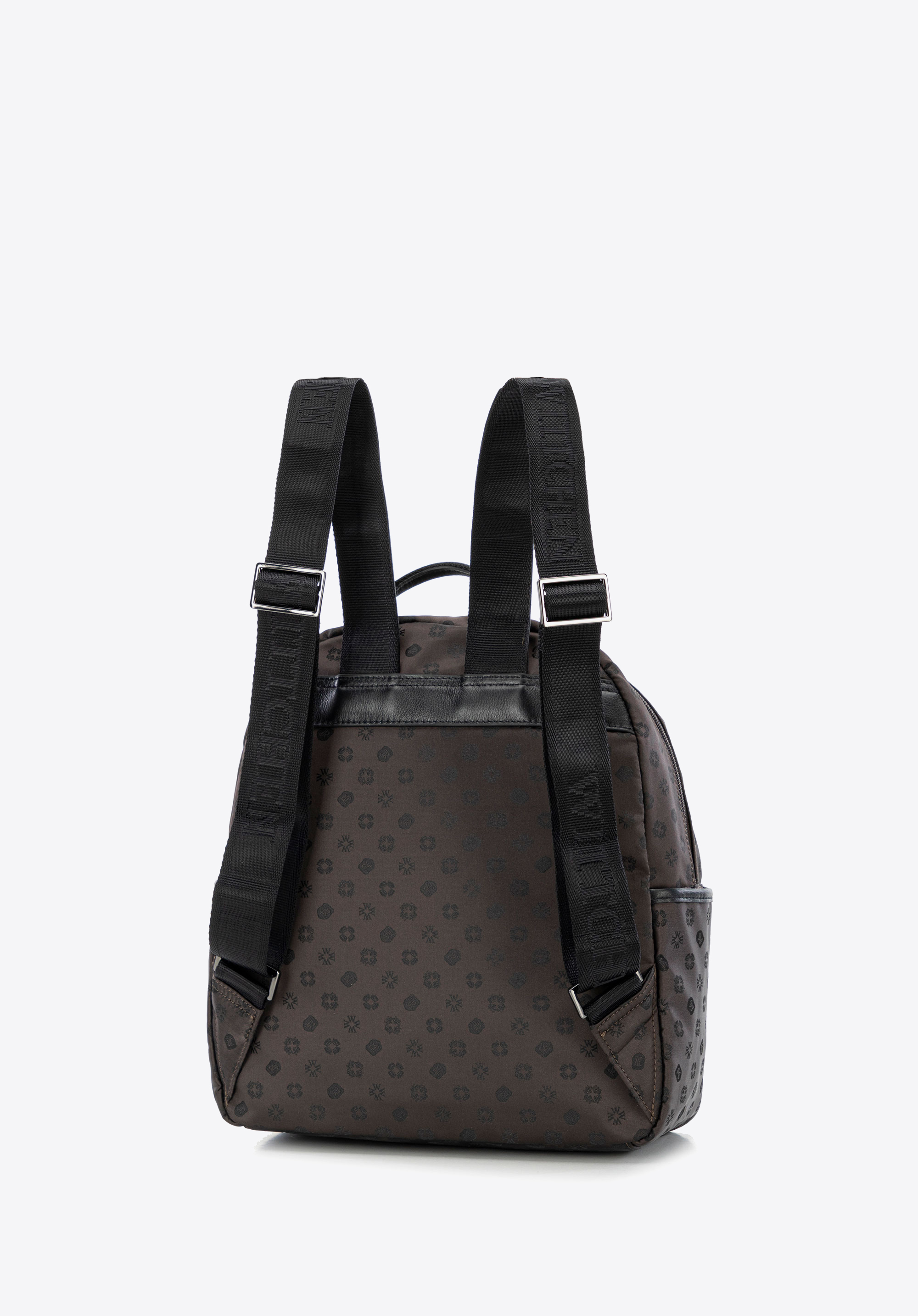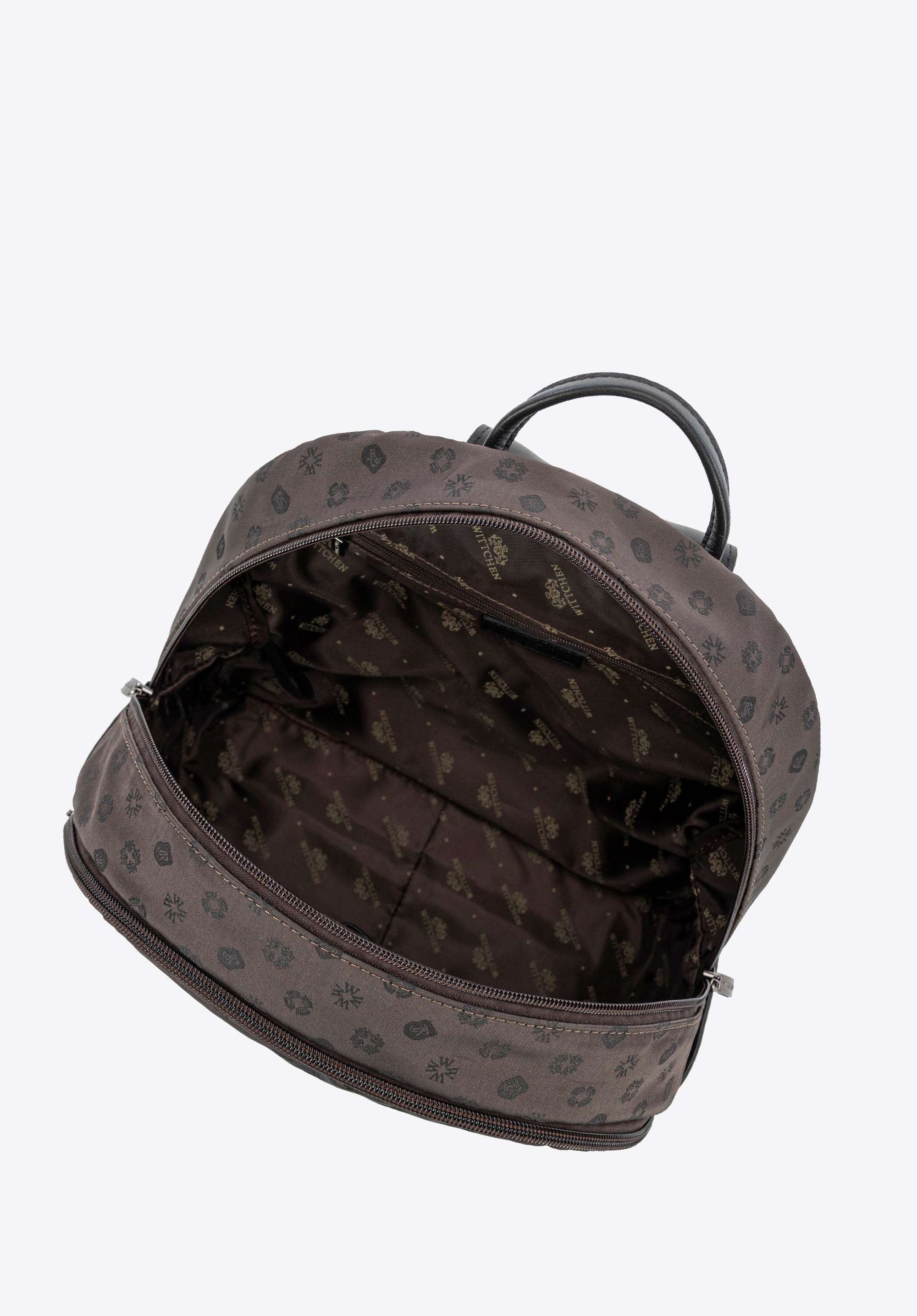 Цей рюкзак втілює міську елегантність у кожній деталі. Його елегантний матеріал з тонким блиском, прикрашений тисненими монограмами, робить його ідеальним вибором для жінок, які цінують класичний стиль із сучасними відтінками. Привертають увагу деталі, такі як деталі з натуральної шкіри на ручці, ременях і обробці кишень, підкреслюють його розкішний характер, забезпечуючи при цьому довговічність і комфорт. Цей жіночий рюкзак надзвичайно добре організований і може вмістити всі необхідні речі.