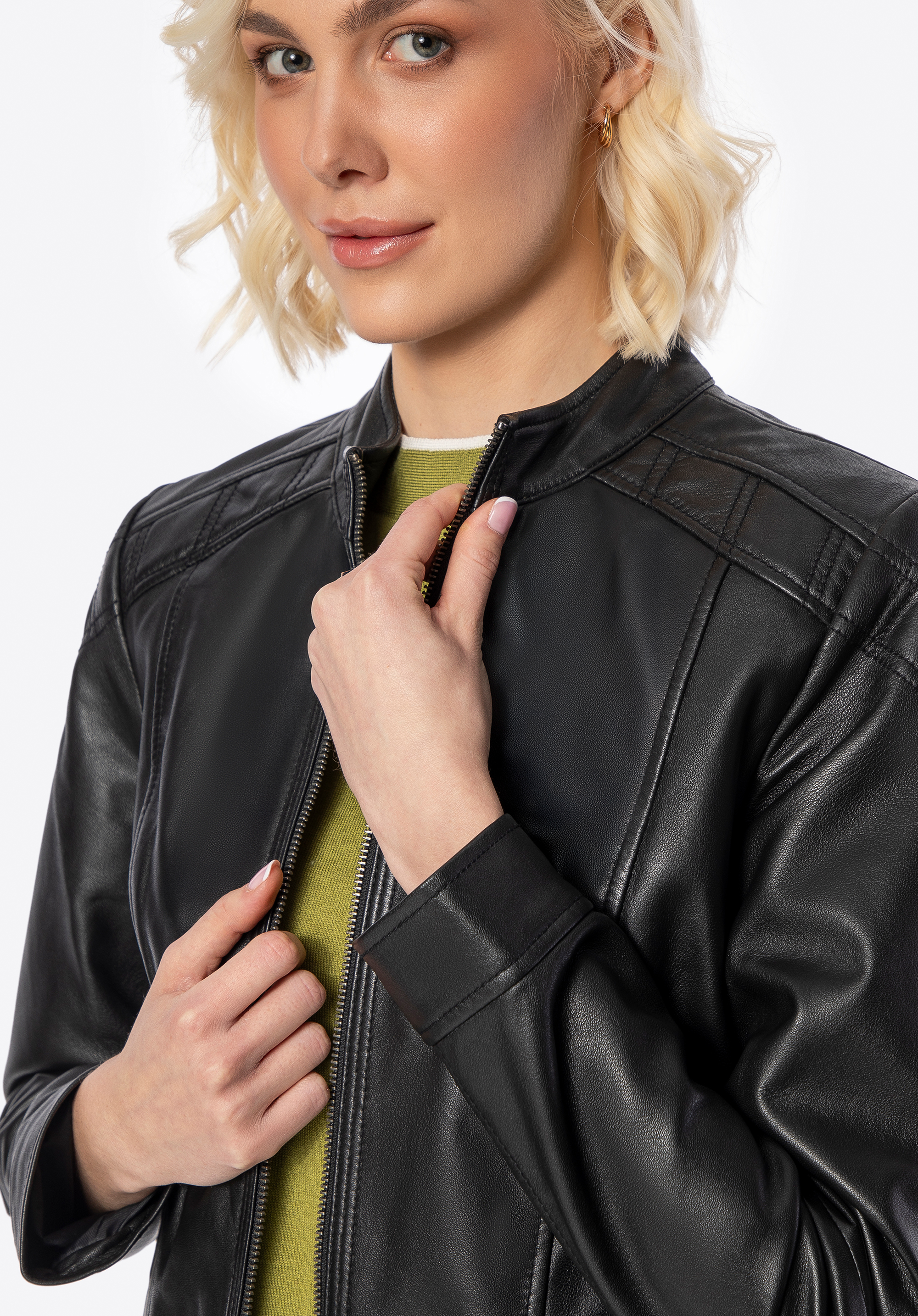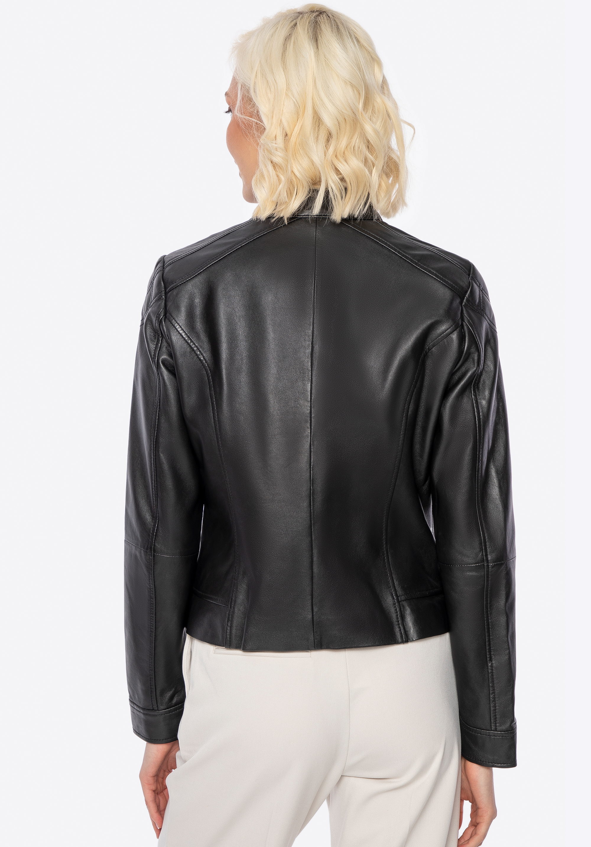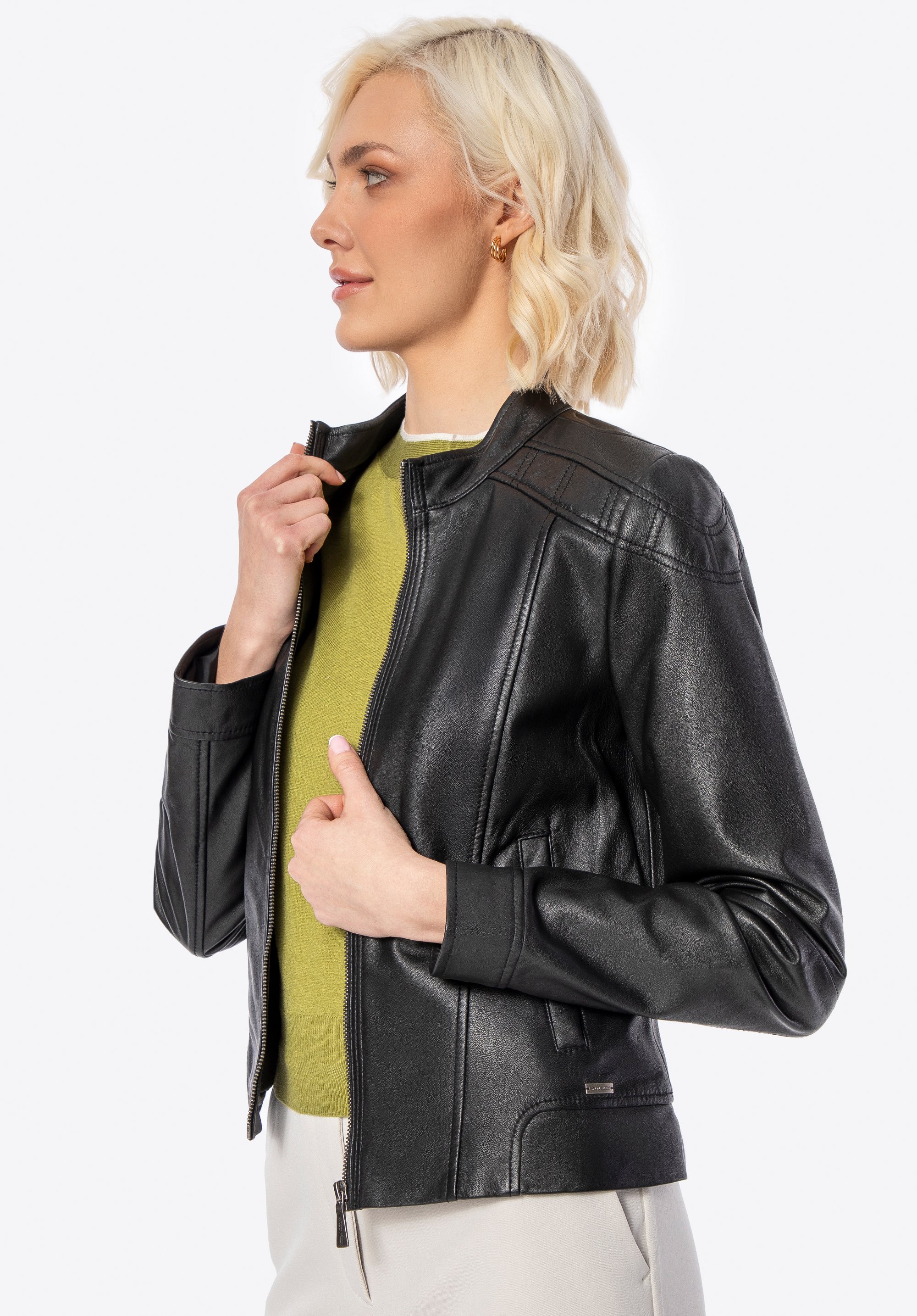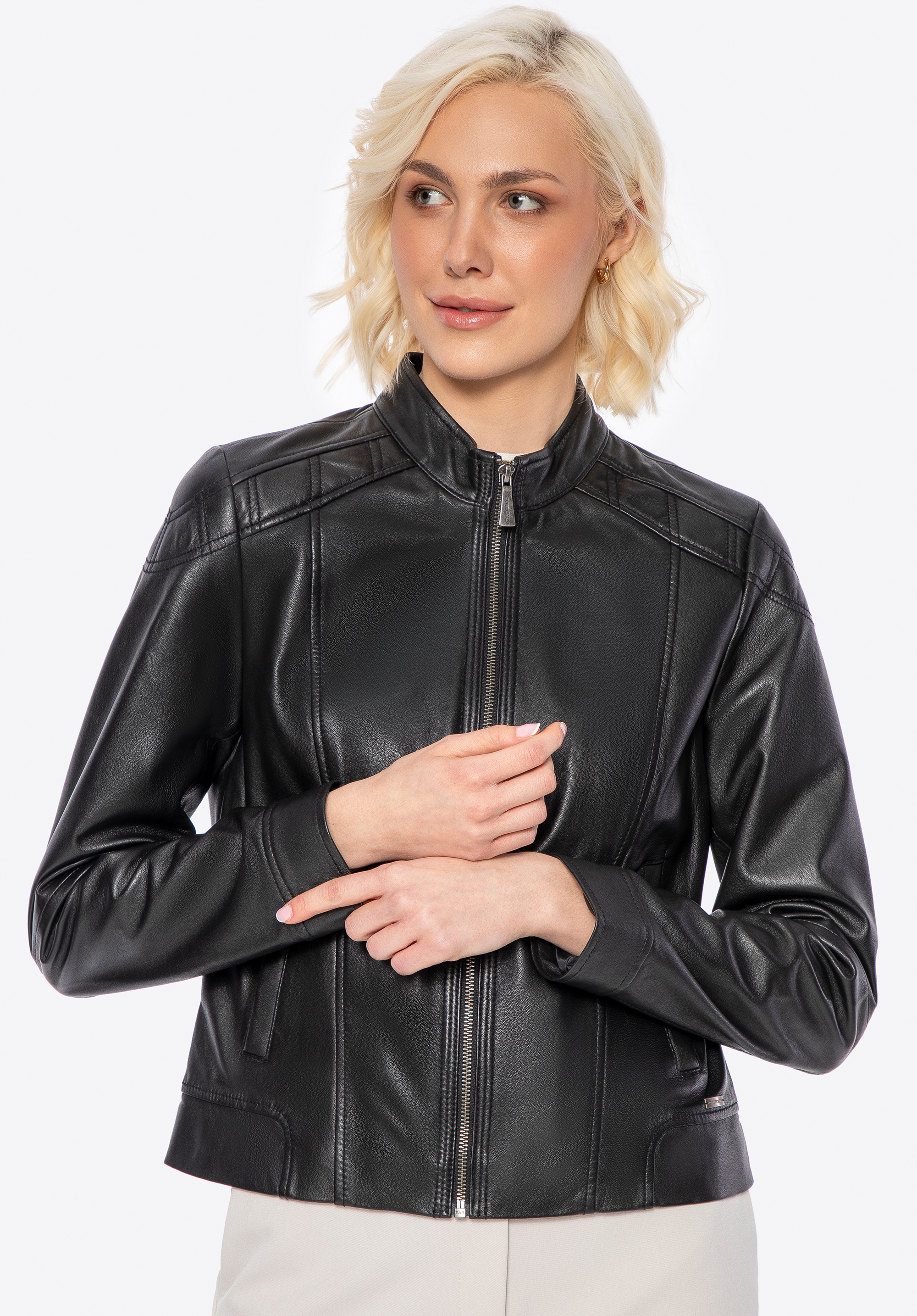 Розкіш у найкращому її прояві. Ця виняткова куртка з натуральної овечої шкіри — це втілення класики в поєднанні з сучасними тенденціями. Досконалий крій, витончені шви на плечах та деталі, що привертають увагу, створюють ідеальну пропозицію для жінок, які цінують високу якість та елегантний вигляд. Коротший, приталений крій підкреслює силует, а класичний комір надає всьому образу шикарного характеру.