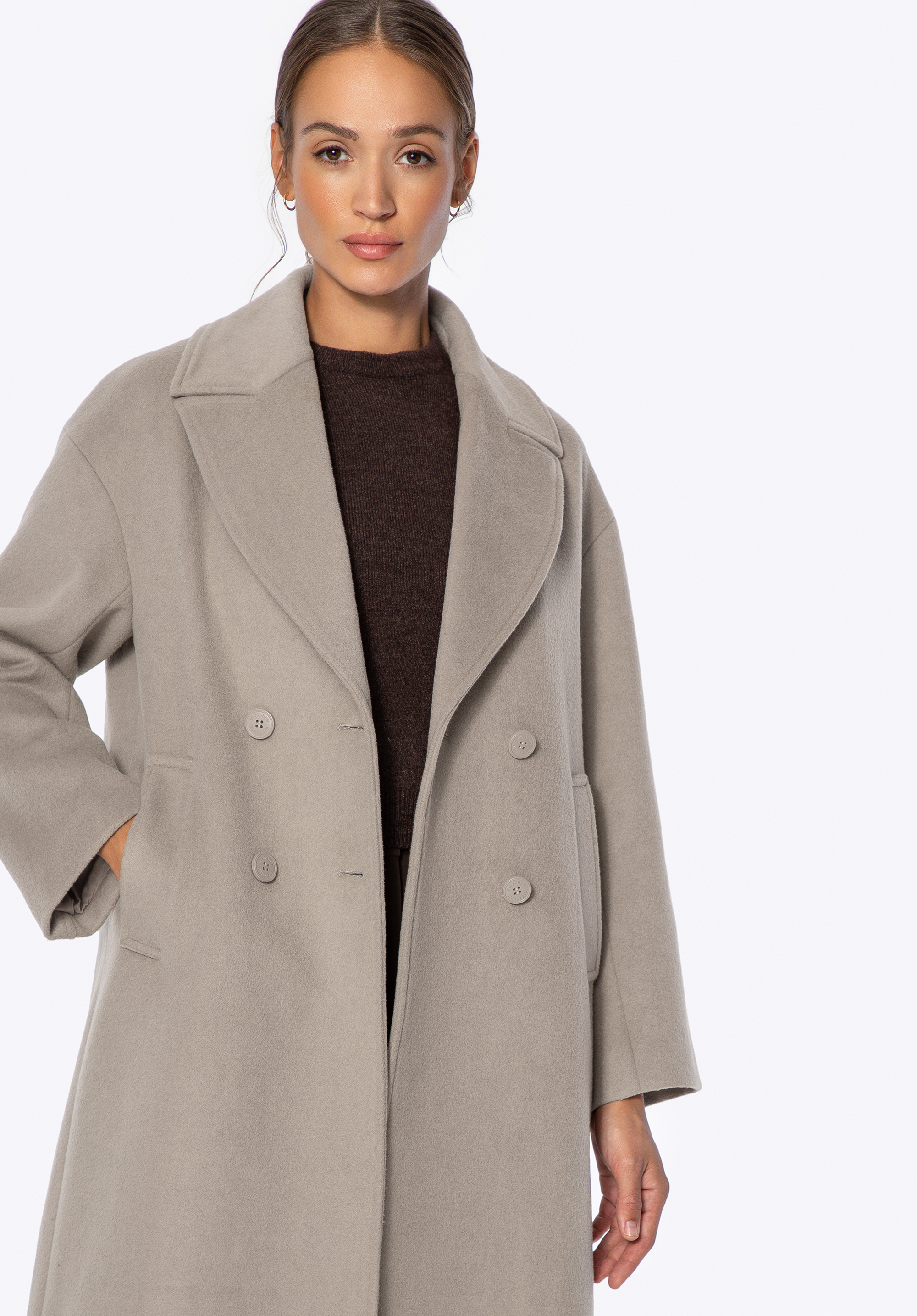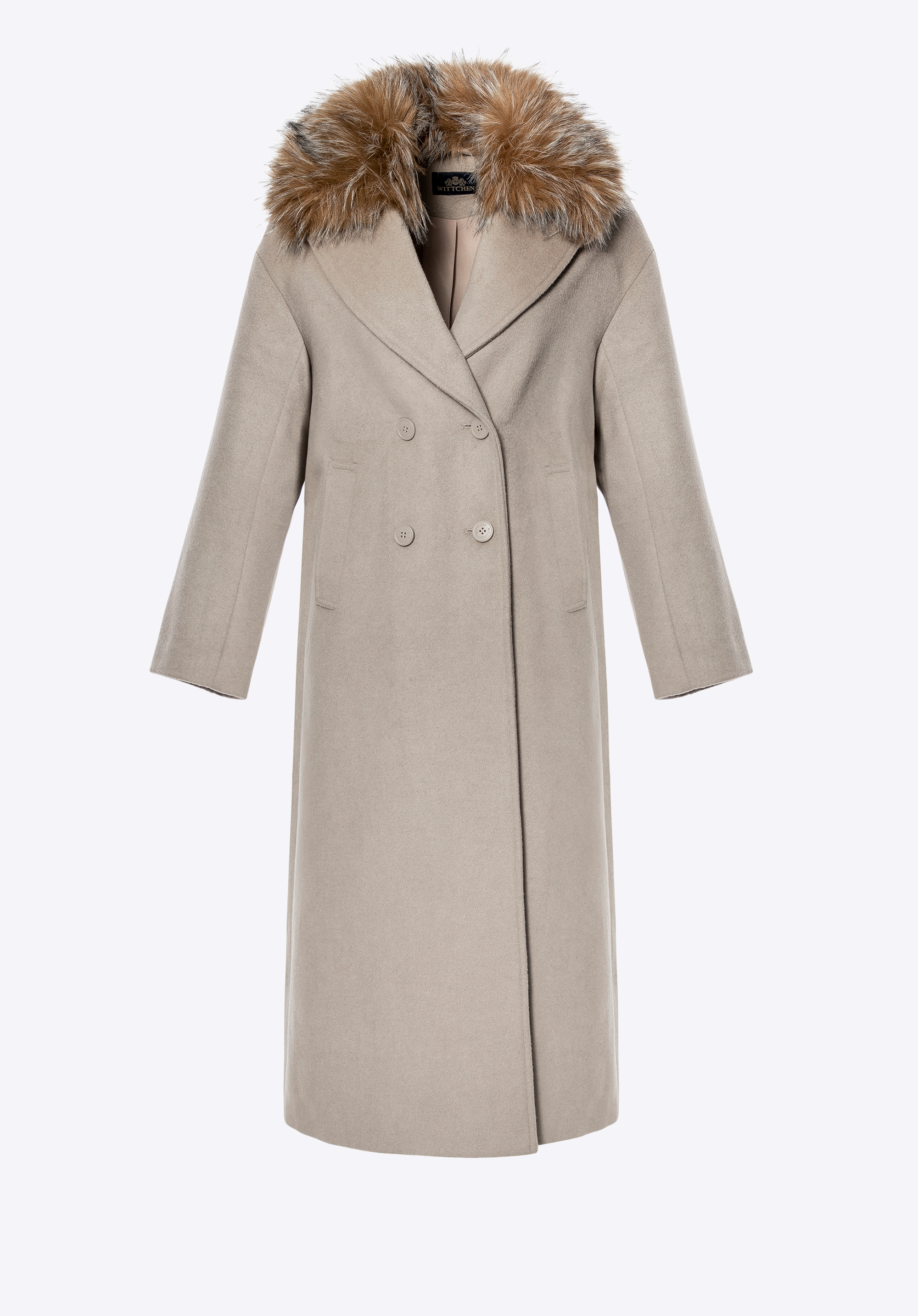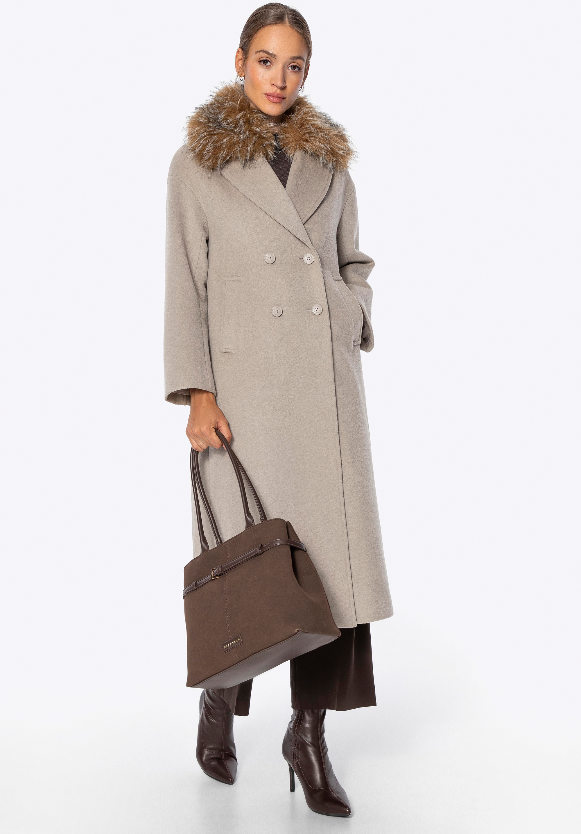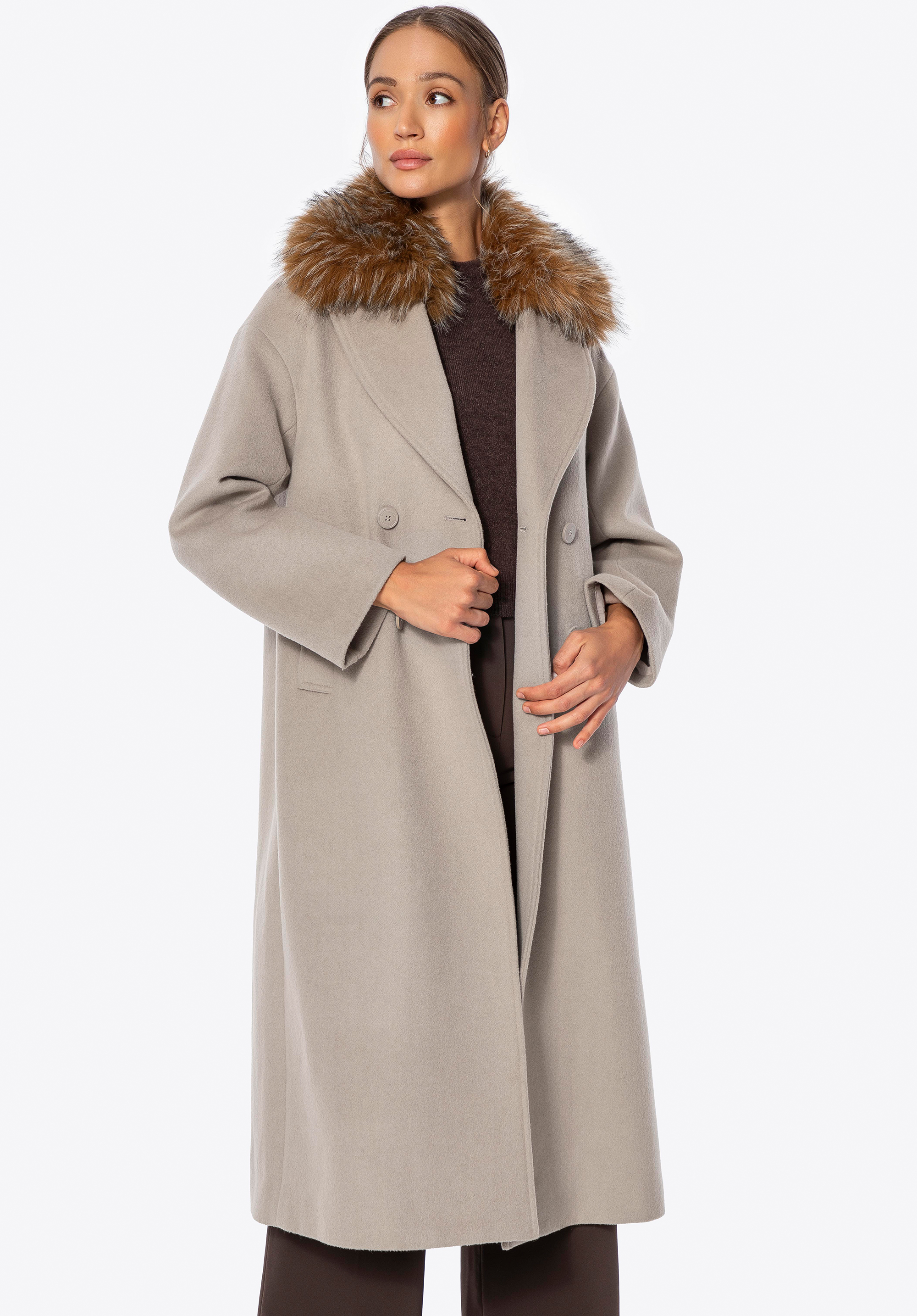 Це елегантне, двобортне жіноче пальто — позачасова пропозиція для прохолодних днів. Виготовлене з вовни та поліестеру, воно забезпечує тепловий комфорт і довговічність на багато сезонів. Класичний відкладний комір із можливістю прикріплення м’якого штучного хутра дозволяє змінювати характер стилю — від мінімалістичної елегантності до вишуканого зимового образу. Внутрішня частина оздоблена гладкою віскозною підкладкою, що підвищує комфорт під час носіння. Модель застібається на гудзики, підкреслюючи її класичний, стриманий крій.