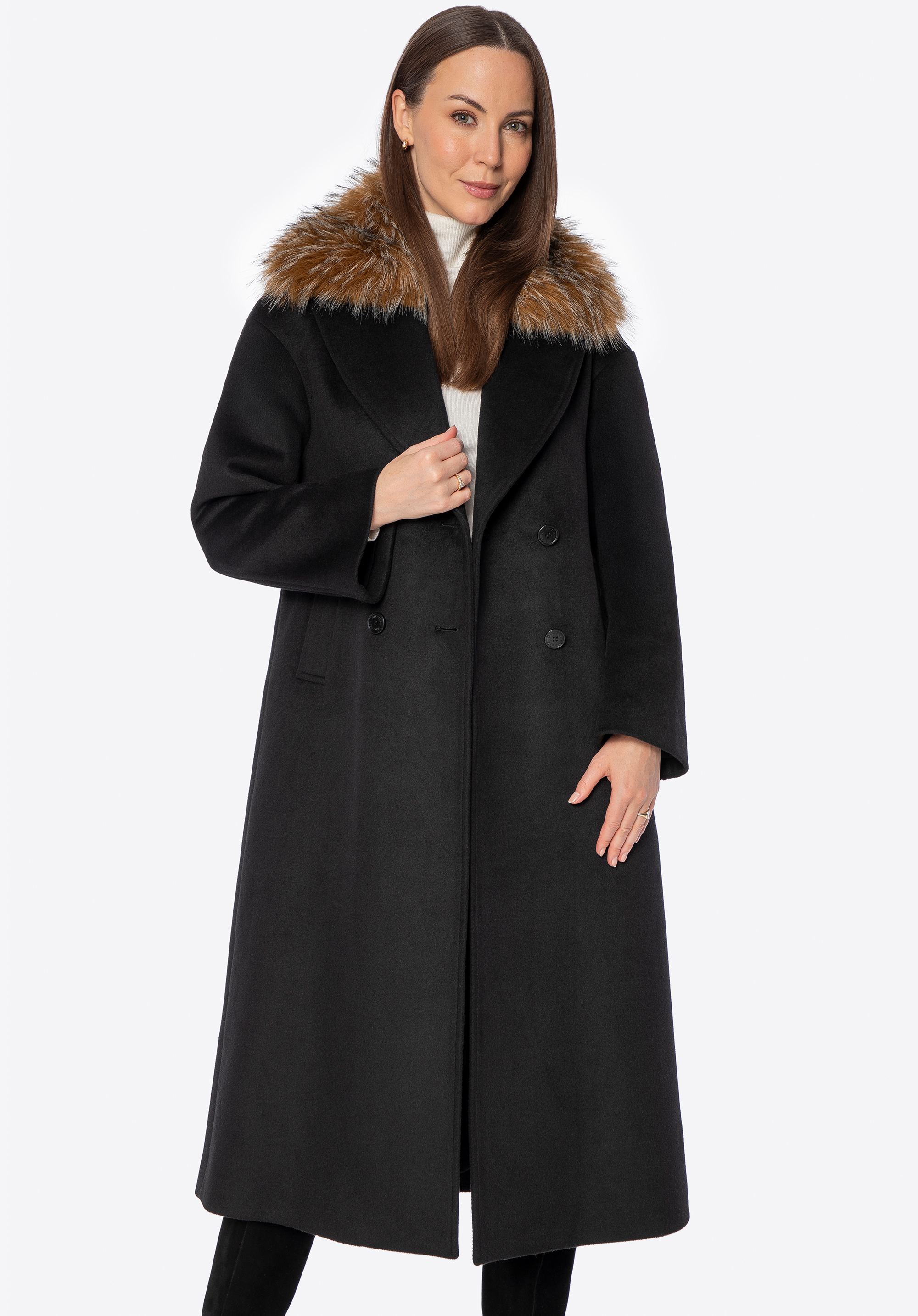 Це елегантне, двобортне жіноче пальто — позачасова пропозиція для прохолодних днів. Виготовлене з вовни та поліестеру, воно забезпечує тепловий комфорт і довговічність на багато сезонів. Класичний відкладний комір із можливістю прикріплення м’якого штучного хутра дозволяє змінювати характер стилю — від мінімалістичної елегантності до вишуканого зимового образу. Внутрішня частина оздоблена гладкою віскозною підкладкою, що підвищує комфорт під час носіння. Модель застібається на гудзики, підкреслюючи її класичний, стриманий крій.