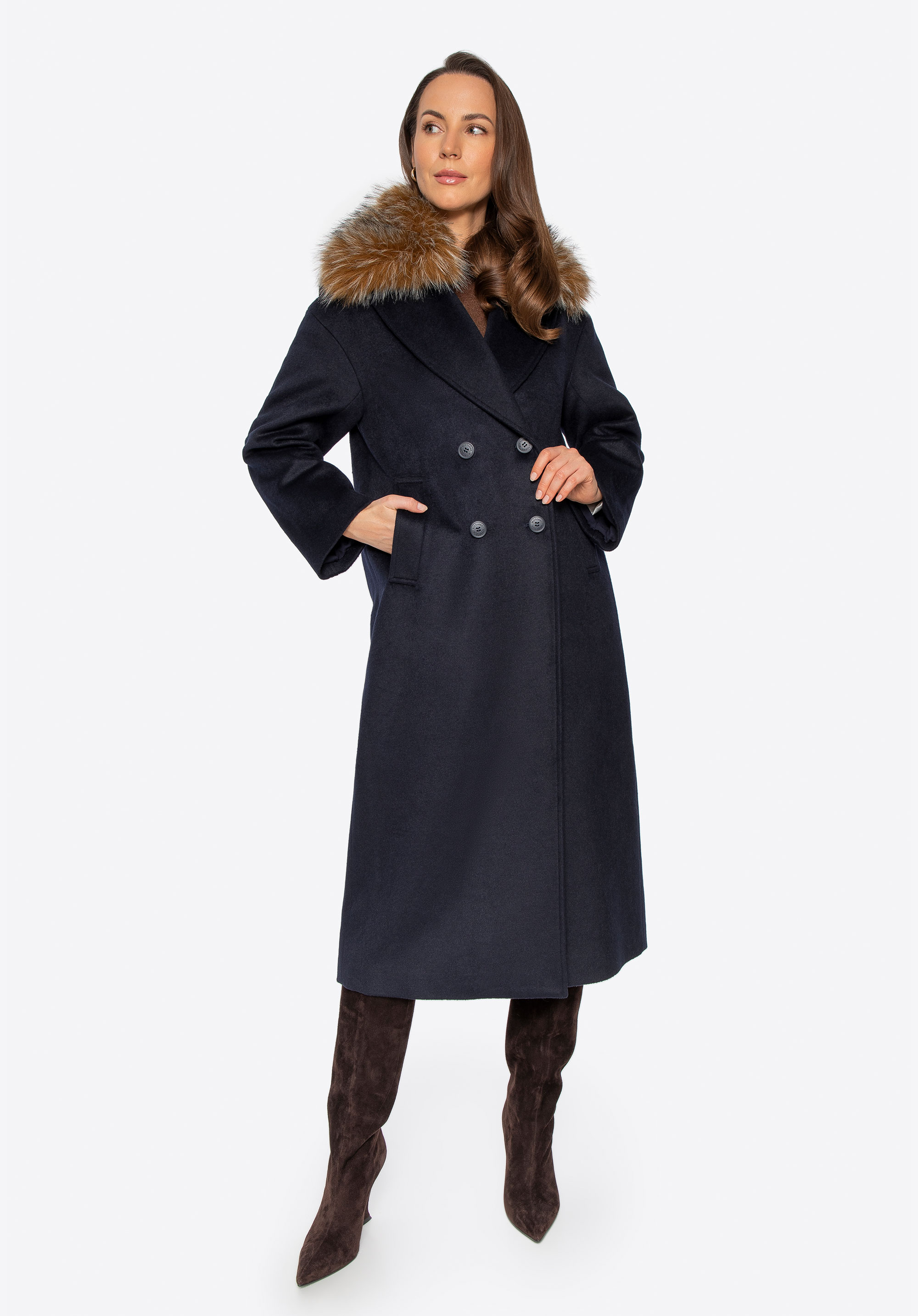 Це елегантне, двобортне жіноче пальто — позачасова пропозиція для прохолодних днів. Виготовлене з вовни та поліестеру, воно забезпечує тепловий комфорт і довговічність на багато сезонів. Класичний відкладний комір із можливістю прикріплення м’якого штучного хутра дозволяє змінювати характер стилю — від мінімалістичної елегантності до вишуканого зимового образу. Внутрішня частина оздоблена гладкою віскозною підкладкою, що підвищує комфорт під час носіння. Модель застібається на гудзики, підкреслюючи її класичний, стриманий крій.