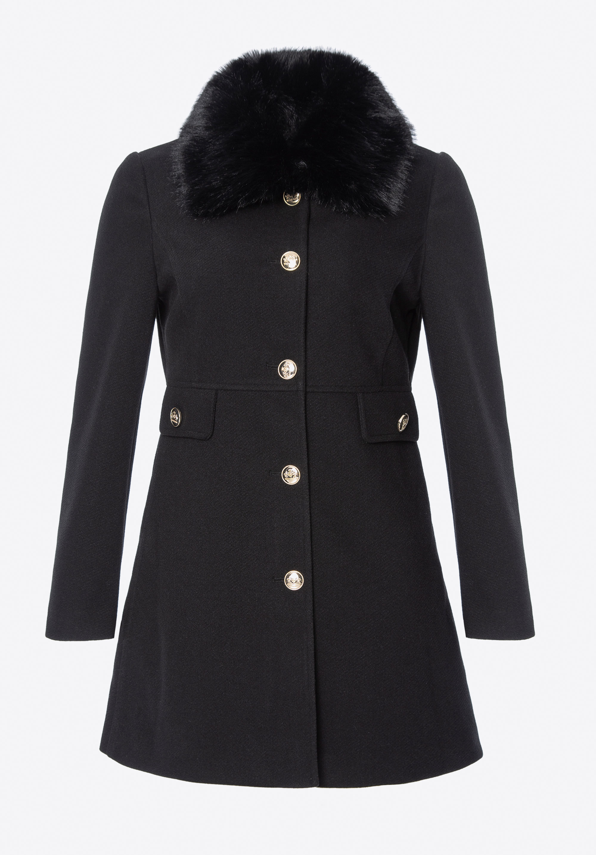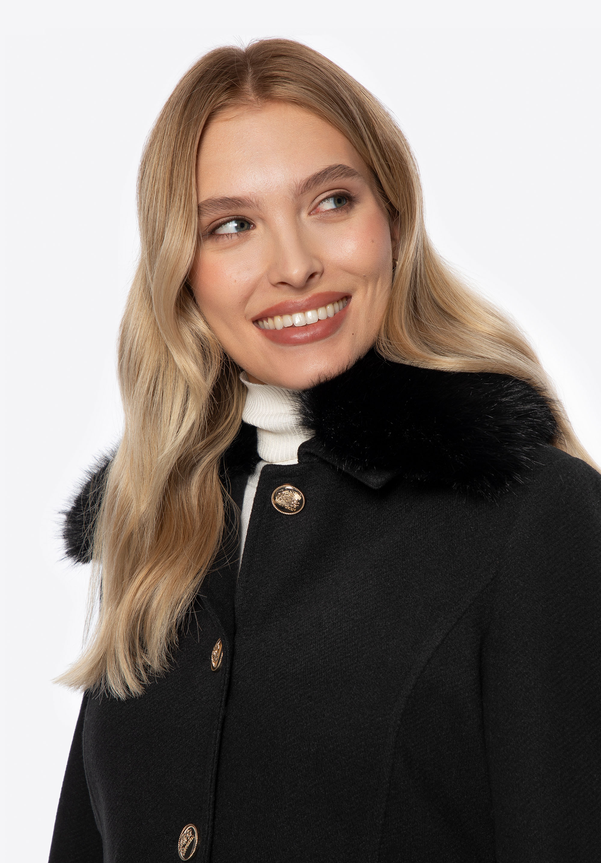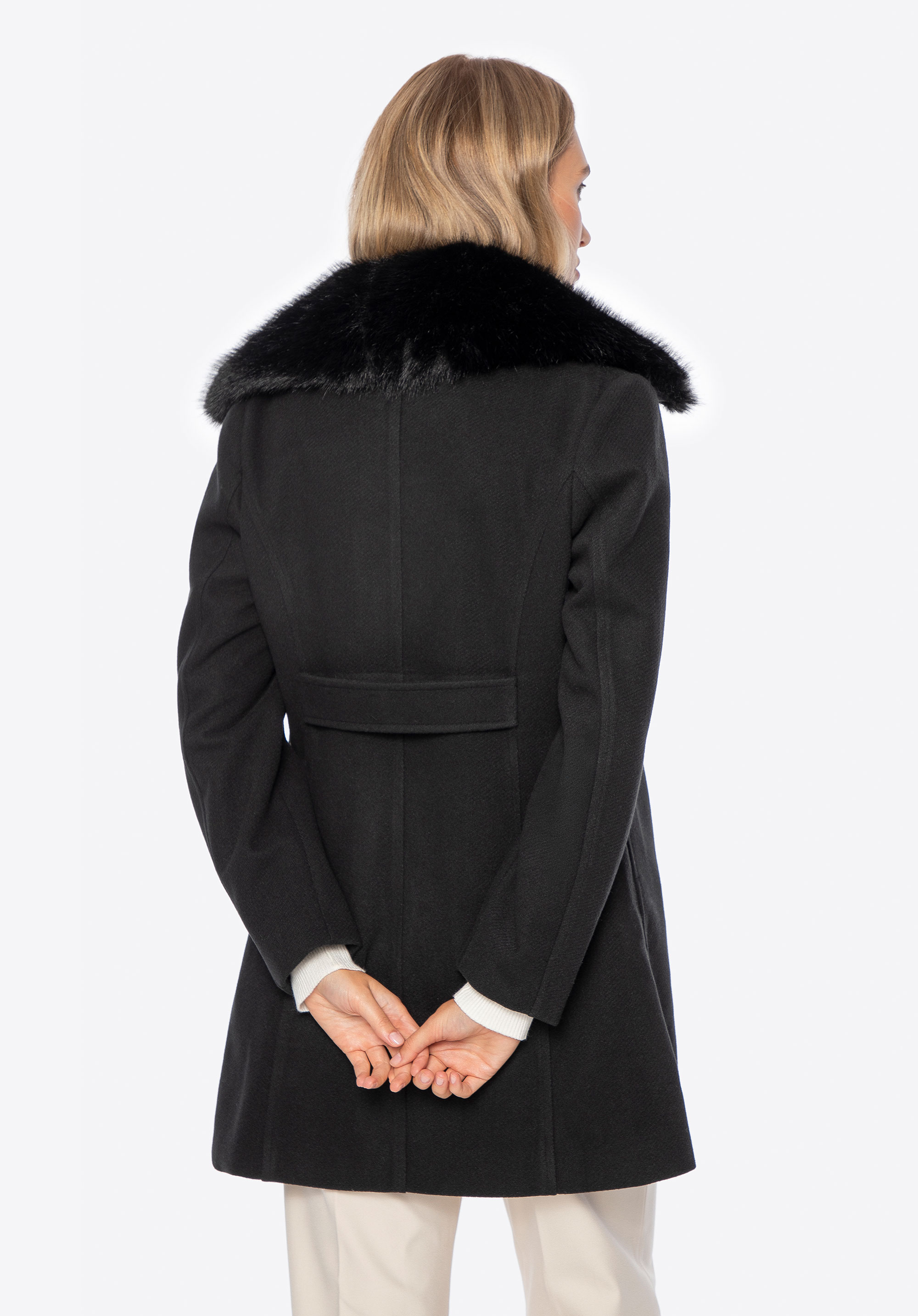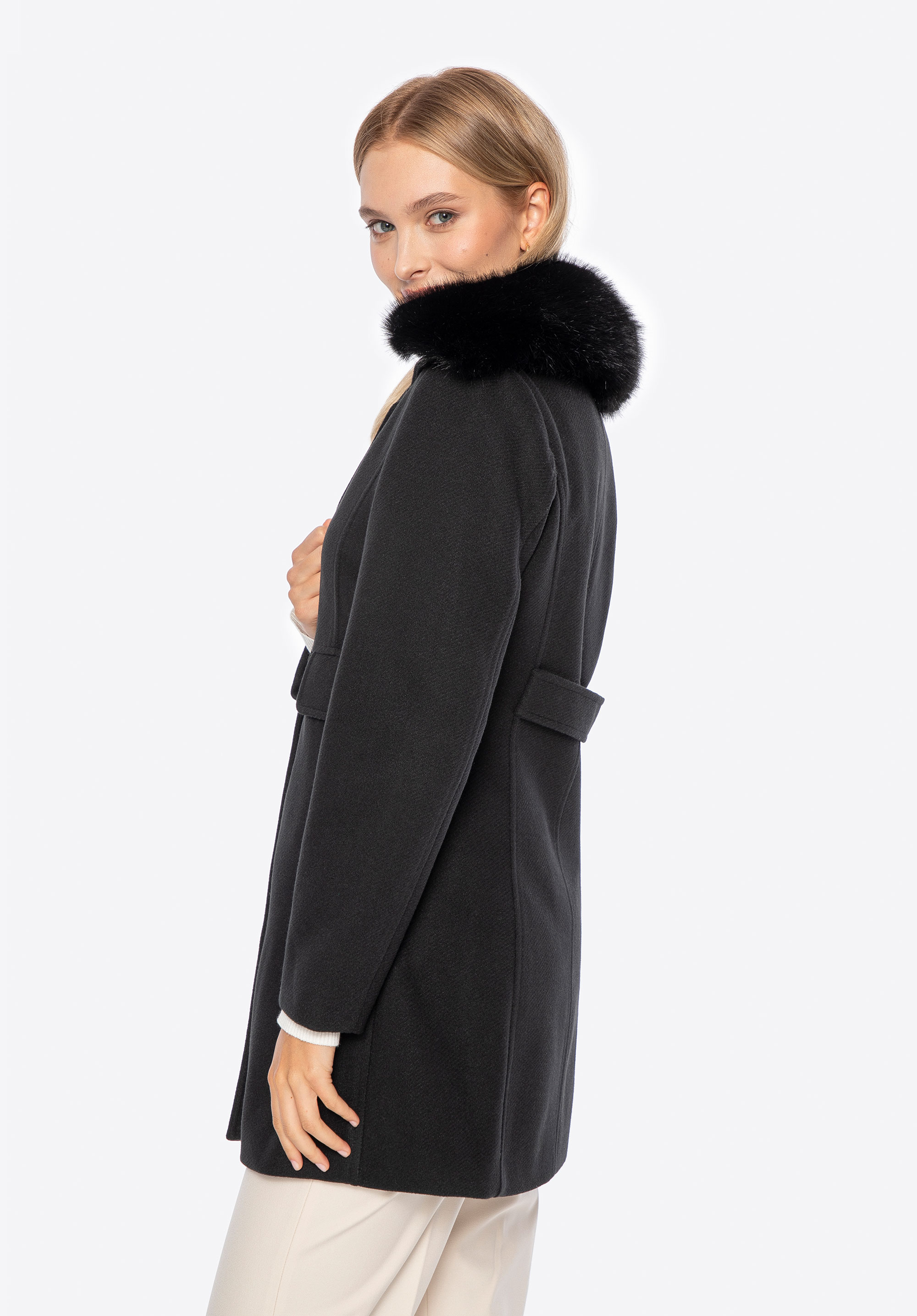 Шукаєте пальто, яке поєднує елегантність із щоденним комфортом? Ця коротка, приталена модель – ідеальна пропозиція для жінок, які люблять виглядати стильно незалежно від погоди. Виконане з м’якого поліестеру, воно забезпечує приємне тепло та свободу рухів. Знімний комір зі штучного хутра додає виробу розкішного вигляду, а водночас дозволяє вільно змінювати стиль – від класичної елегантності до мінімалістичного образу. Імітація кишень з клапанами та декоративними ґудзиками виконує декоративну функцію, додаючи пальто вишуканого міського шику.