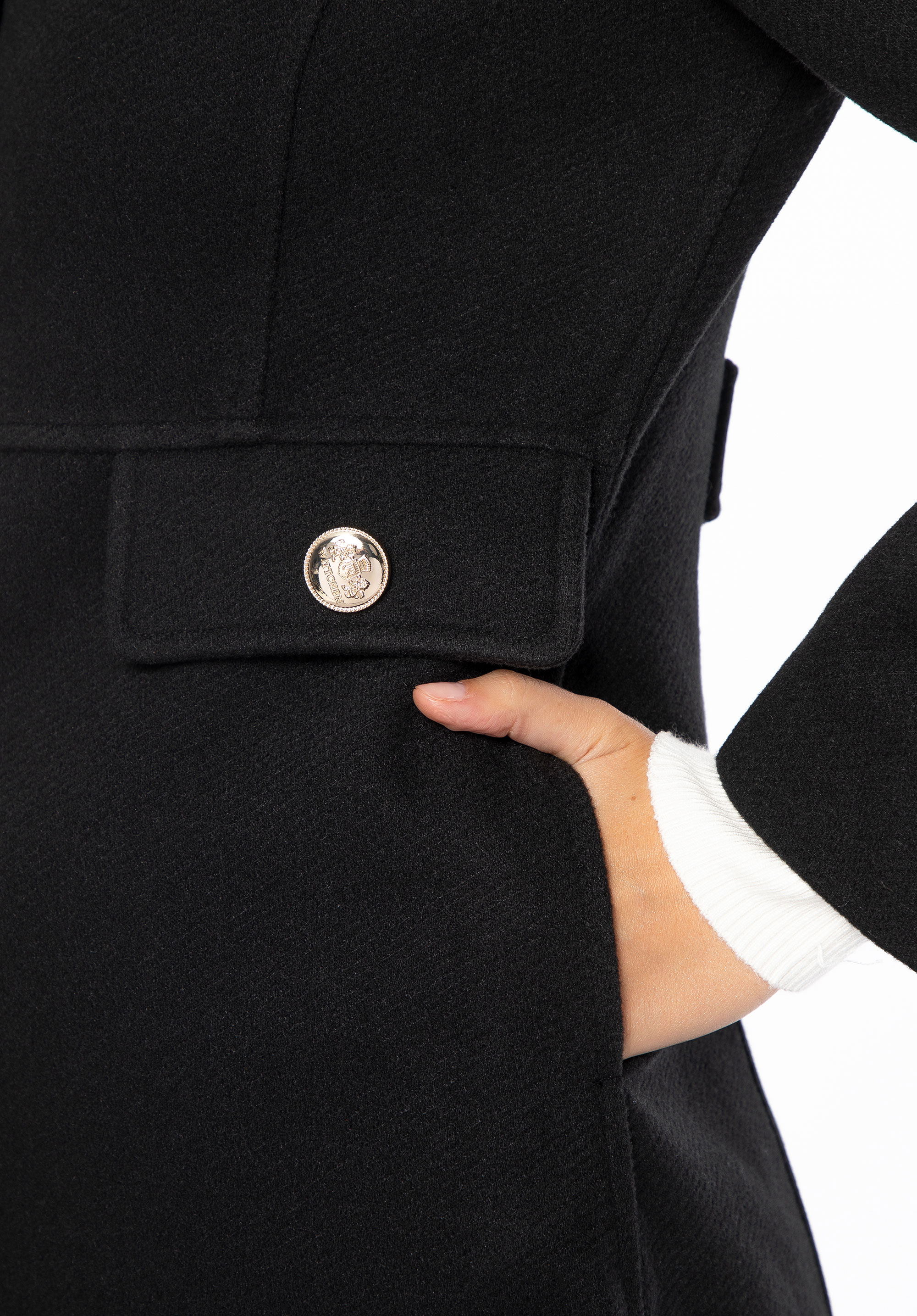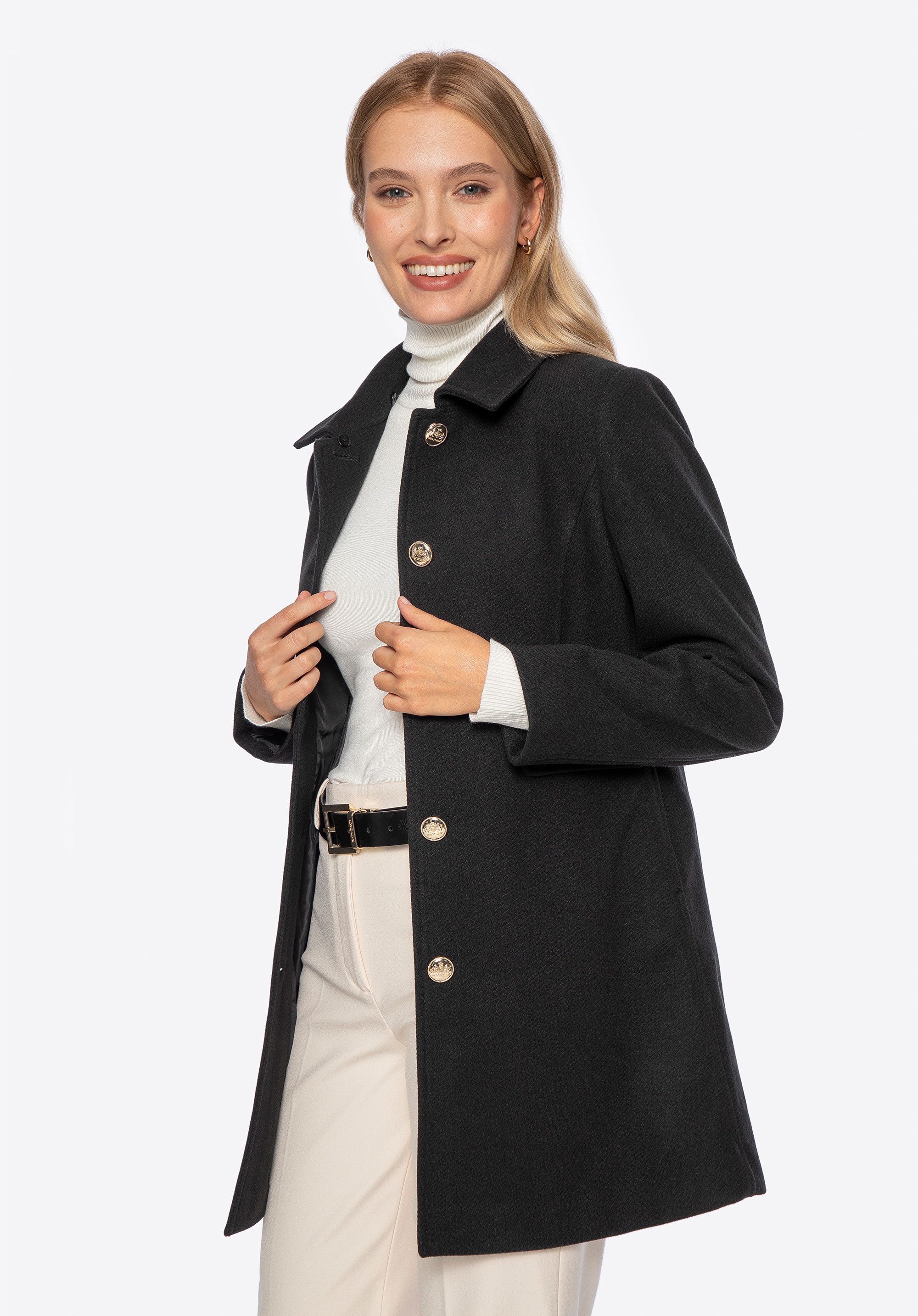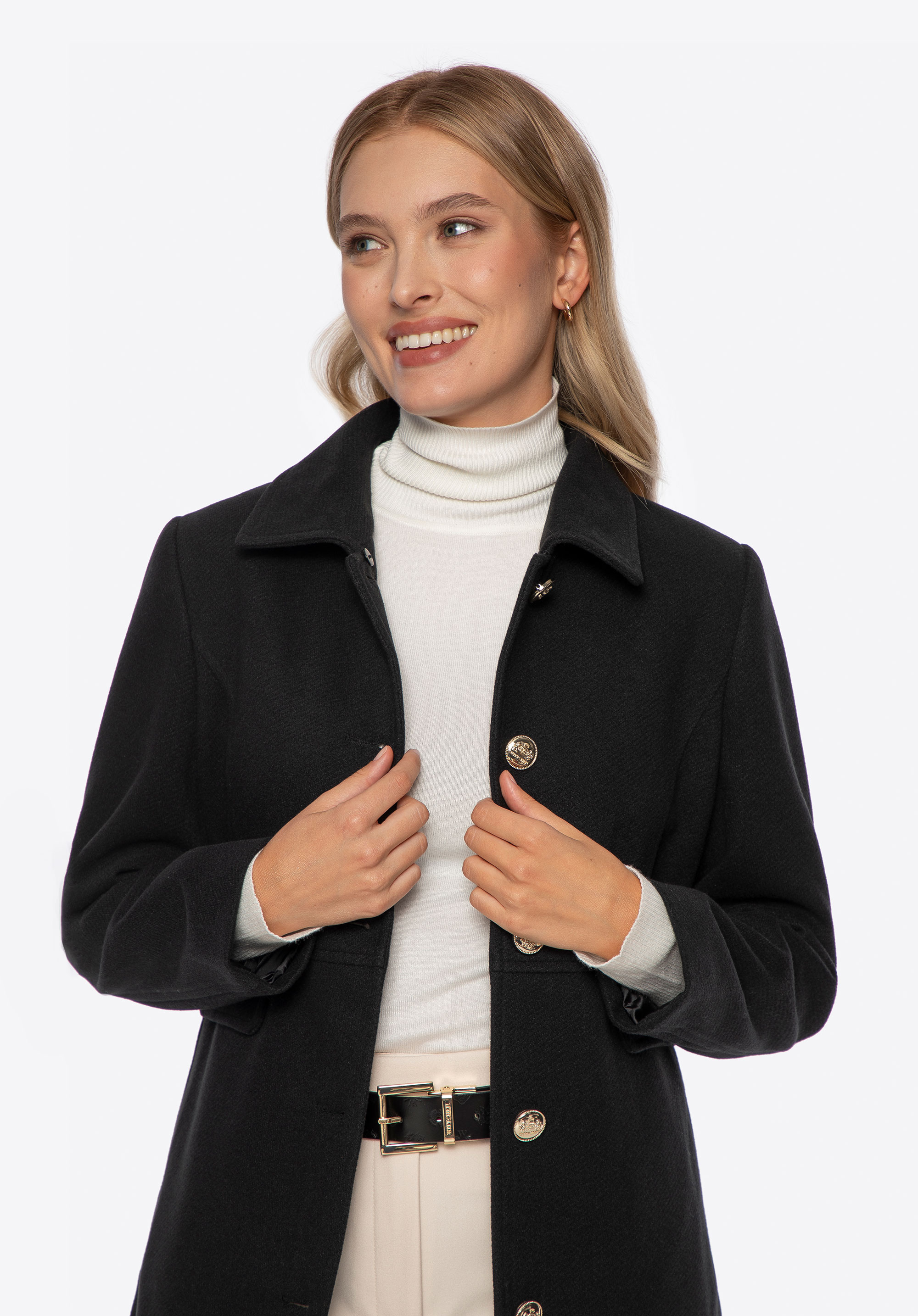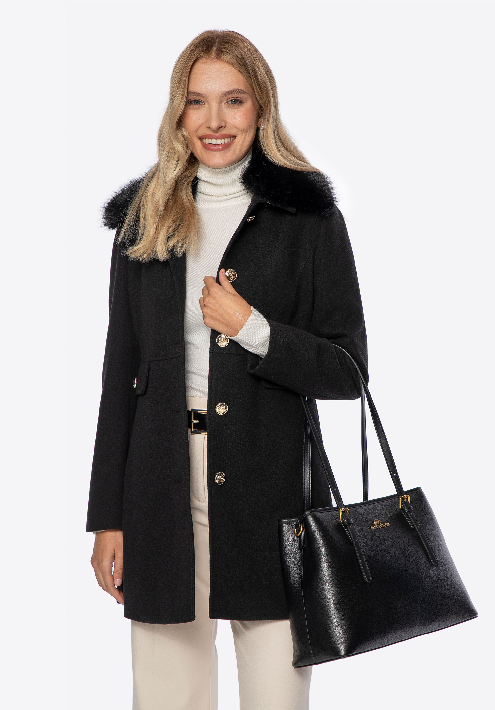 Шукаєте пальто, яке поєднує елегантність із щоденним комфортом? Ця коротка, приталена модель – ідеальна пропозиція для жінок, які люблять виглядати стильно незалежно від погоди. Виконане з м’якого поліестеру, воно забезпечує приємне тепло та свободу рухів. Знімний комір зі штучного хутра додає виробу розкішного вигляду, а водночас дозволяє вільно змінювати стиль – від класичної елегантності до мінімалістичного образу. Імітація кишень з клапанами та декоративними ґудзиками виконує декоративну функцію, додаючи пальто вишуканого міського шику.