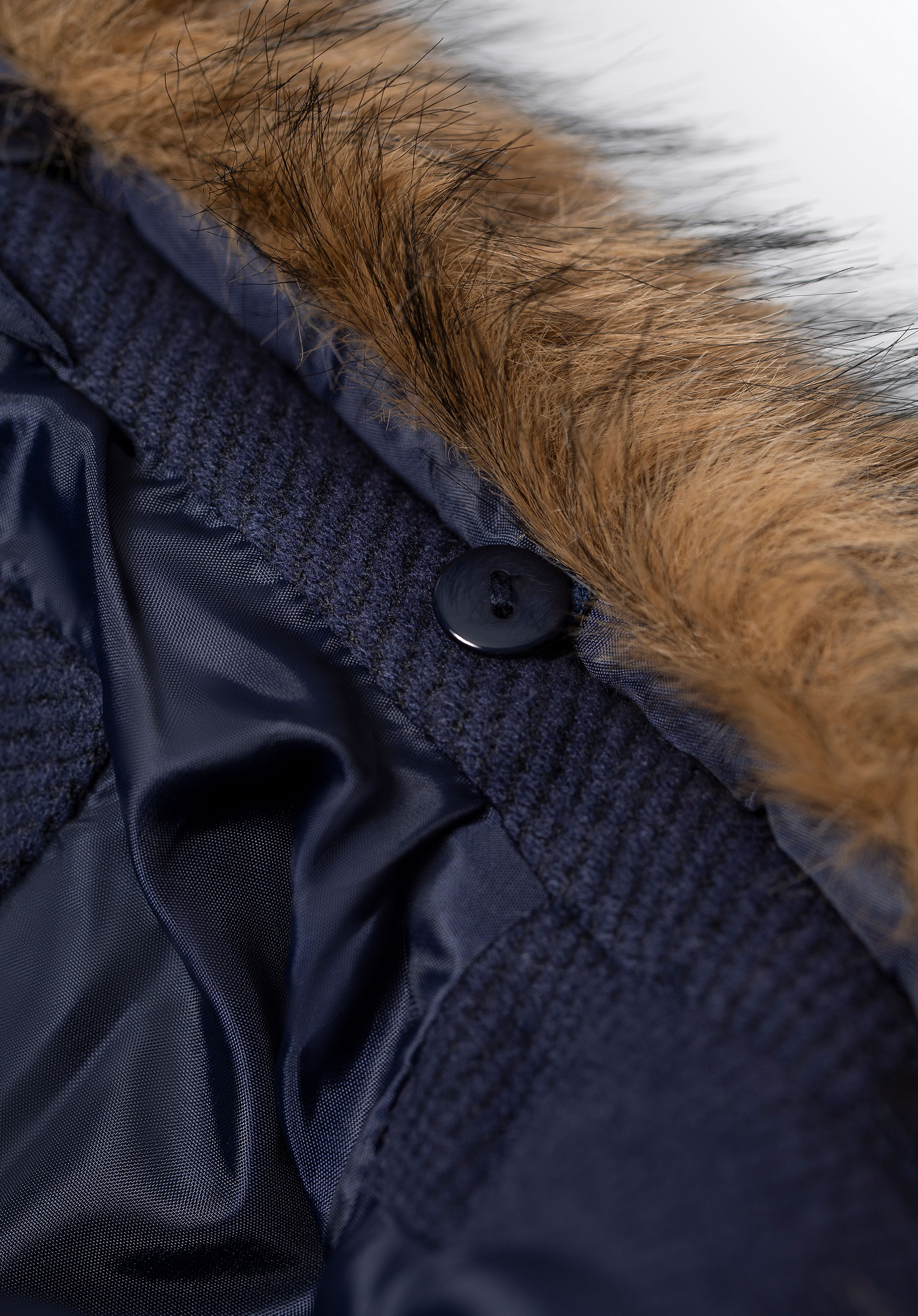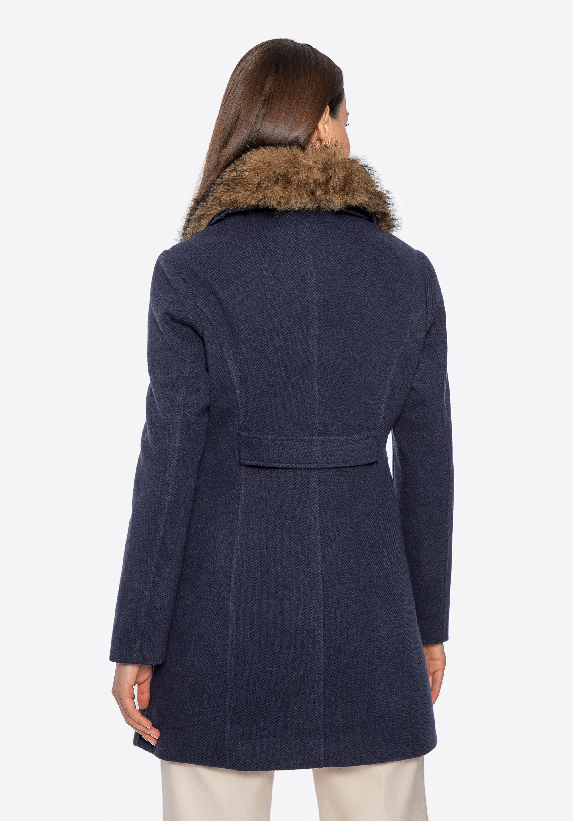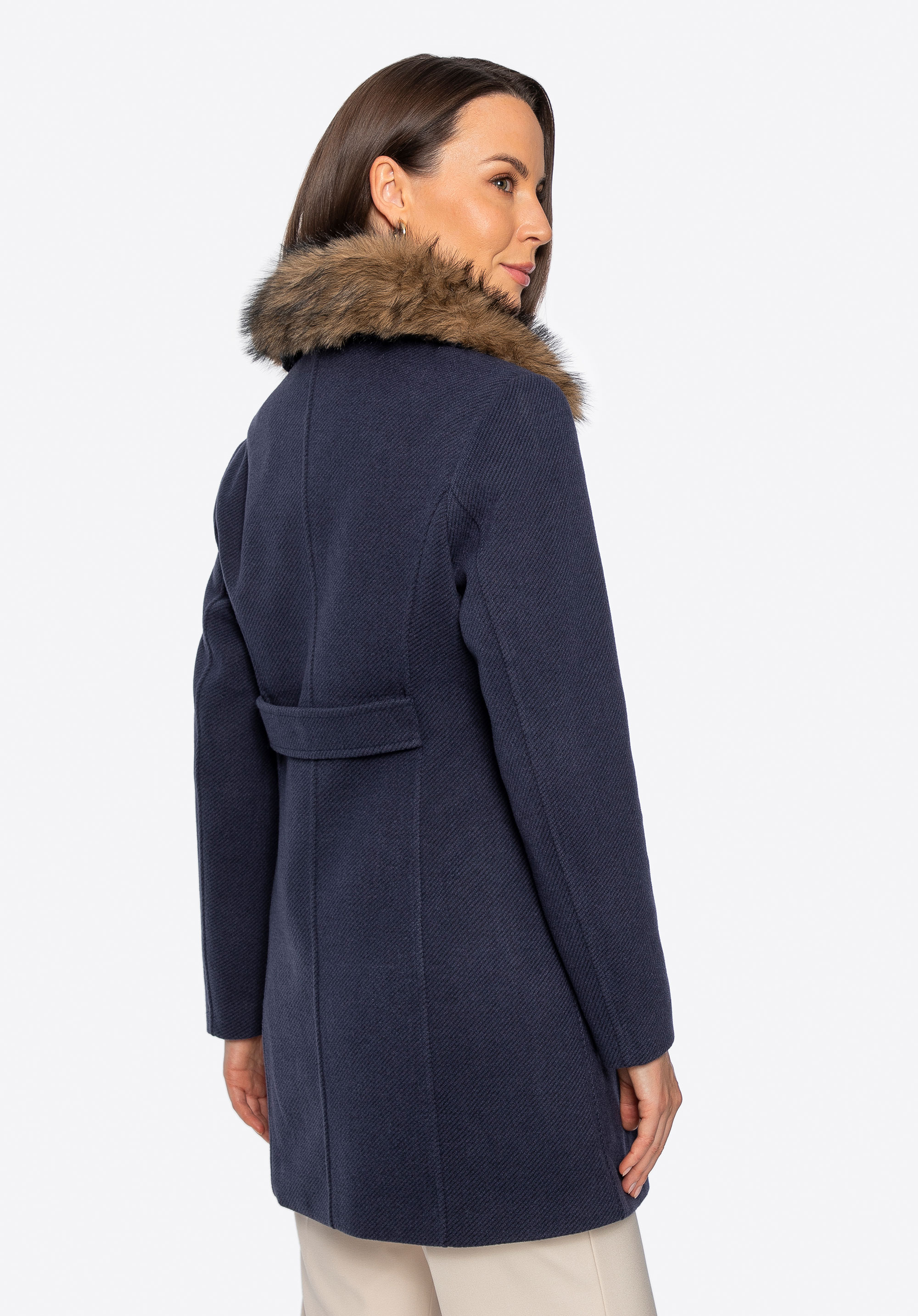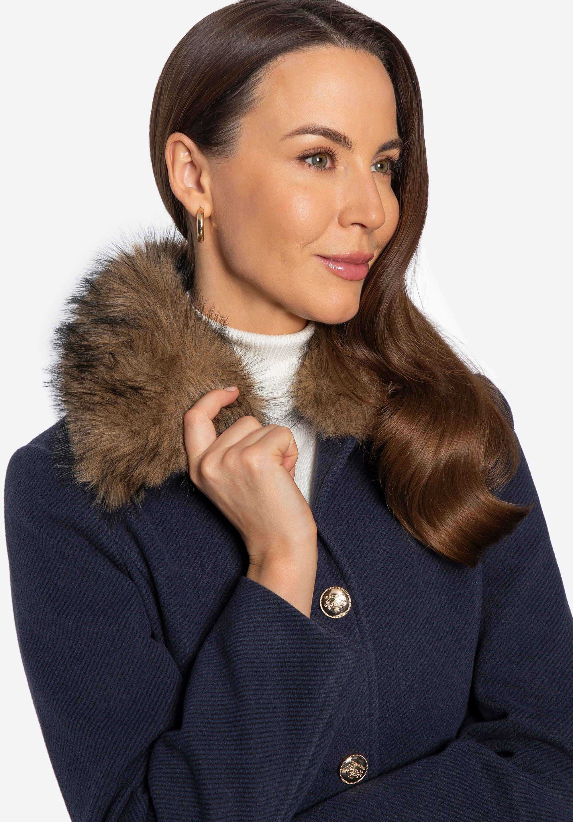 Коротке жіноче пальто з хутряним коміром темно-синє
