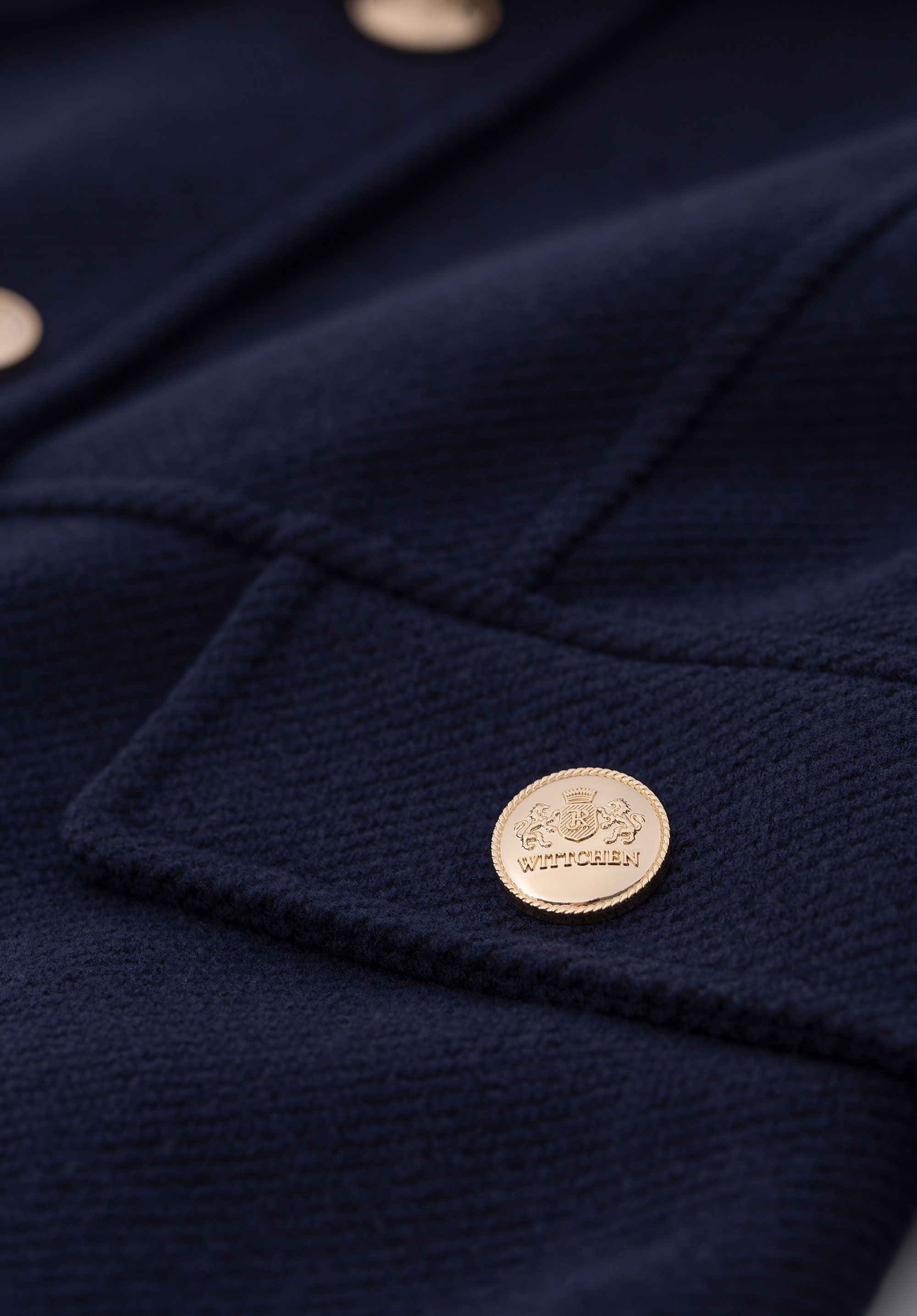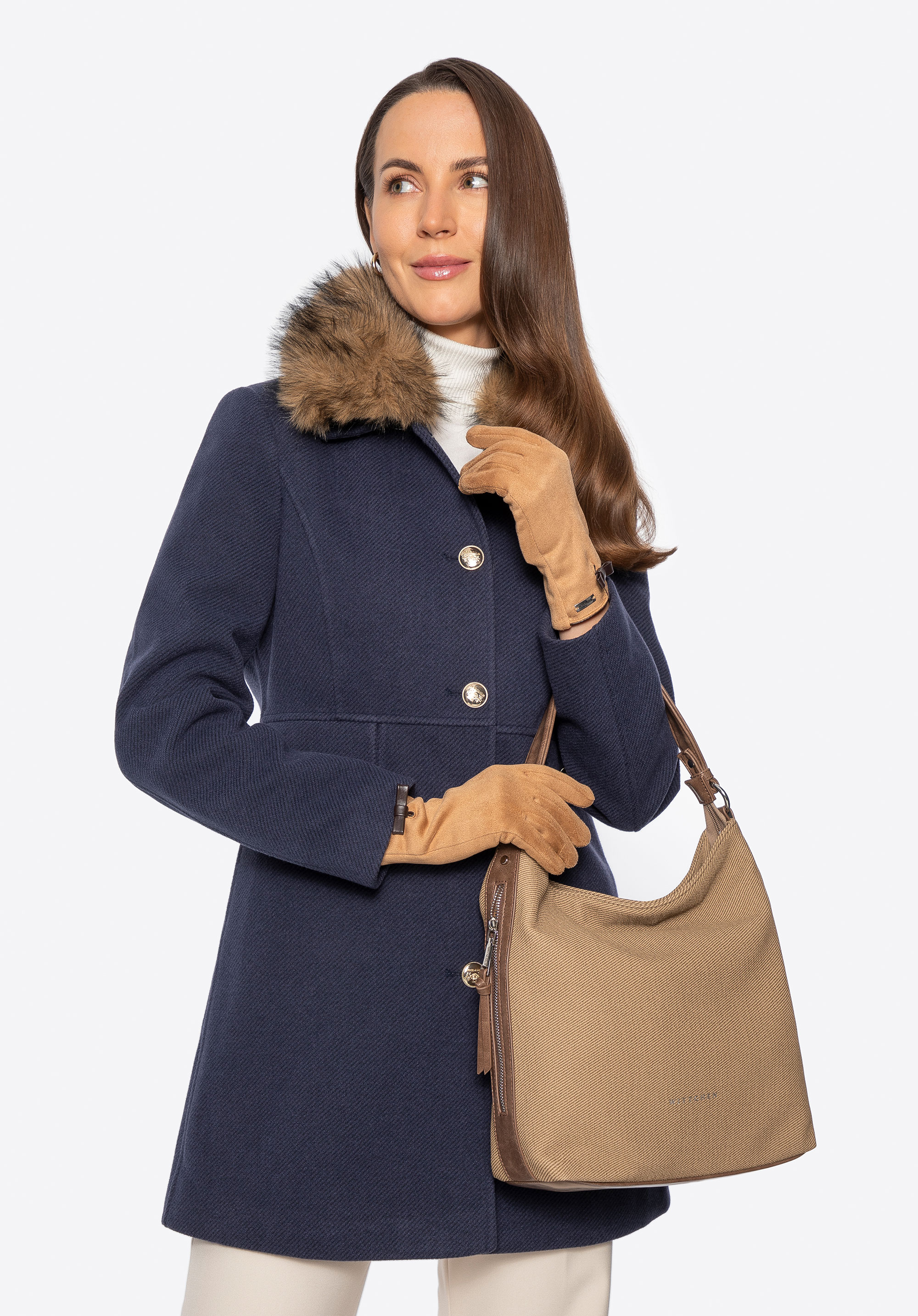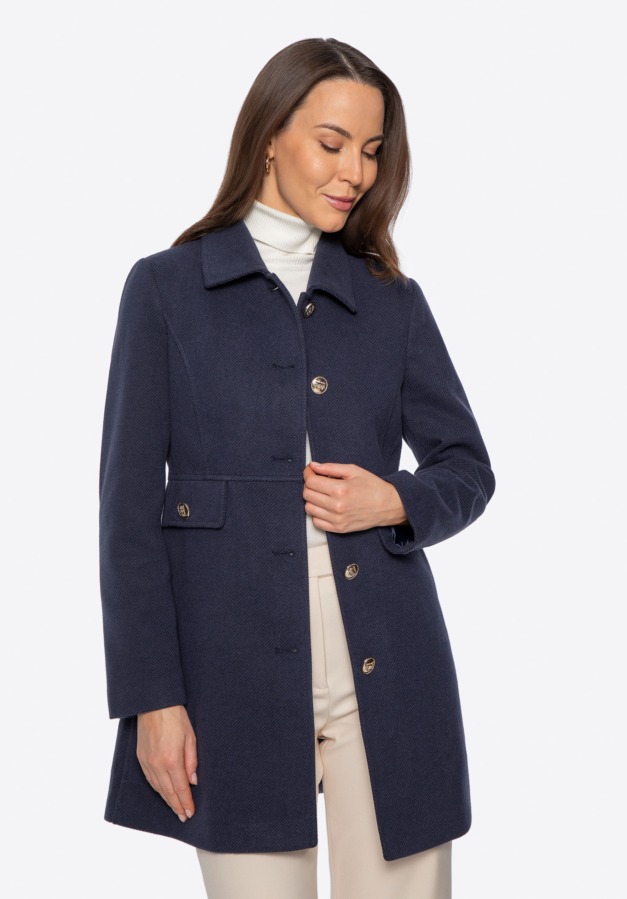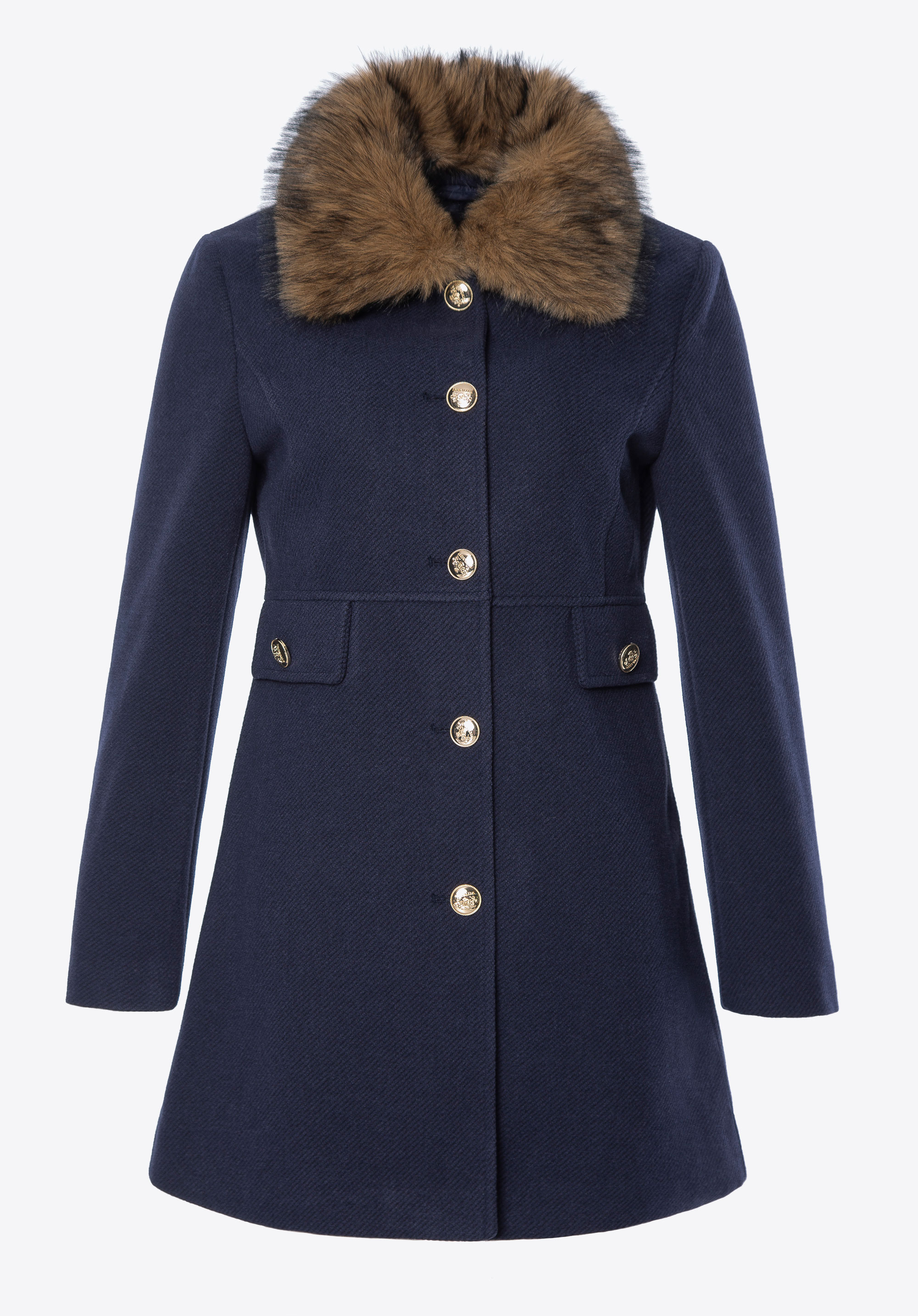 Коротке жіноче пальто з хутряним коміром темно-синє
