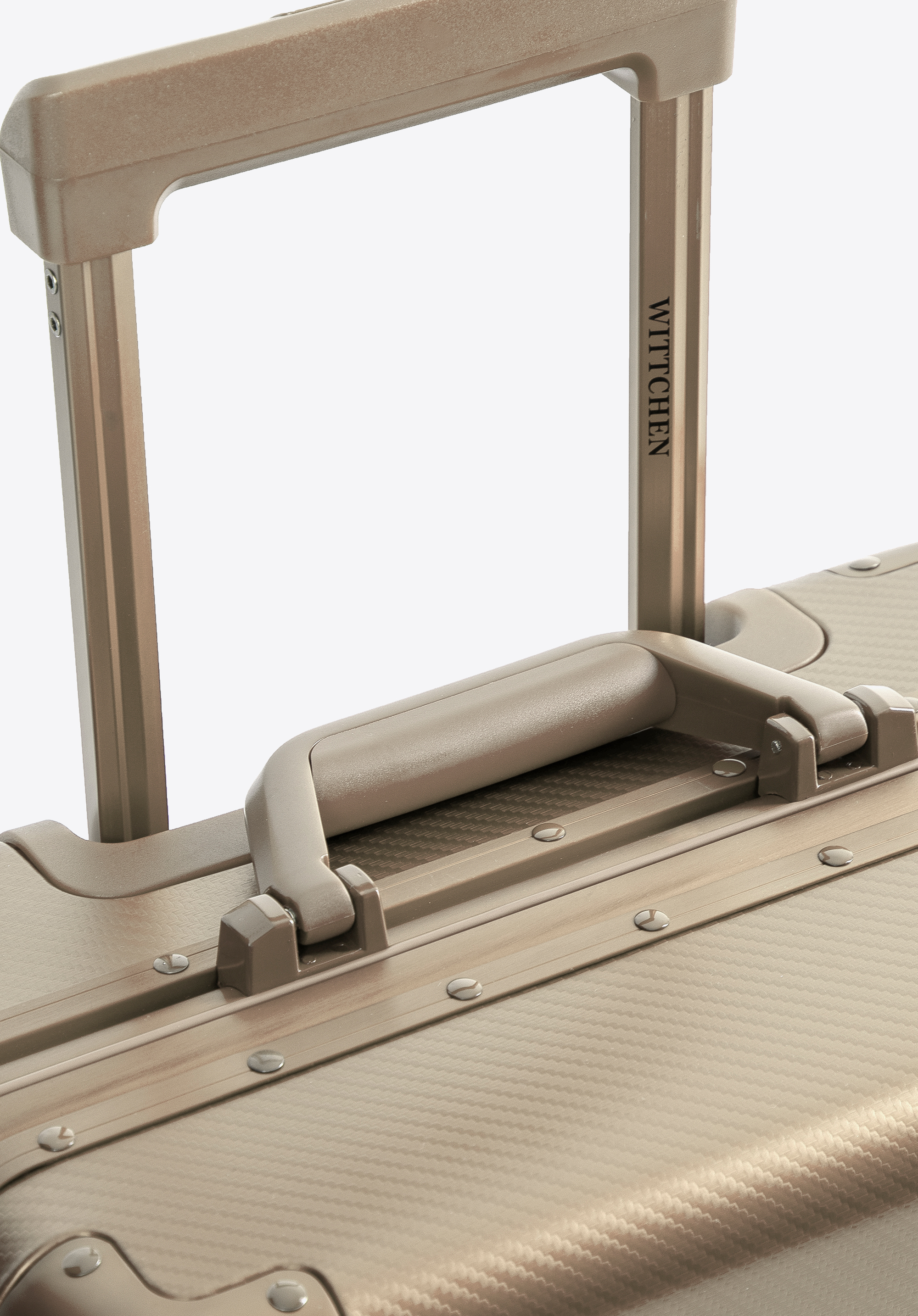 Відкрийте для себе ексклюзивну маленьку валізу WITTCHEN з колекції Prämie line, виготовлену зі 100% алюмінію. Посилена оббивка з заклепками підкреслює її унікальний дизайн, а міцна конструкція забезпечує чудовий захист багажу. Чотири подвійних колеса та алюмінієва телескопічна ручка забезпечують комфортну та стильну подорож. Виберіть валізу, яка поєднує в собі елегантність і функціональність – ідеально підходить для будь-якої подорожі.