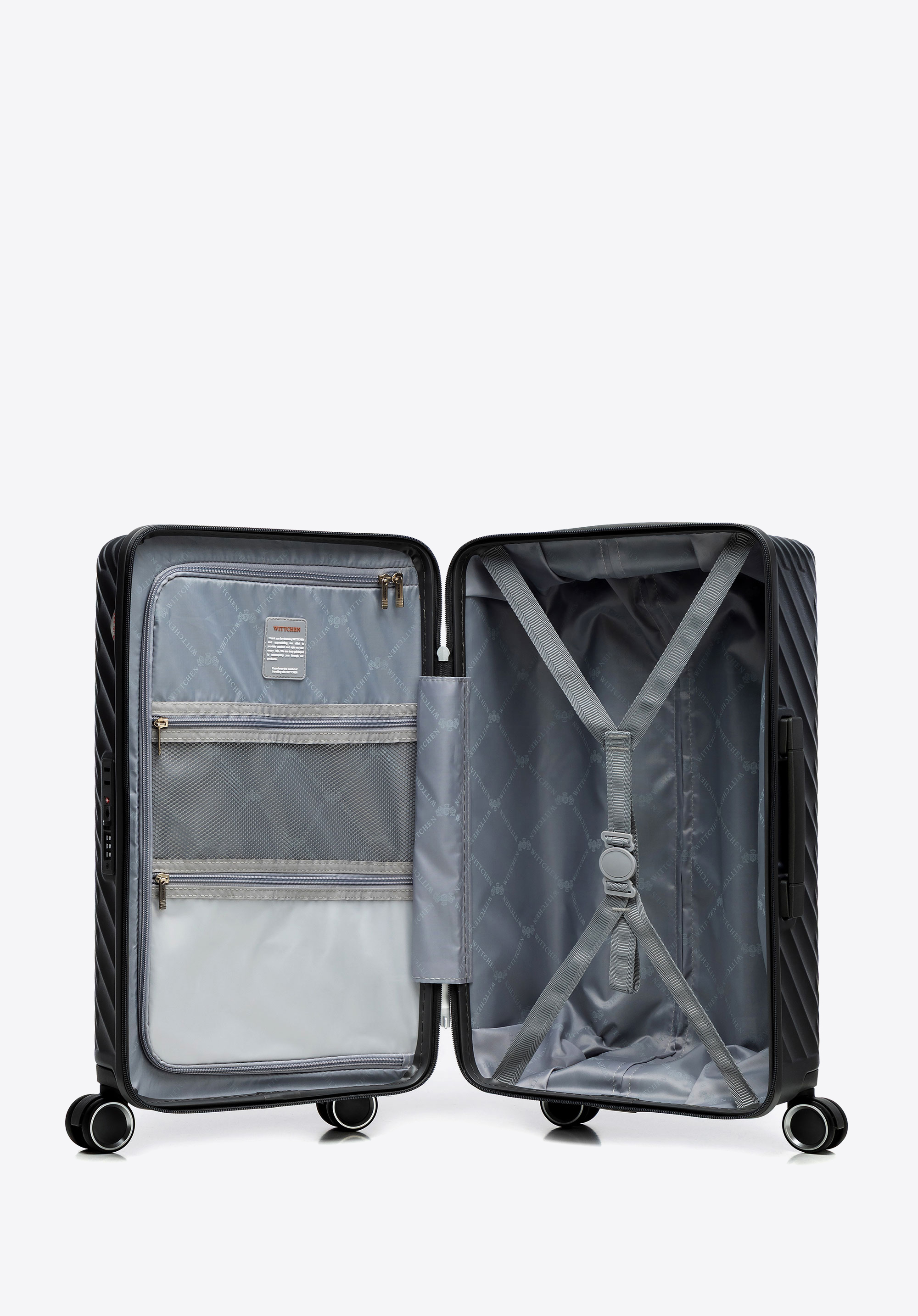- Дизайн: Тонкий силует з геометричним візерунком надає валізі сучасного, вишуканого вигляду – подорожуйте елегантно, куди б ви не пішли.