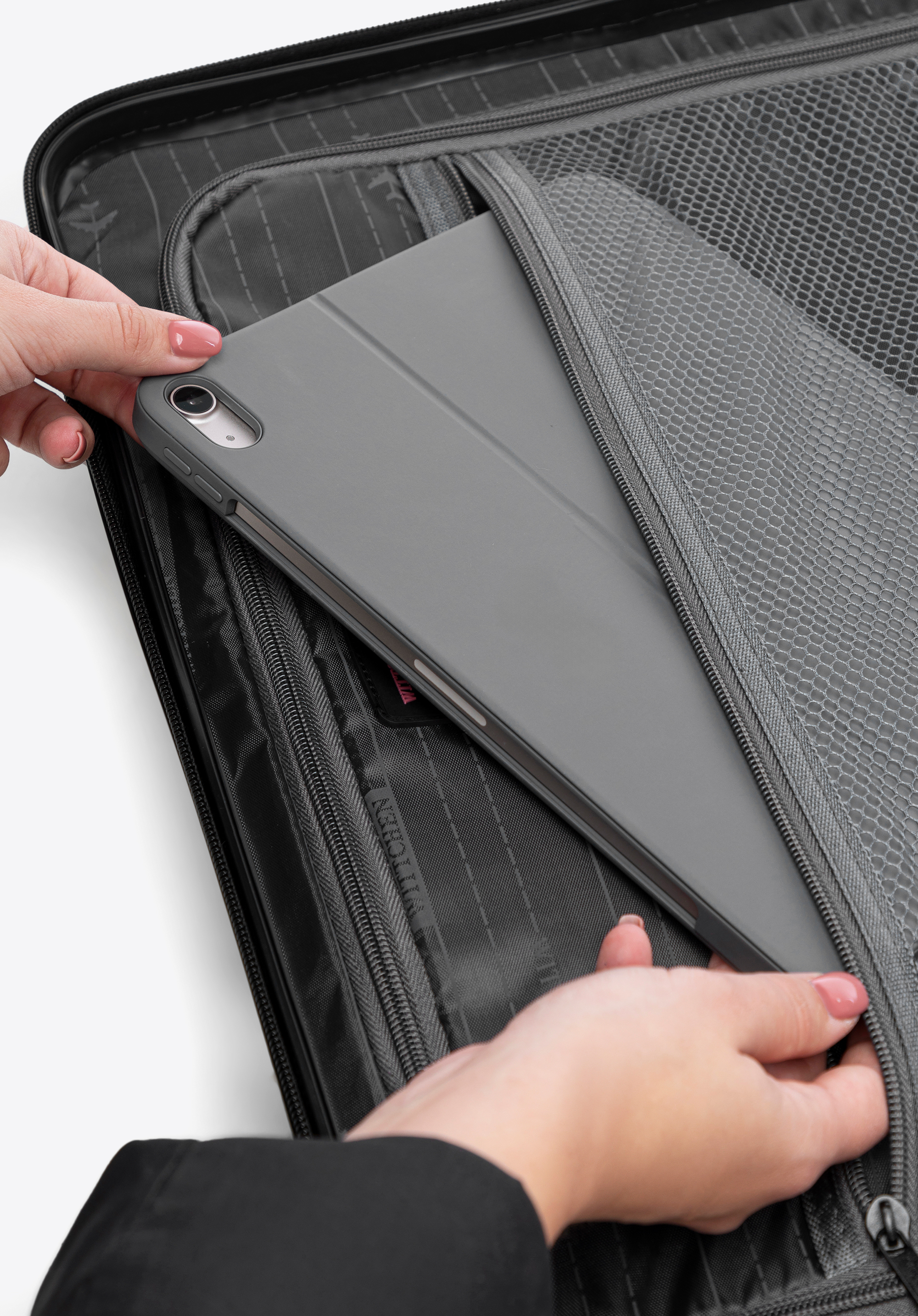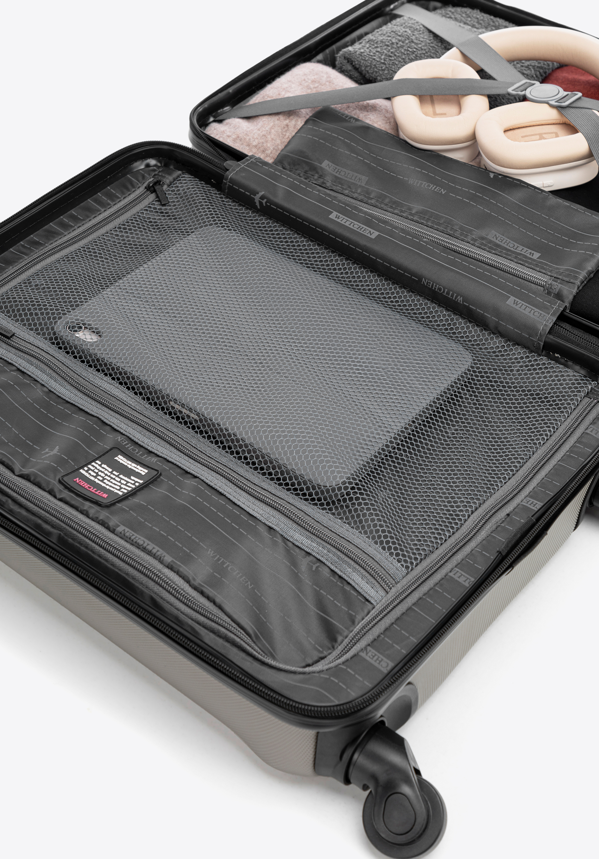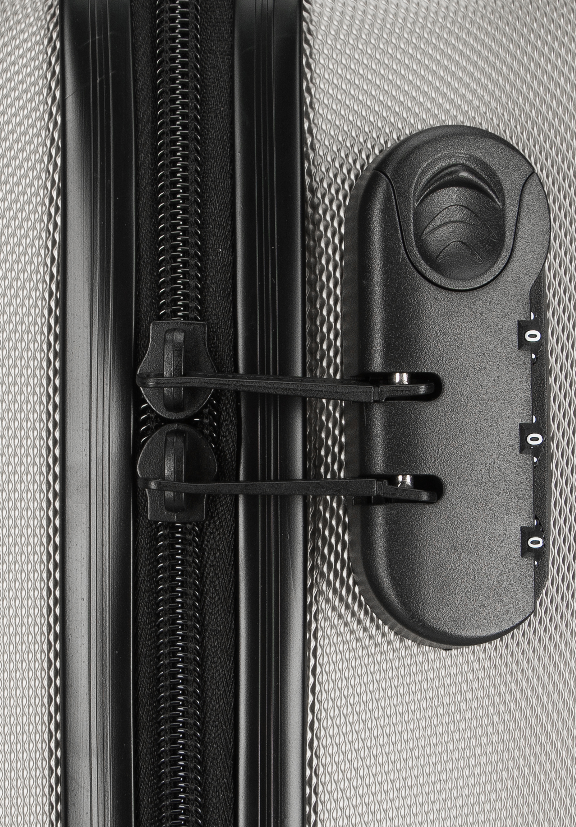 Корпус невеликого розміру виготовлений з ABS з пористою поверхнею з високою стійкістю до подряпин. Модель оснащена зашифрованим замком, алюмінієвою висувною телескопічною ручкою і гумовою ручкою для зручності перенесення валізи. Вона має вертикальне тиснення, щоб додати цікавого характеру валізи. Доступний в декількох кольорах: темно-синій, рожевий, шампанське, сірий і чорний.
