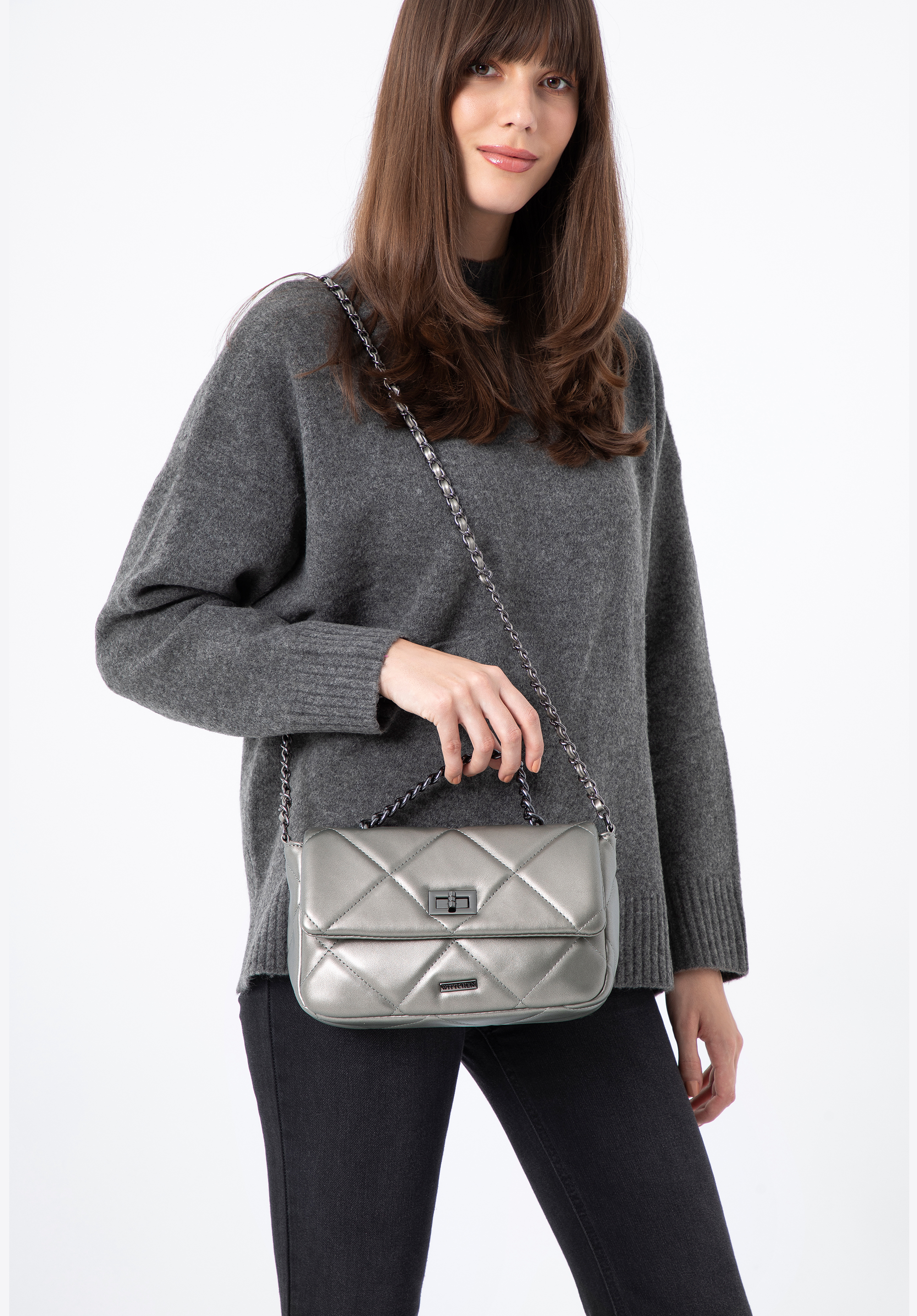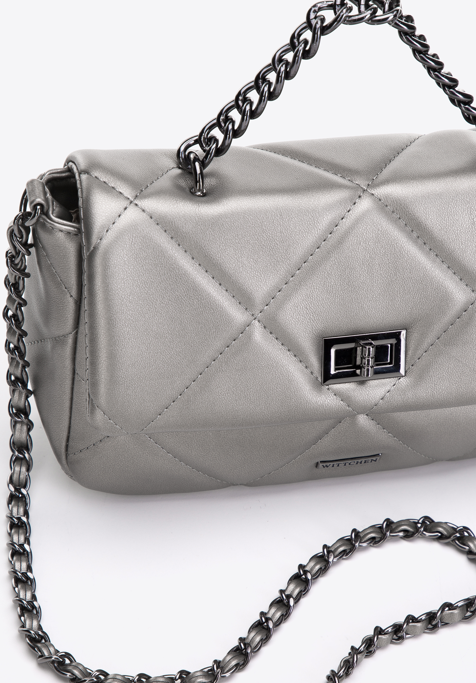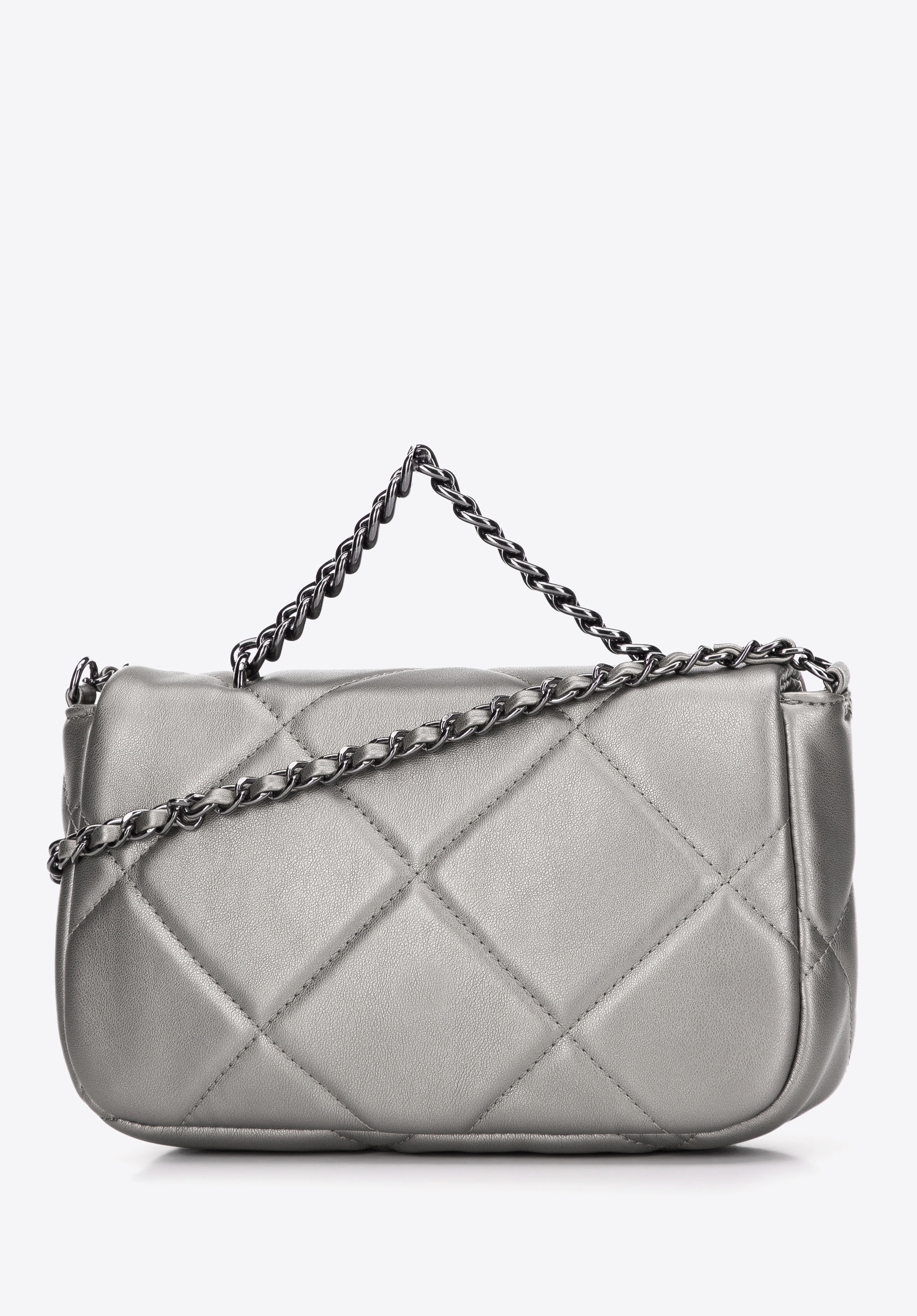 Маленька жіноча квадратна стьобана сумка на ланцюжку срібна