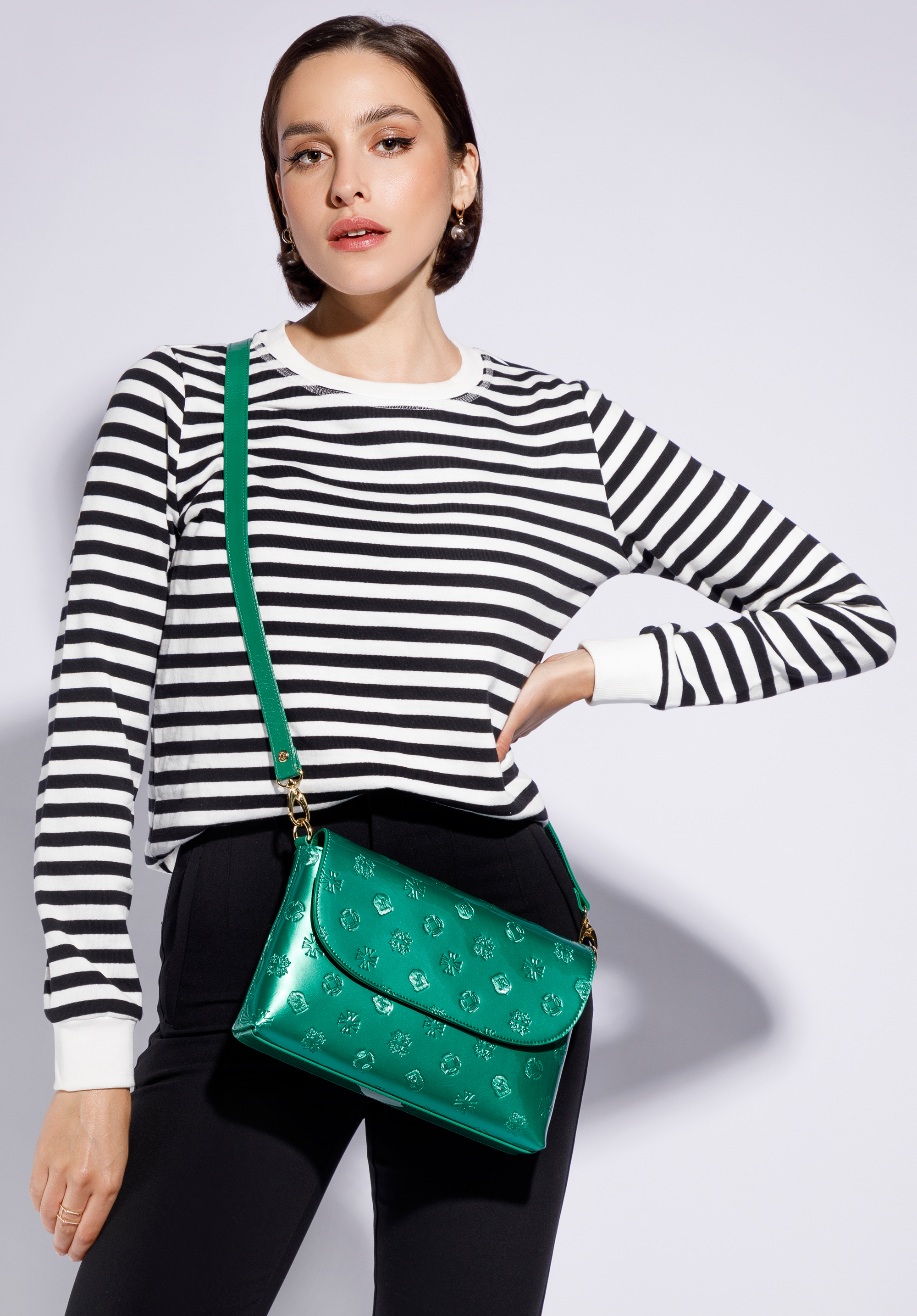 Ця унікальна акуратна сумка сподобається любителям оригінальних аксесуарів. Виготовлена з лакованої шкіри з тисненням монограми. Золотиста фурнітура додає блиску та стильно завершує ціле. Всередині можна помістити гаманець, телефон, невеликий календар і запасний шарф - ідеально підходить для виходу з друзями, в кіно або на прогулянку. Ним можна прикрасити найпростіші стилізації або підкреслити елегантний костюм чи сукню. Маленька жіноча сумка-месенджер з металізованої лакованої шкіри - це класичний дизайн із сучасною обробкою, який приверне увагу в будь-якій ситуації.