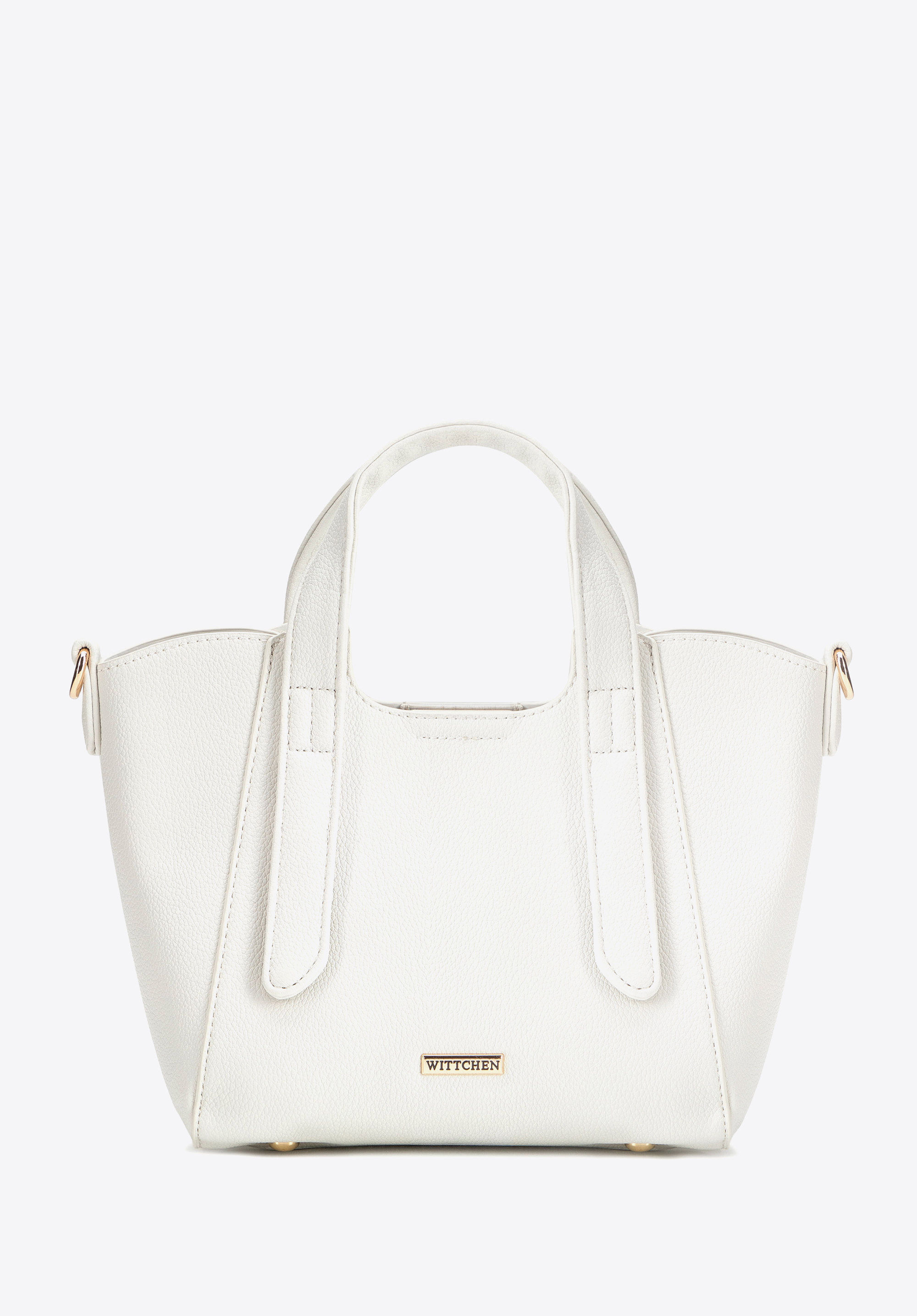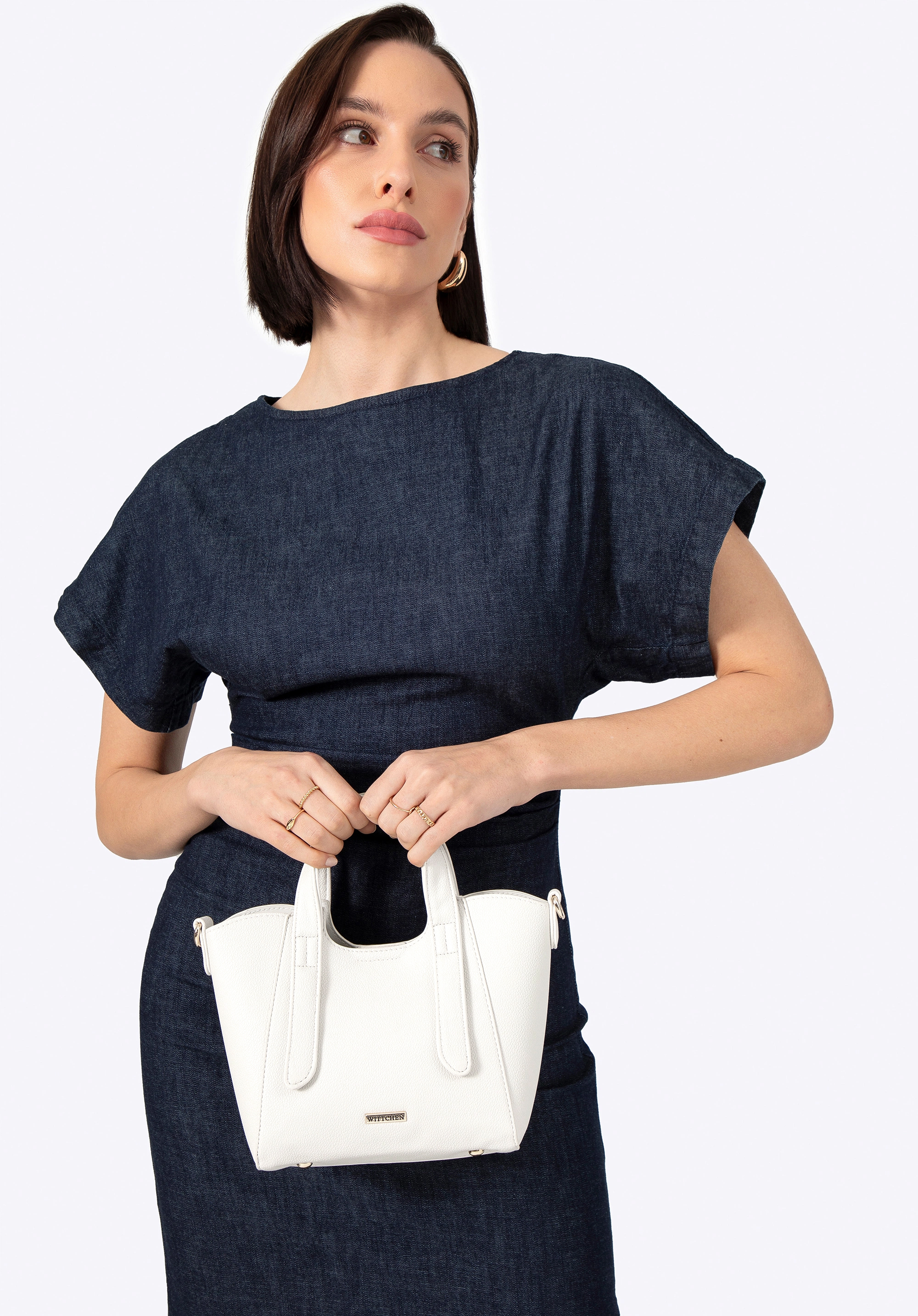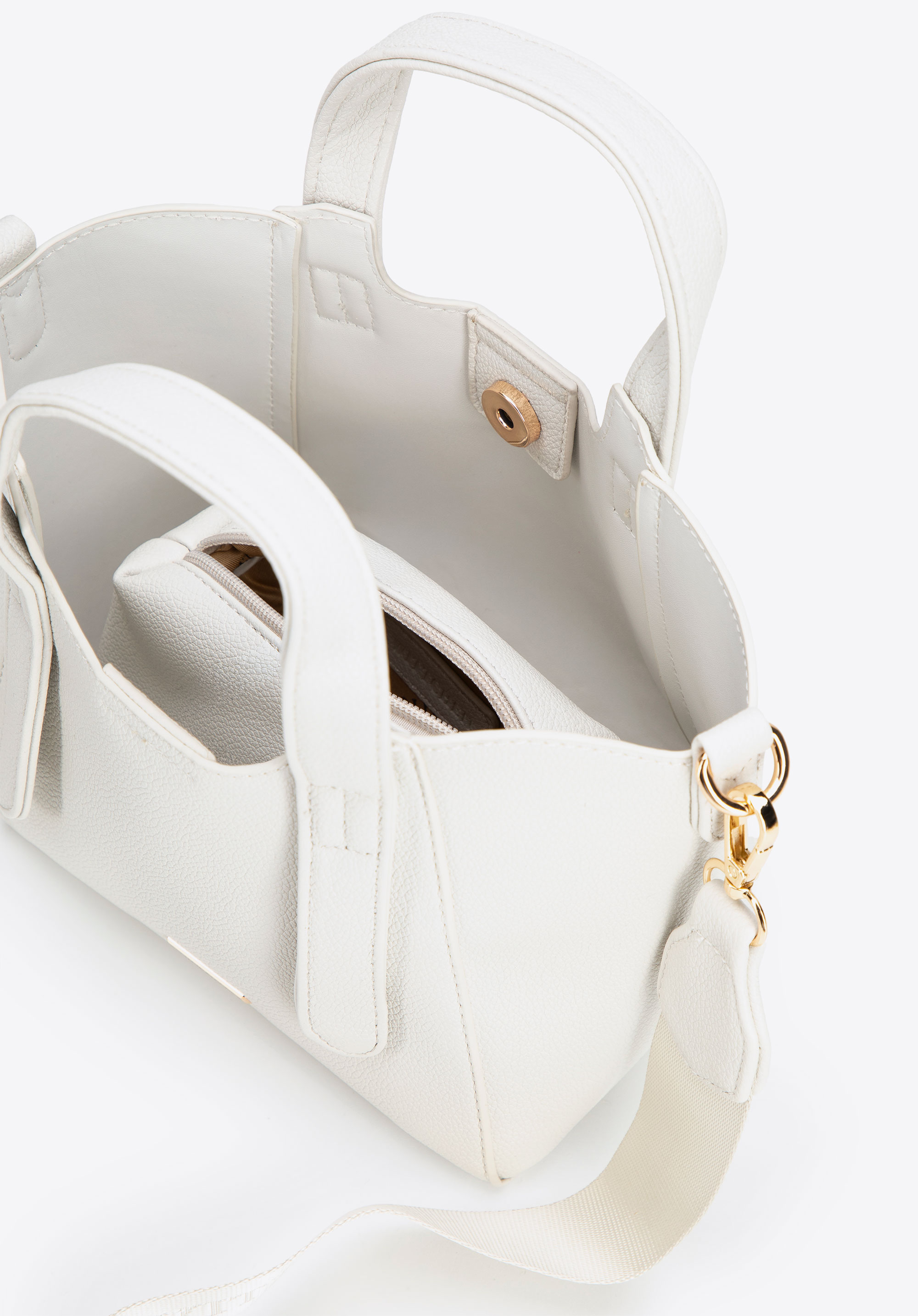 Відкрийте для себе нашу елегантну сумку з екошкіри мінімалістичного дизайну з привабливими деталями. Зручні ручки з декоративними подовжувачами і магнітною застібкою забезпечують легкий доступ всередину. Усередині ви знайдете знімну косметичку з кишенею на блискавці, а регульований знімний ремінь із логотипом забезпечує універсальність варіантів носіння. Компактний розмір робить її ідеальною повсякденною сумкою, у якій помістяться всі необхідні речі.