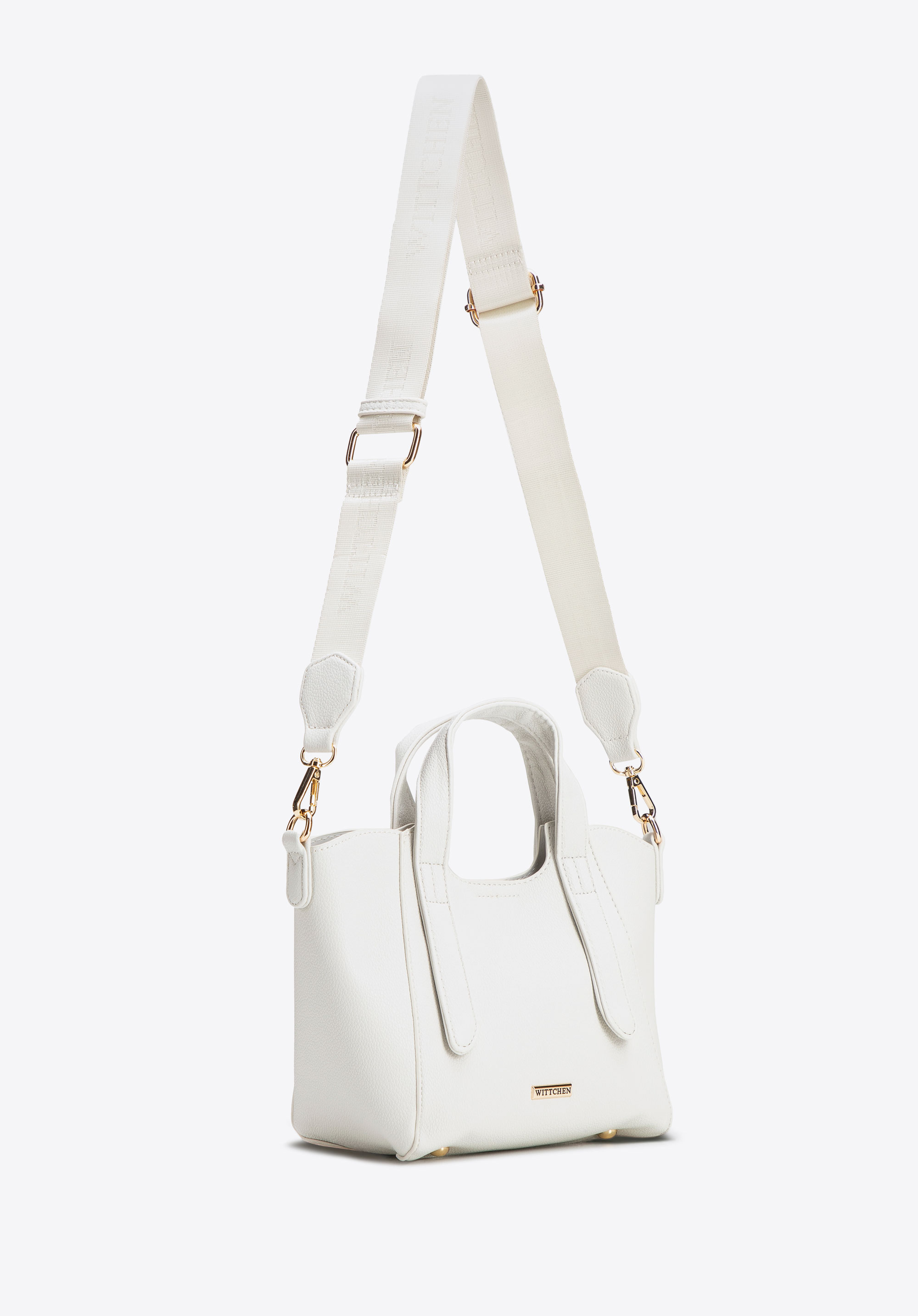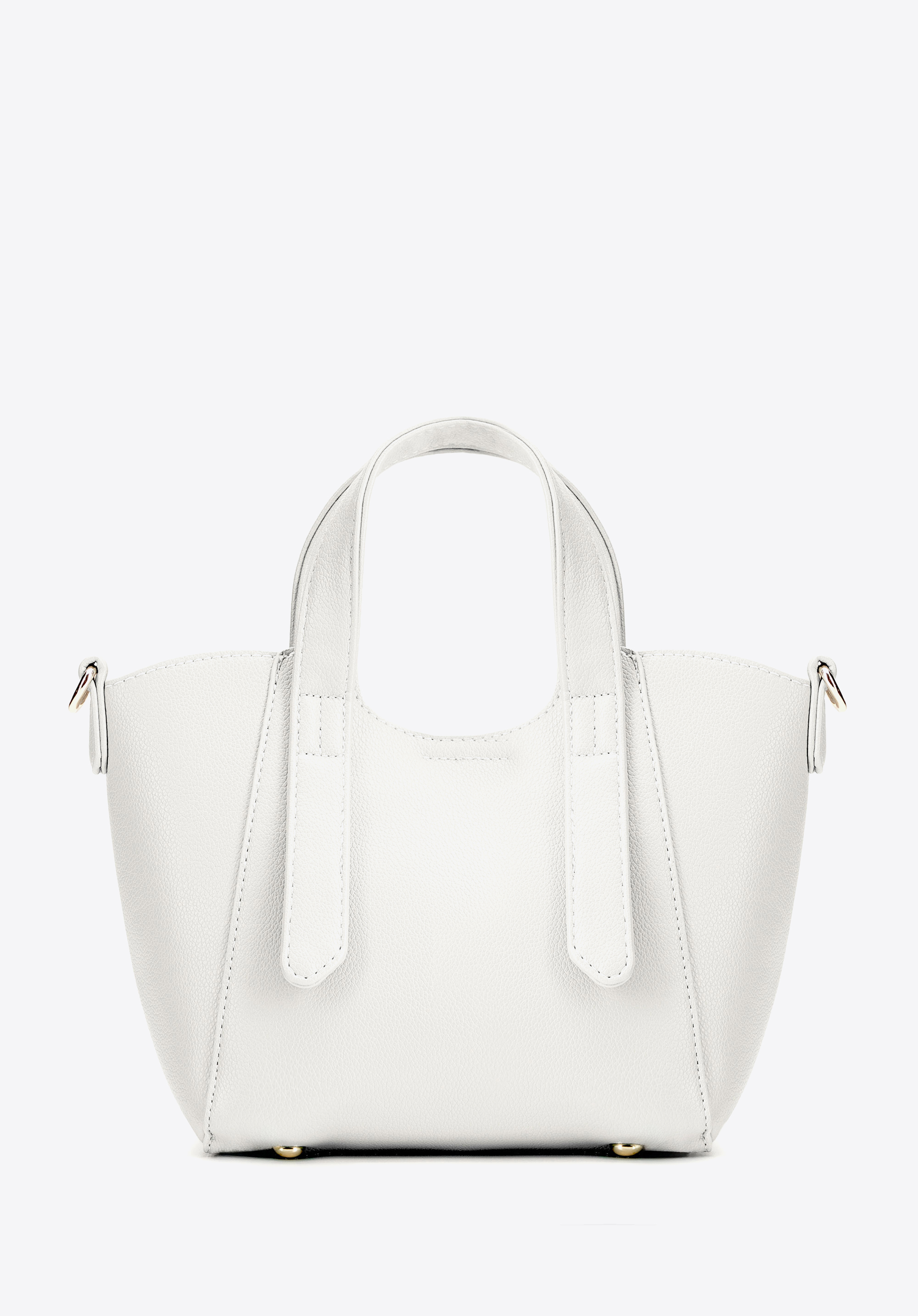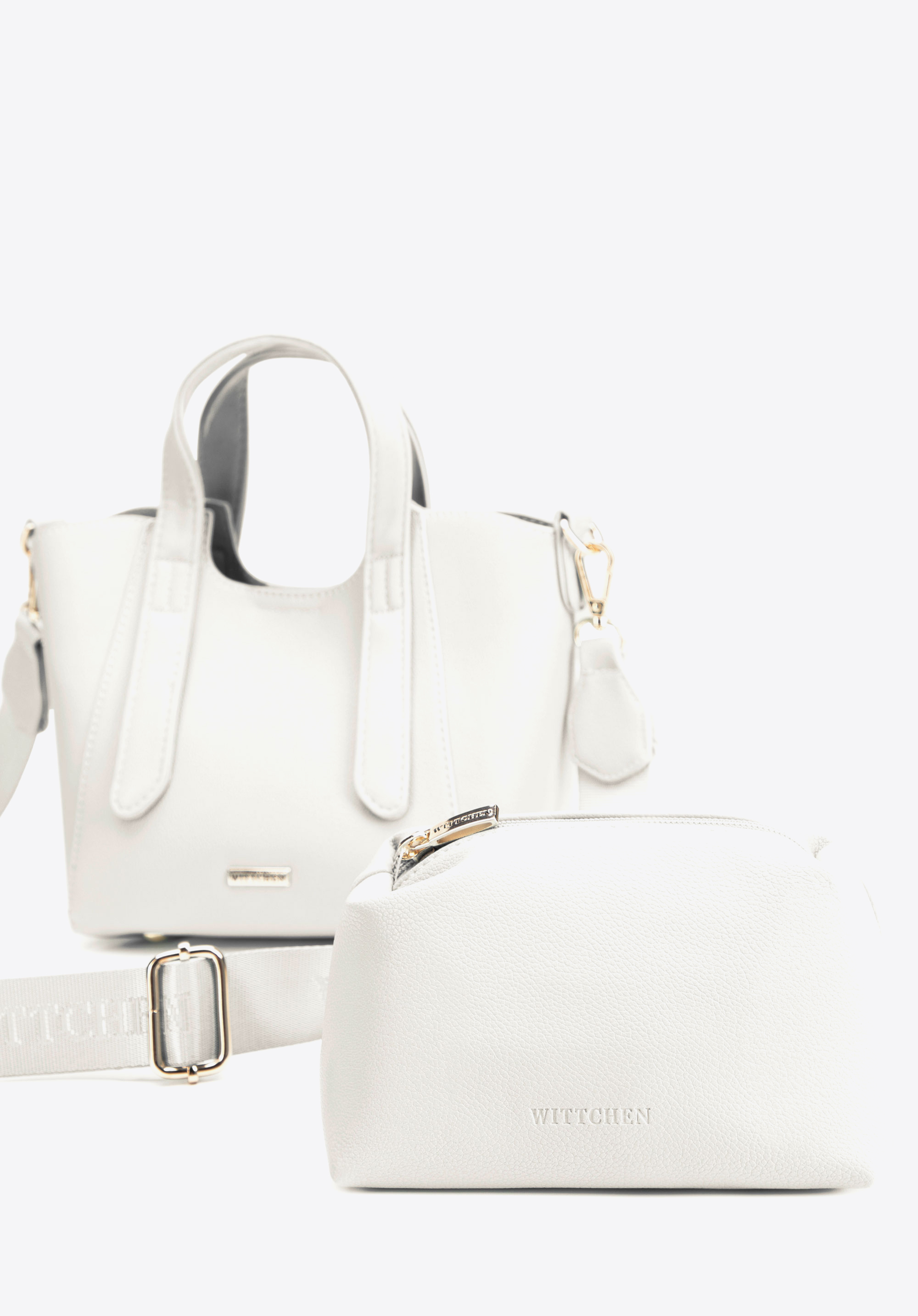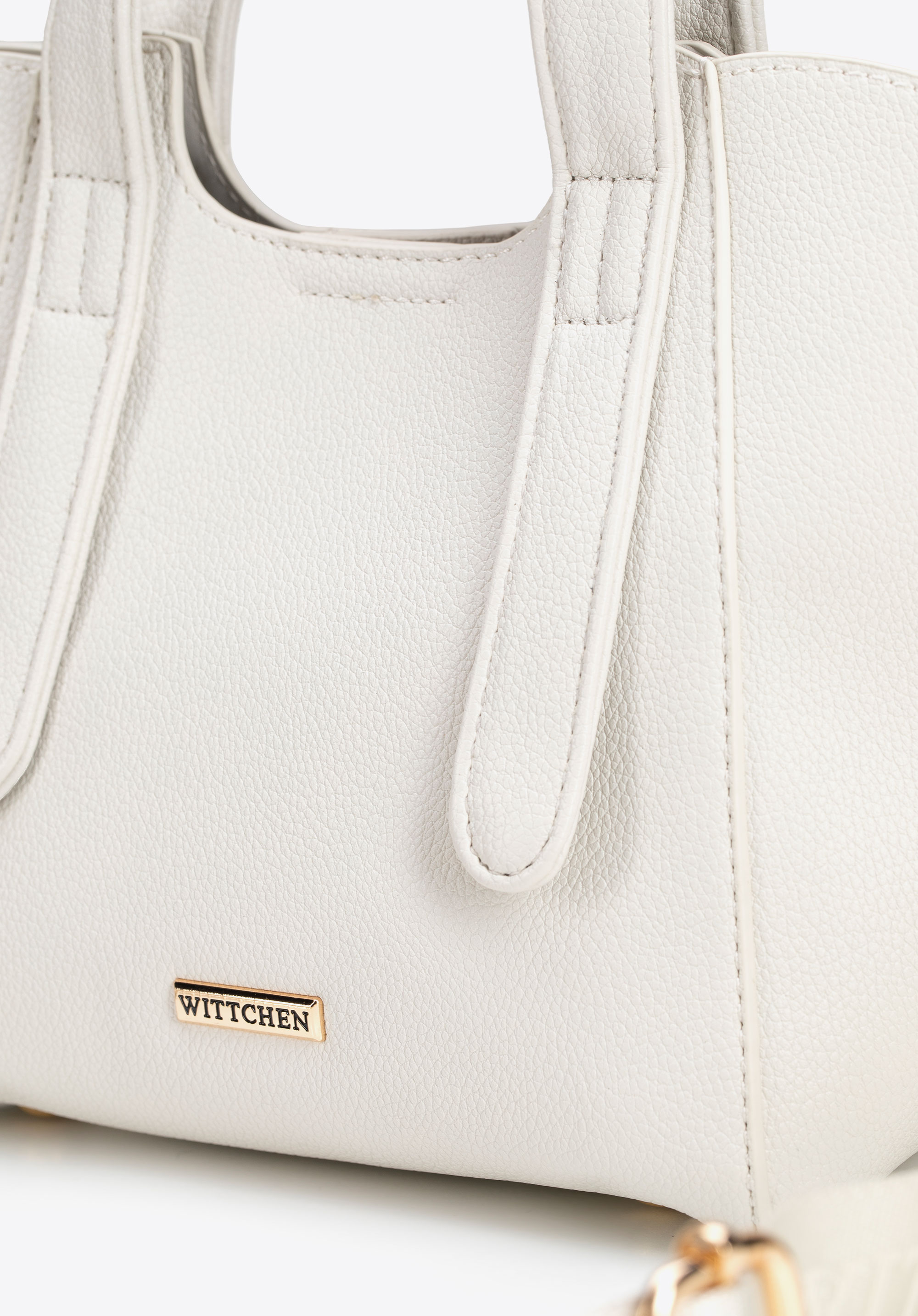 Відкрийте для себе нашу елегантну сумку з екошкіри мінімалістичного дизайну з привабливими деталями. Зручні ручки з декоративними подовжувачами і магнітною застібкою забезпечують легкий доступ всередину. Усередині ви знайдете знімну косметичку з кишенею на блискавці, а регульований знімний ремінь із логотипом забезпечує універсальність варіантів носіння. Компактний розмір робить її ідеальною повсякденною сумкою, у якій помістяться всі необхідні речі.