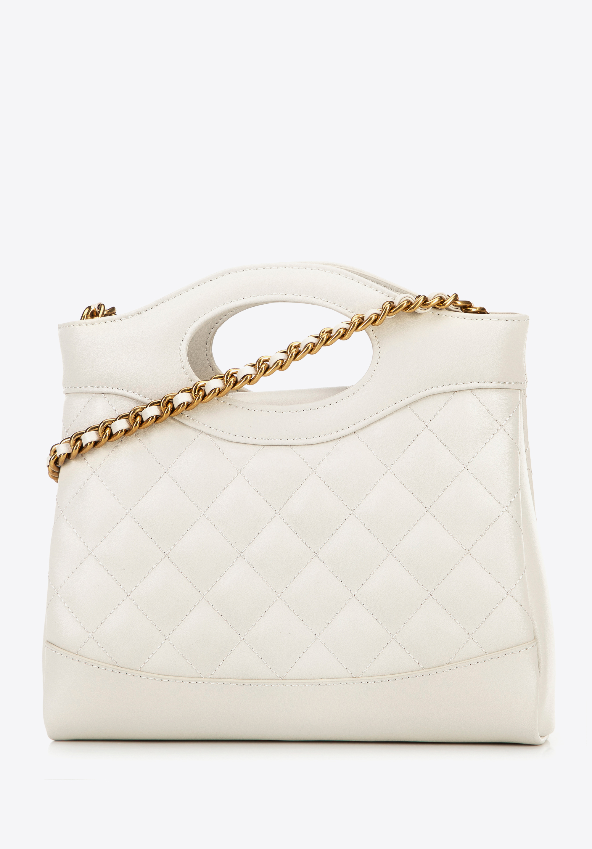 Додайте до свого гардеробу відтінок позачасового стилю за допомогою цієї сумки, яка поєднує класичний дизайн із сучасністю. Ця елегантна сумка виготовлена з натуральної шкіри та має геометричне стьобання з обох сторін для вишуканого вигляду. Жорстка конструкція чудово зберігає форму, а стильна пряжка додає вишуканого вигляду. Довгий ланцюжок і дві ручки дозволяють носити сумку як у руці, так і на плечі, адаптуючи її до випадку та стилю.