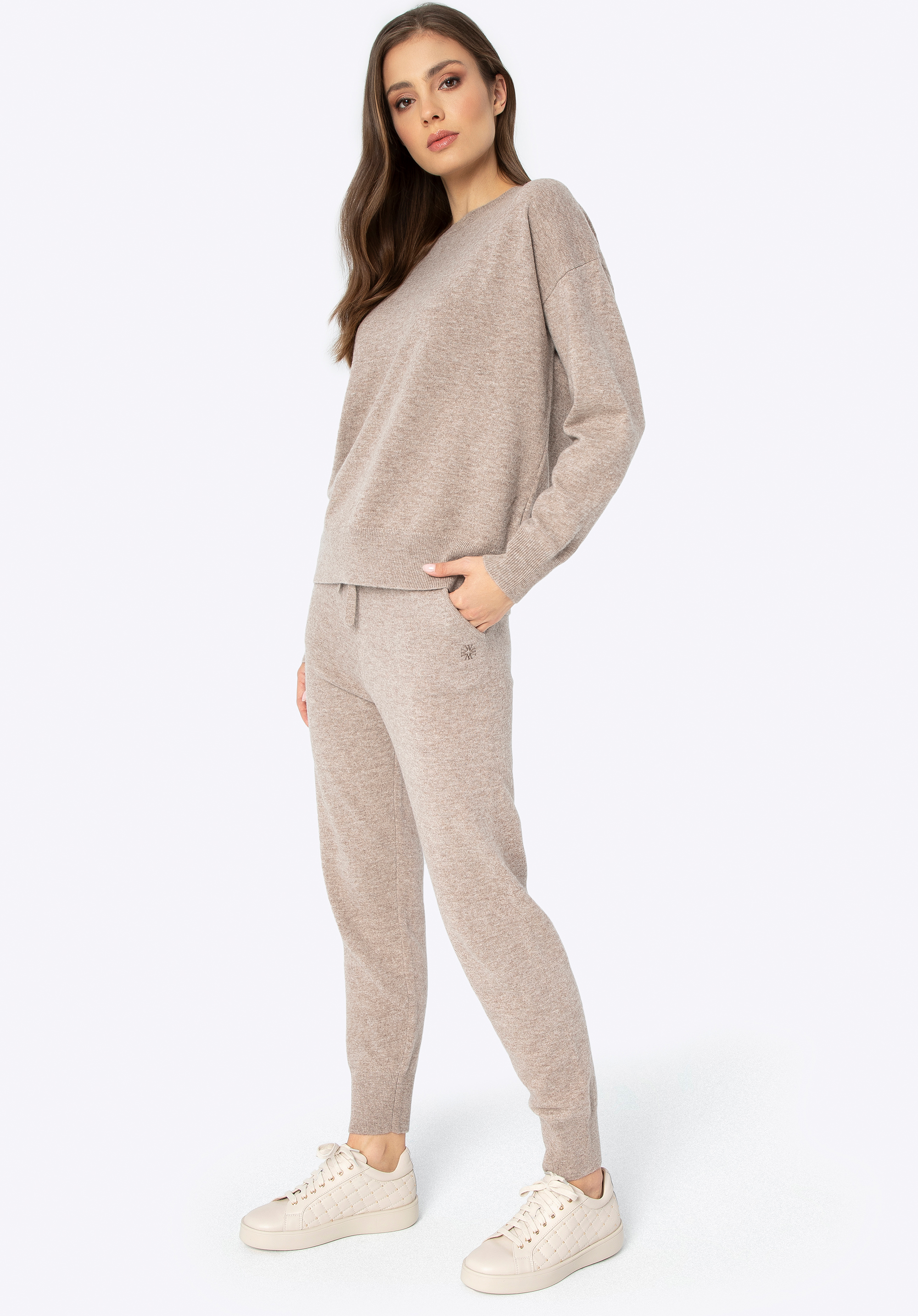 Подбайте про свій комфорт і стиль з нашим розкішним одягом з вовни. Цей унікальний комплект, що складається з м’якого светра та джоггерів, є ідеальним поєднанням елегантності та комфорту. Ніжний вовняний матеріал огорне Вас теплом, а універсальний колір дозволить виглядати модно та стильно в будь-якій ситуації. Незалежно від того, де ви знаходитесь і чим займаєтеся, цей набір забезпечить вам не тільки комфорт, але й неповторний вигляд. Відмінною деталлю є тонка вишита монограма на лівій кишені штанів і правому рукаві светра. Штани, оброблені злегка ребристими манжетами, гарантують ідеальну посадку, а еластична стрічка та шнурок на талії дозволяють регулювати розмір.
