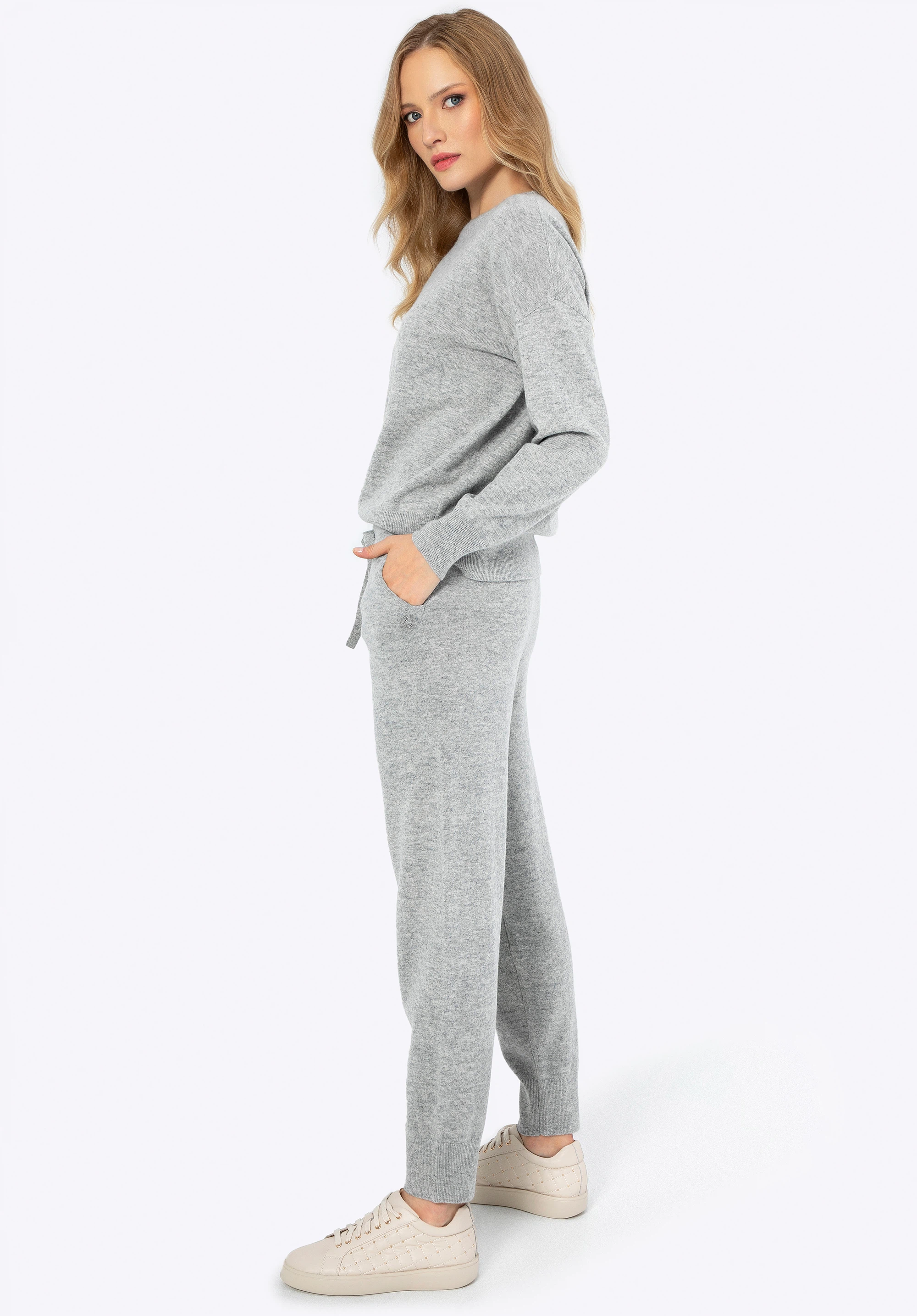 Подбайте про свій комфорт і стиль з нашим розкішним одягом з вовни. Цей унікальний комплект, що складається з м’якого светра та джоггерів, є ідеальним поєднанням елегантності та комфорту. Ніжний вовняний матеріал огорне Вас теплом, а універсальний колір дозволить виглядати модно та стильно в будь-якій ситуації. Незалежно від того, де ви знаходитесь і чим займаєтеся, цей набір забезпечить вам не тільки комфорт, але й неповторний вигляд. Відмінною деталлю є тонка вишита монограма на лівій кишені штанів і правому рукаві светра. Штани, оброблені злегка ребристими манжетами, гарантують ідеальну посадку, а еластична стрічка та шнурок на талії дозволяють регулювати розмір.