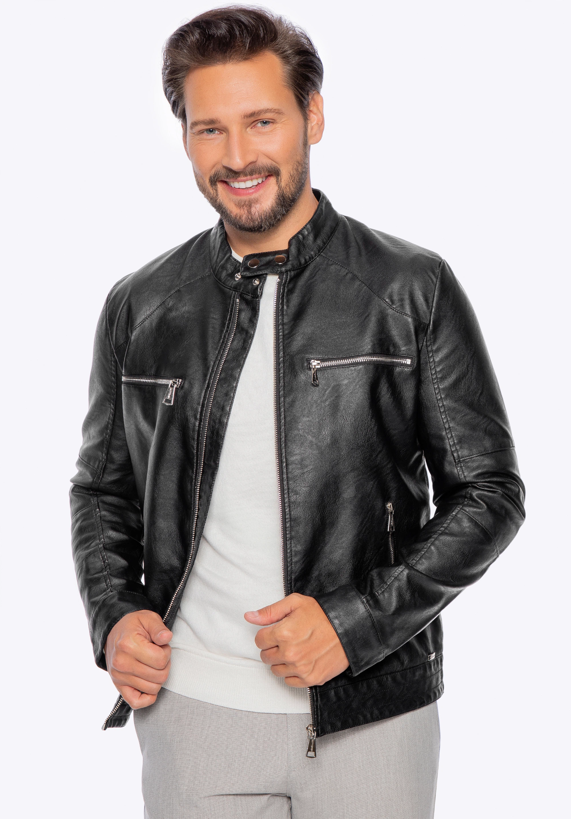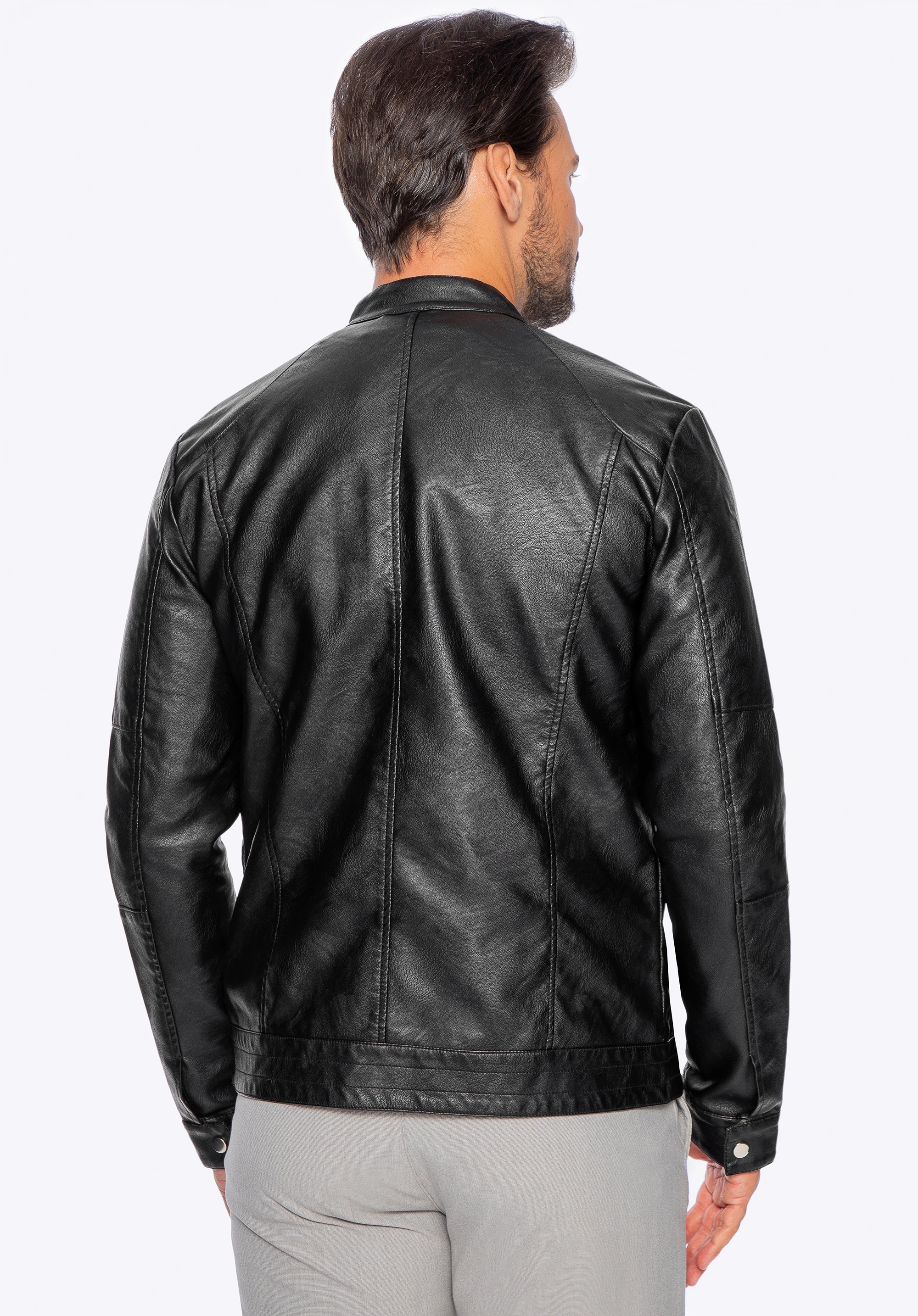 Ця чоловіча куртка вишукано підкреслить ваші повсякденні стилі. Виготовлена з якісної екошкіри, дуже приємна на дотик. Плечі підкреслені діагональною строчкою, а на вирізі є комір-стійка з подвійною застібкою. Глянцеві блискавки додають їй блиску, а численні кишені приховують необхідні дрібниці. Носіть її з елегантним повсякденним одягом - це позачасовий і стильний аксесуар. Проста чоловіча куртка з екошкіри з коміром-стійкою - відмінний вибір для кожного сучасного чоловіка.