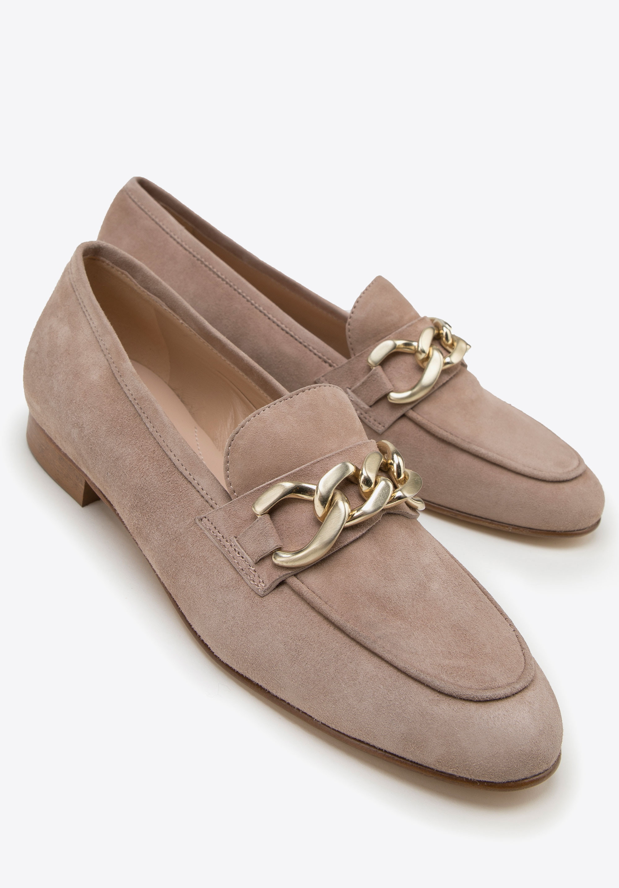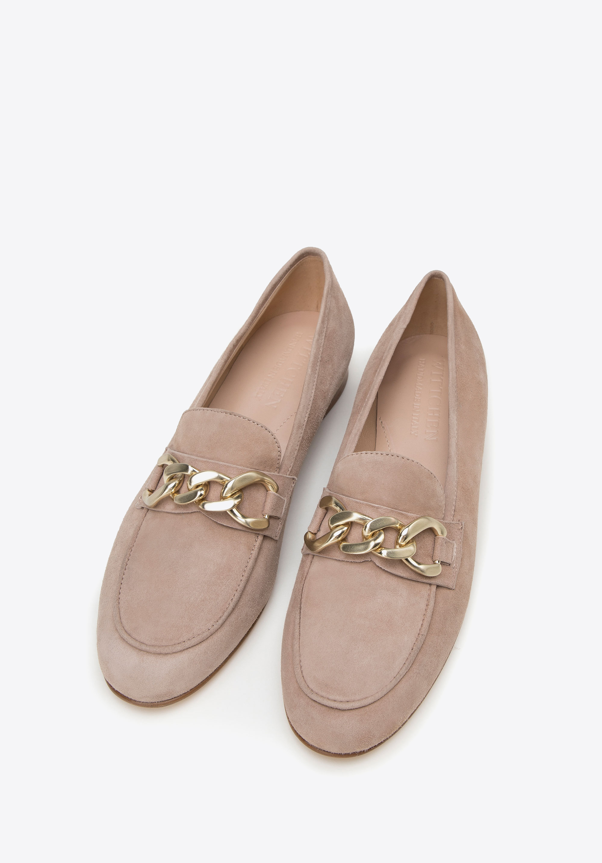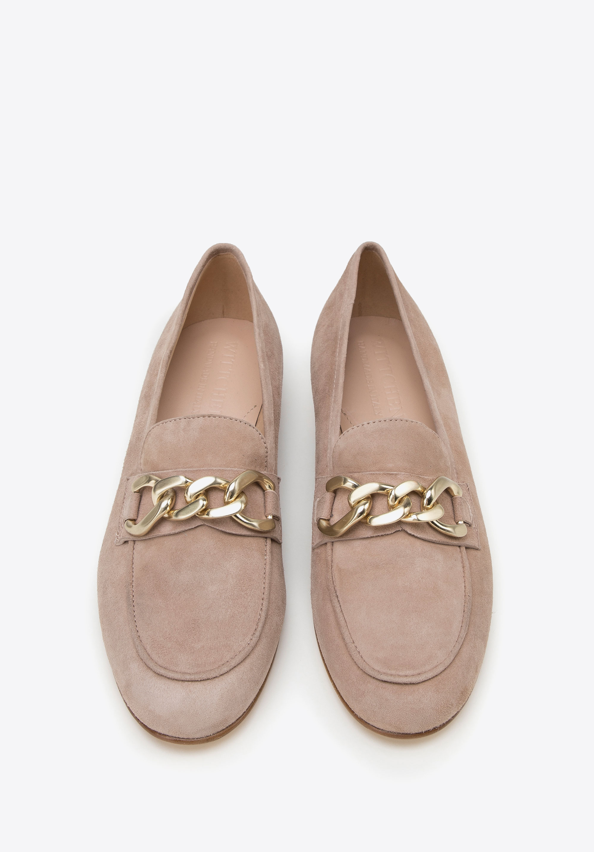 Ці жіночі мокасани - чудовий вибір для повсякденного носіння. Вони мають витончену форму, з характерним обшитим носом і блискучим ланцюжком з товстими ланками. Вони виготовлені з високоякісної замшевої шкіри. Вони досить м''які, легкі і мають шкіряну устілку, яка забезпечить комфорт ваших ніг. Низький каблук додасть кілька сантиметрів до вашого зросту. Ця класична модель чудово виглядатиме як з брюками, так і з сукнею. Прості жіночі замшеві мокасини з ланцюжком - елегантний аксесуар на багато сезонів, який варто мати у своєму гардеробі.