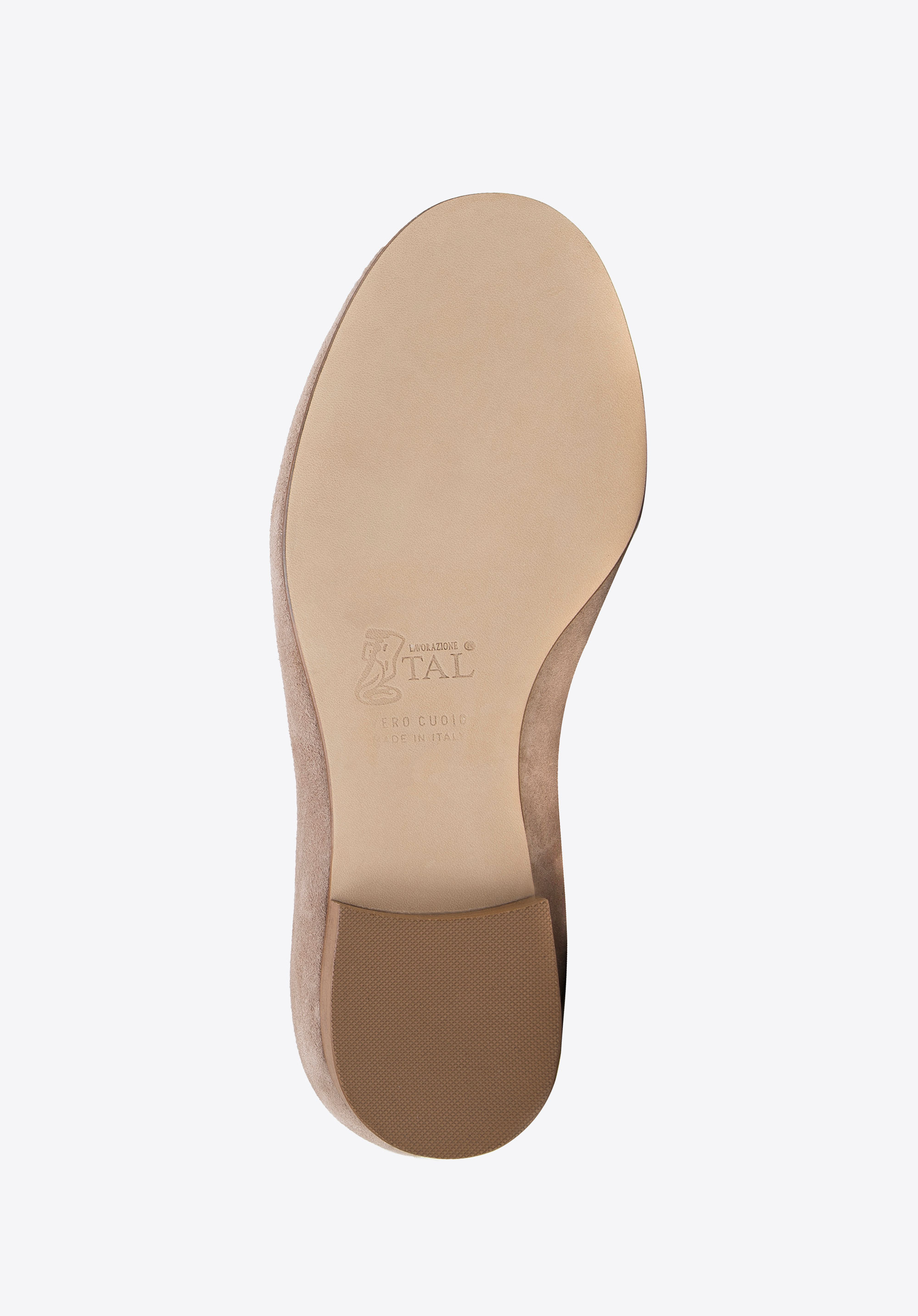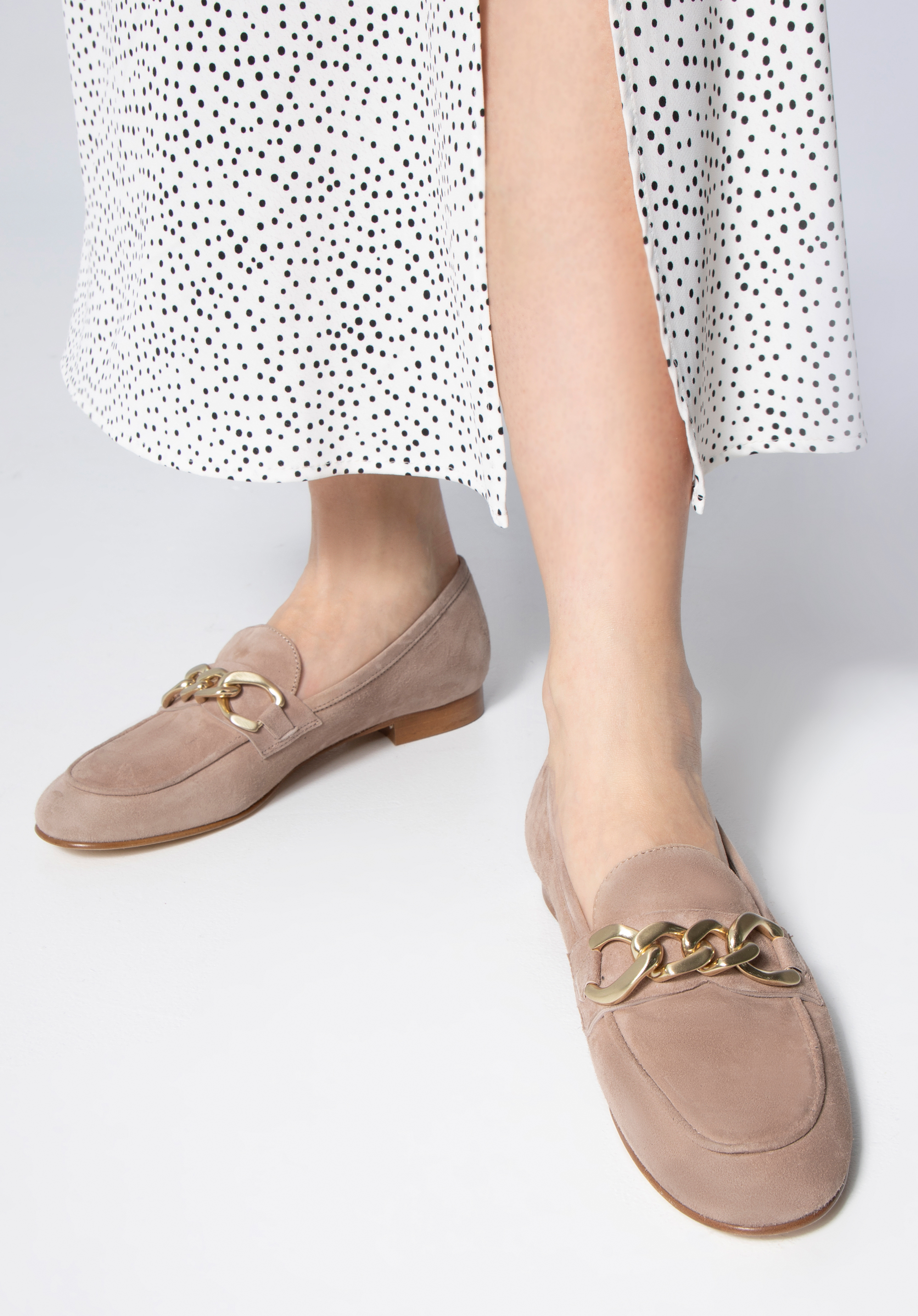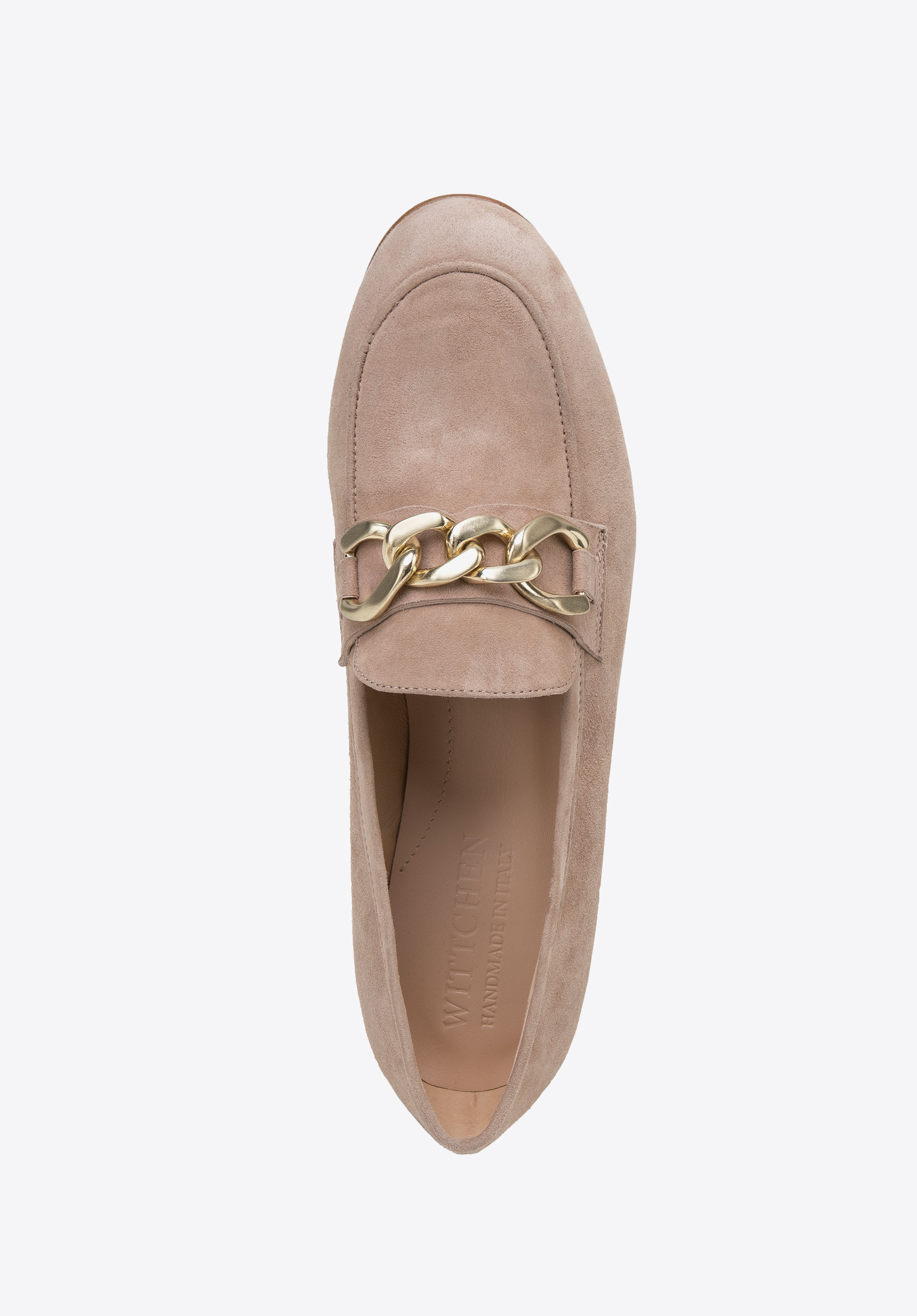 Ці жіночі мокасани - чудовий вибір для повсякденного носіння. Вони мають витончену форму, з характерним обшитим носом і блискучим ланцюжком з товстими ланками. Вони виготовлені з високоякісної замшевої шкіри. Вони досить м''які, легкі і мають шкіряну устілку, яка забезпечить комфорт ваших ніг. Низький каблук додасть кілька сантиметрів до вашого зросту. Ця класична модель чудово виглядатиме як з брюками, так і з сукнею. Прості жіночі замшеві мокасини з ланцюжком - елегантний аксесуар на багато сезонів, який варто мати у своєму гардеробі.